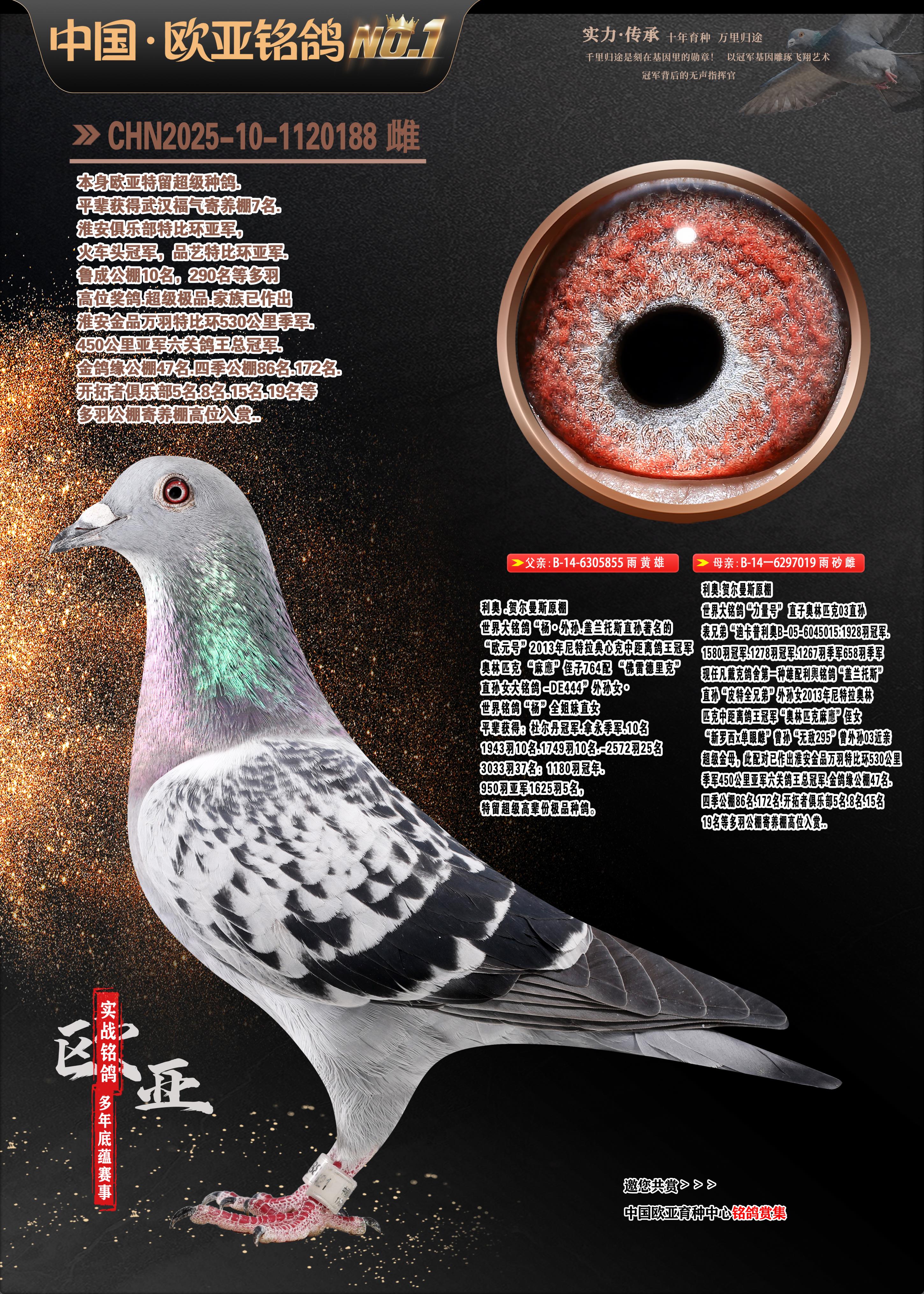 24年秋南京特比环欧亚荣获大团体冠军.小团体冠军551公里大特比13名.14名.16名.19名.20名.21名.24名.26名.27名.28名.42名.52名.54名.57名.65名.66名.68名.70名.71名.72名.74名.76名.80名.82名.83名.84名.85名.86名.90名.92名.110名.116名.121名.122名.128名.131名.158名.161名.164名.165名.166名.172名.174名.177名.182名.195名.196名.201名.205名.208名.210名.216名.253名.269名.275名.276名.294名.296名.299名,,24年秋云南天南铜都公棚决赛415名.天南铜都小棚决赛409名.云南玉活公棚决赛102名.490名.团体32名上笼二羽进二羽,天南铜都大棚506公里决赛445名。热烈祝贺河北省巨鹿县李兰生老师用欧亚泰山号血系连续十一年夺冠军,河北省国家赛冠军.全国季军等多次前十名高位,扬州王军王总用欧亚利奥24年春季获山东翔宇公棚决赛33名盖比53名。南京刘正龙刘总用欧亚盖比获得24年秋山东潍坊国际公棚决赛42名.精英赛30名.三关鸽王71名.决赛86名.加站赛16名.南京市特比环A组鸽王9名.B组鸽王5名.6名.C组鸽王5名.精英赛冠军4名.技能赛A组冠军4名.5名.秦淮区特比环荣获15名.46名.48名.87名。四川西昌徐亮徐总用欧亚利奥获得凉山州聚友决赛177名.第二关亚军双关鸽王19名.三关鸽王105名.云南豪庭公棚决赛603名。热烈祝贺24年四川重庆翔园鸽舍用欧亚泰山号荣获春季400公里冠军.秋季500公里冠军,河北王总用詹森X利奥获得千羽千翔公棚400公里冠军,广东蔡楷焕荣获24年秋爱好者 赛鸽俱乐部三关鸽王季军.一关420公里99名.二关450公里11名.三关520公里32名.单关季军.7名.12名,江西李卫兴荣获贵州红枫公棚8名.共翔俱乐部寄养棚四关综合鸽王30名.一关400公里78名.二关500公里55名.三关520公里37名.四关500公里57名.同父母获公棚18名.雷鸣获得武汉黄浦育翔中心冠军,四川陈文获得四川明鸿俱乐部300公里梦幻2名.3名.4名.9名.10名.13名.14名.15名.31名.34名.40名.41名.42名.43名.69名.71名.72名.73名.74名.94名.95名.97名.98名.99名.419公里决赛荣获总冠军7名.总共归巢9羽,四川徐亮获豪庭决赛603名,山西郑勇获得山西泰鑫公棚决赛255名詹森红狐,热烈祝贺马总获得开尔(飞跃队)决赛9名获奖金1310000万元.第一关52名,天津津福资赛180公里96名.获奖金429543万元,欧亚支持全国鸽友24年秋多人报喜 祝大家取得更好成绩,给欧亚报喜鸽友欧亚决定给每人赠送一羽超级种鸽。欧亚俱乐部特比环多关鸽王成绩:15年秋淮安特比环黑色星期一全会上笼9700多羽,当天无鸽归巢,第二天全会归巢357羽,本舍归巢158羽.前十名八羽.前一百名归巢57羽,16年春季获五关鸽王总冠军,总亚军四名.六名.七名.九名.十名.晶艺俱乐部520公里冠亚季军5名.6名.7名.9名.11名等,火车头冠军.季军6名.8名.9名.10名,16年秋晶艺俱乐部特比环520公里亚军.季军4名.6名.7名.9名,15年春南京白下特比环冠军.亚军.季军6名.7名.8名.9名.10名.指定鸽A B组获得冠军.亚军.季军4名.5名.,17年淮安特比环亚军.4名.5名.7名.8名.10名.六关鸽王总冠军.4名.6名.9名.10名,寄养棚宿迁刘总20羽特比环获冠军.季军.4名.7名.8名.9名等。18年荣获万羽特比环六关鸽王总冠军.总亚军.总季军.6名.8名.十名.单关四羽冠军.二羽亚军.四羽季军.前十名27羽。19年秋万羽特比环六关鸽王总亚军.总季军.5名.8名等,单关二羽冠军.三羽亚军.一羽季军前十名31羽。20年秋淮安市鸽会四关特比环大赛风雨无阻鸽王亚军.鸽王六名,金品俱乐部万羽特比环六关鸽王总冠军,总亚军.四名.五名.六名.七名.八名.十名.前二百名鸽王35羽,单关冠亚季军前十名四十多羽,火车头五关鸽王季军.六名.八名.前二百名鸽王十七羽。20年春荣获淮安五区一市四关鸽王总冠军.亚军.四名.八名.九名。21年秋荣获金品万羽特比环大赛六关鸽王总亚军.总季军.四名.七名.九名.十名.单关冠亚军季军前十名三十多羽。火车头协会鸽王六名.七名.十名.单关前十名十七羽。22年秋荣获鸽王总冠军.总亚军.5名.7名.8名.9名.11名.单关冠亚季军前十名三十多羽,第一关单关前二百名四十多羽,第二关前二百名三十多羽,第三关前二百名四十多羽,第四关前二百名四十多羽,第五关前一百名53羽。23年秋荣获鸽王季军.五名.八名.十名.13名.17名.20名.27名等多羽鸽王.单关前十名二十多羽。公棚.寄养棚部分成绩:16年秋宁夏黄河公棚总冠军电脑戈马力指定通炮冠军,17年送八羽参赛获得鸽王八名进奖四名,支持韩总荣获八名。支持鸽友荣获宁夏中卫公棚决赛总冠军.精英赛冠军,支持18年宁夏黄河公棚决赛冠军詹森X泰山。安徽鼎博寄养棚院内外四关鸽王总冠军.鸽王十七名.三十七名同窝,鸽王39名.42名.58名.67名。18年山东公棚预赛冠军.决赛65名.送八羽进奖五羽.指定获奔驰汽车一辆。支持鸽友获得云南蓝云公棚冠军.盖比X佛卡门。支持鸽友荣获云南银集公棚决赛冠军 詹森427X520血系 速度赛6700羽冠军。17年荣获金马俱乐部寄养棚四关鸽王总冠军.季军.六名.八名.第一关冠军.亚军.季军四名.七名.十一名.金牌教练奖。支持鸽友18年北京费翔公棚预赛九名电脑X桑杰士,支持鸽友荣获陕西威力公棚决赛11名.内蒙古临河寄养棚四关鸽王六名.詹森配泰山,支持河北王总用欧亚詹森427配胡本喜获20年秋开尔青年棚季军。云南东荣公棚16年预赛冠军.决赛77名.17年决赛12名.詹森红狐X泰山,17年平安公棚决赛4名 詹森427。欧亚获得21年金母寄养棚第一关四名.第二关5名.第三关5名.6名.7名.10名.三关鸽王总冠军,四关鸽王14名.十羽鸽王。支持河
