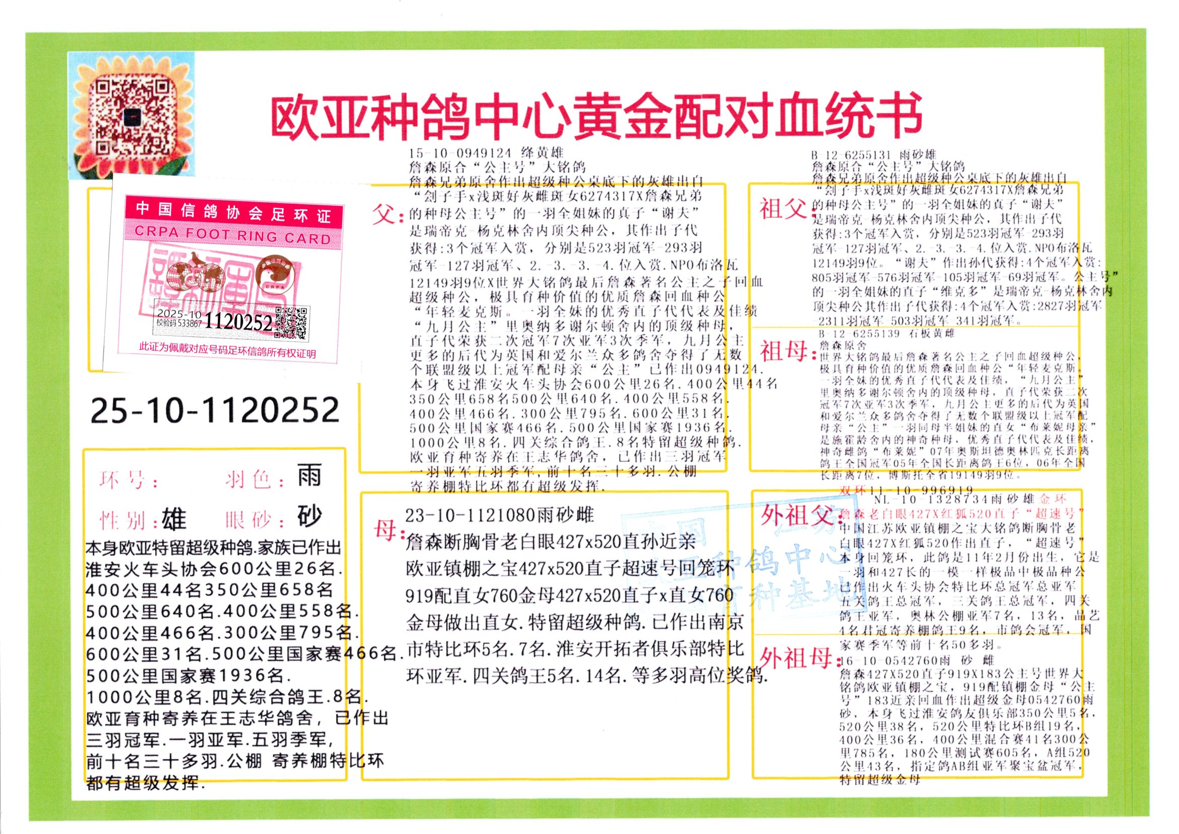 24年秋南京特比环欧亚荣获大团体冠军.小团体冠军551公里大特比13名.14名.16名.19名.20名.21名.24名.26名.27名.28名.42名.52名.54名.57名.65名.66名.68名.70名.71名.72名.74名.76名.80名.82名.83名.84名.85名.86名.90名.92名.110名.116名.121名.122名.128名.131名.158名.161名.164名.165名.166名.172名.174名.177名.182名.195名.196名.201名.205名.208名.210名.216名.253名.269名.275名.276名.294名.296名.299名,,24年秋云南天南铜都公棚决赛415名.天南铜都小棚决赛409名.云南玉活公棚决赛102名.490名.团体32名上笼二羽进二羽,天南铜都大棚506公里决赛445名。热烈祝贺河北省巨鹿县李兰生老师用欧亚泰山号血系连续十一年夺冠军,河北省国家赛冠军.全国季军等多次前十名高位,扬州王军王总用欧亚利奥24年春季获山东翔宇公棚决赛33名盖比53名。南京刘正龙刘总用欧亚盖比获得24年秋山东潍坊国际公棚决赛42名.精英赛30名.三关鸽王71名.决赛86名.加站赛16名.南京市特比环A组鸽王9名.B组鸽王5名.6名.C组鸽王5名.精英赛冠军4名.技能赛A组冠军4名.5名.秦淮区特比环荣获15名.46名.48名.87名。四川西昌徐亮徐总用欧亚利奥获得凉山州聚友决赛177名.第二关亚军双关鸽王19名.三关鸽王105名.云南豪庭公棚决赛603名。热烈祝贺24年四川重庆翔园鸽舍用欧亚泰山号荣获春季400公里冠军.秋季500公里冠军,河北王总用詹森X利奥获得千羽千翔公棚400公里冠军,广东蔡楷焕荣获24年秋爱好者 赛鸽俱乐部三关鸽王季军.一关420公里99名.二关450公里11名.三关520公里32名.单关季军.7名.12名,江西李卫兴荣获贵州红枫公棚8名.共翔俱乐部寄养棚四关综合鸽王30名.一关400公里78名.二关500公里55名.三关520公里37名.四关500公里57名.同父母获公棚18名.雷鸣获得武汉黄浦育翔中心冠军,四川陈文获得四川明鸿俱乐部300公里梦幻2名.3名.4名.9名.10名.13名.14名.15名.31名.34名.40名.41名.42名.43名.69名.71名.72名.73名.74名.94名.95名.97名.98名.99名.419公里决赛荣获总冠军7名.总共归巢9羽,四川徐亮获豪庭决赛603名,山西郑勇获得山西泰鑫公棚决赛255名詹森红狐,热烈祝贺马总获得开尔(飞跃队)决赛9名获奖金1310000万元.第一关52名,天津津福资赛180公里96名.获奖金429543万元,欧亚支持全国鸽友24年秋多人报喜 祝大家取得更好成绩,给欧亚报喜鸽友欧亚决定给每人赠送一羽超级种鸽。欧亚俱乐部特比环多关鸽王成绩:15年秋淮安特比环黑色星期一全会上笼9700多羽,当天无鸽归巢,第二天全会归巢357羽,本舍归巢158羽.前十名八羽.前一百名归巢57羽,16年春季获五关鸽王总冠军,总亚军四名.六名.七名.九名.十名.晶艺俱乐部520公里冠亚季军5名.6名.7名.9名.11名等,火车头冠军.季军6名.8名.9名.10名,16年秋晶艺俱乐部特比环520公里亚军.季军4名.6名.7名.9名,15年春南京白下特比环冠军.亚军.季军6名.7名.8名.9名.10名.指定鸽A B组获得冠军.亚军.季军4名.5名.,17年淮安特比环亚军.4名.5名.7名.8名.10名.六关鸽王总冠军.4名.6名.9名.10名,寄养棚宿迁刘总20羽特比环获冠军.季军.4名.7名.8名.9名等。18年荣获万羽特比环六关鸽王总冠军.总亚军.总季军.6名.8名.十名.单关四羽冠军.二羽亚军.四羽季军.前十名27羽。19年秋万羽特比环六关鸽王总亚军.总季军.5名.8名等,单关二羽冠军.三羽亚军.一羽季军前十名31羽。20年秋淮安市鸽会四关特比环大赛风雨无阻鸽王亚军.鸽王六名,金品俱乐部万羽特比环六关鸽王总冠军,总亚军.四名.五名.六名.七名.八名.十名.前二百名鸽王35羽,单关冠亚季军前十名四十多羽,火车头五关鸽王季军.六名.八名.前二百名鸽王十七羽。20年春荣获淮安五区一市四关鸽王总冠军.亚军.四名.八名.九名。21年秋荣获金品万羽特比环大赛六关鸽王总亚军.总季军.四名.七名.九名.十名.单关冠亚军季军前十名三十多羽。火车头协会鸽王六名.七名.十名.单关前十名十七羽。22年秋荣获鸽王总冠军.总亚军.5名.7名.8名.9名.11名.单关冠亚季军前十名三十多羽,第一关单关前二百名四十多羽,第二关前二百名三十多羽,第三关前二百名四十多羽,第四关前二百名四十多羽,第五关前一百名53羽。23年秋荣获鸽王季军.五名.八名.十名.13名.17名.20名.27名等多羽鸽王.单关前十名二十多羽。公棚.寄养棚部分成绩:16年秋宁夏黄河公棚总冠军电脑戈马力指定通炮冠军,17年送八羽参赛获得鸽王八名进奖四名,支持韩总荣获八名。支持鸽友荣获宁夏中卫公棚决赛总冠军.精英赛冠军,支持18年宁夏黄河公棚决赛冠军詹森X泰山。安徽鼎博寄养棚院内外四关鸽王总冠军.鸽王十七名.三十七名同窝,鸽王39名.42名.58名.67名。18年山东公棚预赛冠军.决赛65名.送八羽进奖五羽.指定获奔驰汽车一辆。支持鸽友获得云南蓝云公棚冠军.盖比X佛卡门。支持鸽友荣获云南银集公棚决赛冠军 詹森427X520血系 速度赛6700羽冠军。17年荣获金马俱乐部寄养棚四关鸽王总冠军.季军.六名.八名.第一关冠军.亚军.季军四名.七名.十一名.金牌教练奖。支持鸽友18年北京费翔公棚预赛九名电脑X桑杰士,支持鸽友荣获陕西威力公棚决赛11名.内蒙古临河寄养棚四关鸽王六名.詹森配泰山,支持河北王总用欧亚詹森427配胡本喜获20年秋开尔青年棚季军。云南东荣公棚16年预赛冠军.决赛77名.17年决赛12名.詹森红狐X泰山,17年平安公棚决赛4名 詹森427。欧亚获得21年金母寄养棚第一关四名.第二关5名.第三关5名.6名.7名.10名.三关鸽王总冠军,四关鸽王14名.十羽鸽王。支持河