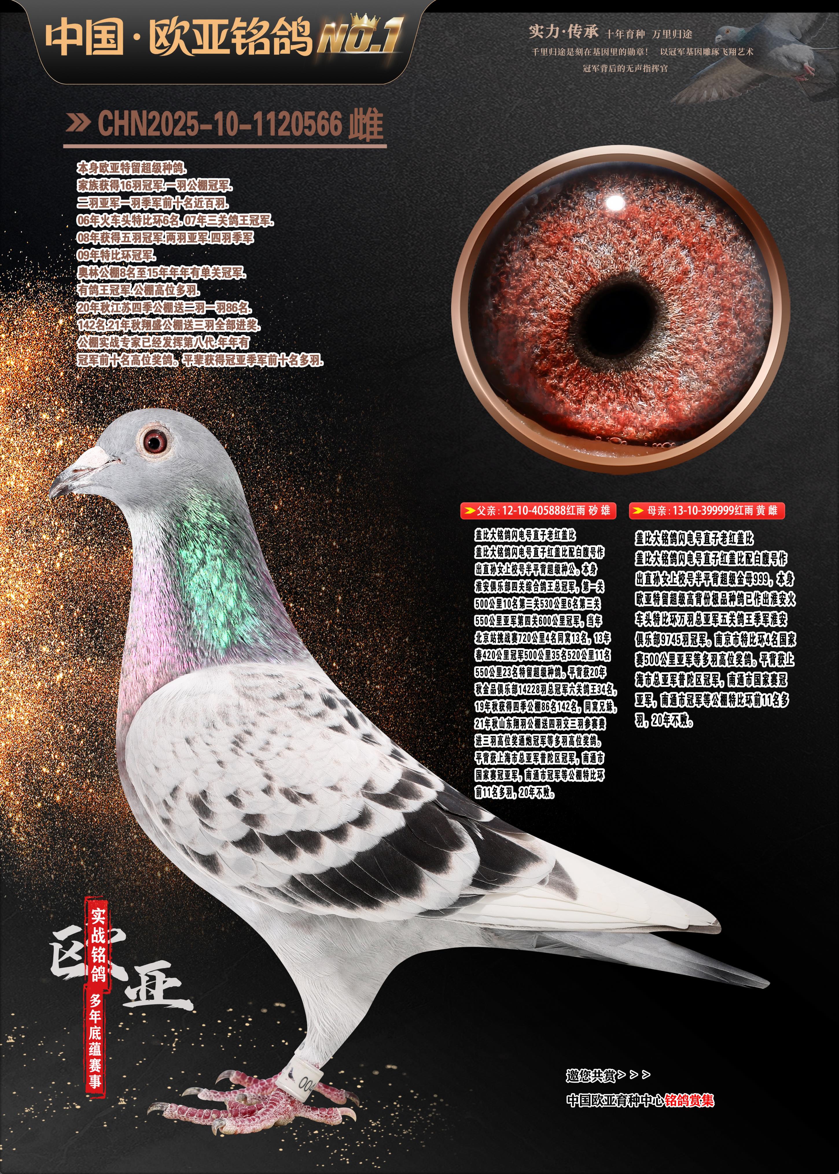 24年秋南京特比环欧亚荣获大团体冠军.小团体冠军551公里大特比13名.14名.16名.19名.20名.21名.24名.26名.27名.28名.42名.52名.54名.57名.65名.66名.68名.70名.71名.72名.74名.76名.80名.82名.83名.84名.85名.86名.90名.92名.110名.116名.121名.122名.128名.131名.158名.161名.164名.165名.166名.172名.174名.177名.182名.195名.196名.201名.205名.208名.210名.216名.253名.269名.275名.276名.294名.296名.299名,,24年秋云南天南铜都公棚决赛415名.天南铜都小棚决赛409名.云南玉活公棚决赛102名.490名.团体32名上笼二羽进二羽,天南铜都大棚506公里决赛445名。热烈祝贺河北省巨鹿县李兰生老师用欧亚泰山号血系连续十一年夺冠军,河北省国家赛冠军.全国季军等多次前十名高位,扬州王军王总用欧亚利奥24年春季获山东翔宇公棚决赛33名盖比53名。南京刘正龙刘总用欧亚盖比获得24年秋山东潍坊国际公棚决赛42名.精英赛30名.三关鸽王71名.决赛86名.加站赛16名.南京市特比环A组鸽王9名.B组鸽王5名.6名.C组鸽王5名.精英赛冠军4名.技能赛A组冠军4名.5名.秦淮区特比环荣获15名.46名.48名.87名。四川西昌徐亮徐总用欧亚利奥获得凉山州聚友决赛177名.第二关亚军双关鸽王19名.三关鸽王105名.云南豪庭公棚决赛603名。热烈祝贺24年四川重庆翔园鸽舍用欧亚泰山号荣获春季400公里冠军.秋季500公里冠军,河北王总用詹森X利奥获得千羽千翔公棚400公里冠军,广东蔡楷焕荣获24年秋爱好者 赛鸽俱乐部三关鸽王季军.一关420公里99名.二关450公里11名.三关520公里32名.单关季军.7名.12名,江西李卫兴荣获贵州红枫公棚8名.共翔俱乐部寄养棚四关综合鸽王30名.一关400公里78名.二关500公里55名.三关520公里37名.四关500公里57名.同父母获公棚18名.雷鸣获得武汉黄浦育翔中心冠军,四川陈文获得四川明鸿俱乐部300公里梦幻2名.3名.4名.9名.10名.13名.14名.15名.31名.34名.40名.41名.42名.43名.69名.71名.72名.73名.74名.94名.95名.97名.98名.99名.419公里决赛荣获总冠军7名.总共归巢9羽,四川徐亮获豪庭决赛603名,山西郑勇获得山西泰鑫公棚决赛255名詹森红狐,热烈祝贺马总获得开尔(飞跃队)决赛9名获奖金1310000万元.第一关52名,天津津福资赛180公里96名.获奖金429543万元,欧亚支持全国鸽友24年秋多人报喜 祝大家取得更好成绩,给欧亚报喜鸽友欧亚决定给每人赠送一羽超级种鸽。欧亚俱乐部特比环多关鸽王成绩:15年秋淮安特比环黑色星期一全会上笼9700多羽,当天无鸽归巢,第二天全会归巢357羽,本舍归巢158羽.前十名八羽.前一百名归巢57羽,16年春季获五关鸽王总冠军,总亚军四名.六名.七名.九名.十名.晶艺俱乐部520公里冠亚季军5名.6名.7名.9名.11名等,火车头冠军.季军6名.8名.9名.10名,16年秋晶艺俱乐部特比环520公里亚军.季军4名.6名.7名.9名,15年春南京白下特比环冠军.亚军.季军6名.7名.8名.9名.10名.指定鸽A B组获得冠军.亚军.季军4名.5名.,17年淮安特比环亚军.4名.5名.7名.8名.10名.六关鸽王总冠军.4名.6名.9名.10名,寄养棚宿迁刘总20羽特比环获冠军.季军.4名.7名.8名.9名等。18年荣获万羽特比环六关鸽王总冠军.总亚军.总季军.6名.8名.十名.单关四羽冠军.二羽亚军.四羽季军.前十名27羽。19年秋万羽特比环六关鸽王总亚军.总季军.5名.8名等,单关二羽冠军.三羽亚军.一羽季军前十名31羽。20年秋淮安市鸽会四关特比环大赛风雨无阻鸽王亚军.鸽王六名,金品俱乐部万羽特比环六关鸽王总冠军,总亚军.四名.五名.六名.七名.八名.十名.前二百名鸽王35羽,单关冠亚季军前十名四十多羽,火车头五关鸽王季军.六名.八名.前二百名鸽王十七羽。20年春荣获淮安五区一市四关鸽王总冠军.亚军.四名.八名.九名。21年秋荣获金品万羽特比环大赛六关鸽王总亚军.总季军.四名.七名.九名.十名.单关冠亚军季军前十名三十多羽。火车头协会鸽王六名.七名.十名.单关前十名十七羽。22年秋荣获鸽王总冠军.总亚军.5名.7名.8名.9名.11名.单关冠亚季军前十名三十多羽,第一关单关前二百名四十多羽,第二关前二百名三十多羽,第三关前二百名四十多羽,第四关前二百名四十多羽,第五关前一百名53羽。23年秋荣获鸽王季军.五名.八名.十名.13名.17名.20名.27名等多羽鸽王.单关前十名二十多羽。公棚.寄养棚部分成绩:16年秋宁夏黄河公棚总冠军电脑戈马力指定通炮冠军,17年送八羽参赛获得鸽王八名进奖四名,支持韩总荣获八名。支持鸽友荣获宁夏中卫公棚决赛总冠军.精英赛冠军,支持18年宁夏黄河公棚决赛冠军詹森X泰山。安徽鼎博寄养棚院内外四关鸽王总冠军.鸽王十七名.三十七名同窝,鸽王39名.42名.58名.67名。18年山东公棚预赛冠军.决赛65名.送八羽进奖五羽.指定获奔驰汽车一辆。支持鸽友获得云南蓝云公棚冠军.盖比X佛卡门。支持鸽友荣获云南银集公棚决赛冠军 詹森427X520血系 速度赛6700羽冠军。17年荣获金马俱乐部寄养棚四关鸽王总冠军.季军.六名.八名.第一关冠军.亚军.季军四名.七名.十一名.金牌教练奖。支持鸽友18年北京费翔公棚预赛九名电脑X桑杰士,支持鸽友荣获陕西威力公棚决赛11名.内蒙古临河寄养棚四关鸽王六名.詹森配泰山,支持河北王总用欧亚詹森427配胡本喜获20年秋开尔青年棚季军。云南东荣公棚16年预赛冠军.决赛77名.17年决赛12名.詹森红狐X泰山,17年平安公棚决赛4名 詹森427。欧亚获得21年金母寄养棚第一关四名.第二关5名.第三关5名.6名.7名.10名.三关鸽王总冠军,四关鸽王14名.十羽鸽王。支持河