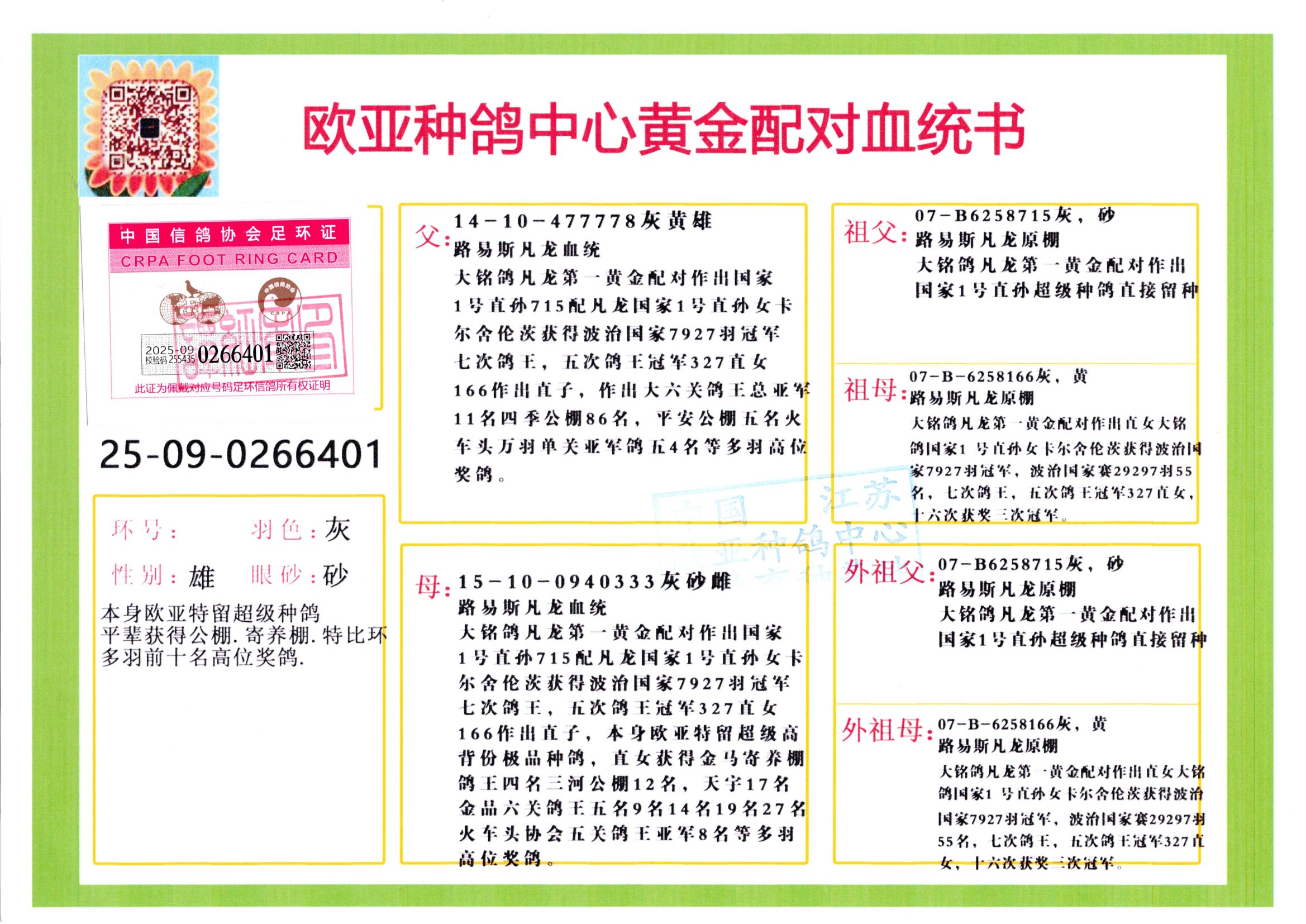 24年秋南京特比环欧亚荣获大团体冠军.小团体冠军551公里大特比13名.14名.16名.19名.20名.21名.24名.26名.27名.28名.42名.52名.54名.57名.65名.66名.68名.70名.71名.72名.74名.76名.80名.82名.83名.84名.85名.86名.90名.92名.110名.116名.121名.122名.128名.131名.158名.161名.164名.165名.166名.172名.174名.177名.182名.195名.196名.201名.205名.208名.210名.216名.253名.269名.275名.276名.294名.296名.299名,,24年秋云南天南铜都公棚决赛415名.天南铜都小棚决赛409名.云南玉活公棚决赛102名.490名.团体32名上笼二羽进二羽,天南铜都大棚506公里决赛445名。热烈祝贺河北省巨鹿县李兰生老师用欧亚泰山号血系连续十一年夺冠军,河北省国家赛冠军.全国季军等多次前十名高位,扬州王军王总用欧亚利奥24年春季获山东翔宇公棚决赛33名盖比53名。南京刘正龙刘总用欧亚盖比获得24年秋山东潍坊国际公棚决赛42名.精英赛30名.三关鸽王71名.决赛86名.加站赛16名.南京市特比环A组鸽王9名.B组鸽王5名.6名.C组鸽王5名.精英赛冠军4名.技能赛A组冠军4名.5名.秦淮区特比环荣获15名.46名.48名.87名。四川西昌徐亮徐总用欧亚利奥获得凉山州聚友决赛177名.第二关亚军双关鸽王19名.三关鸽王105名.云南豪庭公棚决赛603名。热烈祝贺24年四川重庆翔园鸽舍用欧亚泰山号荣获春季400公里冠军.秋季500公里冠军,河北王总用詹森X利奥获得千羽千翔公棚400公里冠军,广东蔡楷焕荣获24年秋爱好者 赛鸽俱乐部三关鸽王季军.一关420公里99名.二关450公里11名.三关520公里32名.单关季军.7名.12名,江西李卫兴荣获贵州红枫公棚8名.共翔俱乐部寄养棚四关综合鸽王30名.一关400公里78名.二关500公里55名.三关520公里37名.四关500公里57名.同父母获公棚18名.雷鸣获得武汉黄浦育翔中心冠军,四川陈文获得四川明鸿俱乐部300公里梦幻2名.3名.4名.9名.10名.13名.14名.15名.31名.34名.40名.41名.42名.43名.69名.71名.72名.73名.74名.94名.95名.97名.98名.99名.419公里决赛荣获总冠军7名.总共归巢9羽,四川徐亮获豪庭决赛603名,山西郑勇获得山西泰鑫公棚决赛255名詹森红狐,热烈祝贺马总获得开尔(飞跃队)决赛9名获奖金1310000万元.第一关52名,天津津福资赛180公里96名.获奖金429543万元,欧亚支持全国鸽友24年秋多人报喜 祝大家取得更好成绩,给欧亚报喜鸽友欧亚决定给每人赠送一羽超级种鸽。欧亚俱乐部特比环多关鸽王成绩:15年秋淮安特比环黑色星期一全会上笼9700多羽,当天无鸽归巢,第二天全会归巢357羽,本舍归巢158羽.前十名八羽.前一百名归巢57羽,16年春季获五关鸽王总冠军,总亚军四名.六名.七名.九名.十名.晶艺俱乐部520公里冠亚季军5名.6名.7名.9名.11名等,火车头冠军.季军6名.8名.9名.10名,16年秋晶艺俱乐部特比环520公里亚军.季军4名.6名.7名.9名,15年春南京白下特比环冠军.亚军.季军6名.7名.8名.9名.10名.指定鸽A B组获得冠军.亚军.季军4名.5名.,17年淮安特比环亚军.4名.5名.7名.8名.10名.六关鸽王总冠军.4名.6名.9名.10名,寄养棚宿迁刘总20羽特比环获冠军.季军.4名.7名.8名.9名等。18年荣获万羽特比环六关鸽王总冠军.总亚军.总季军.6名.8名.十名.单关四羽冠军.二羽亚军.四羽季军.前十名27羽。19年秋万羽特比环六关鸽王总亚军.总季军.5名.8名等,单关二羽冠军.三羽亚军.一羽季军前十名31羽。20年秋淮安市鸽会四关特比环大赛风雨无阻鸽王亚军.鸽王六名,金品俱乐部万羽特比环六关鸽王总冠军,总亚军.四名.五名.六名.七名.八名.十名.前二百名鸽王35羽,单关冠亚季军前十名四十多羽,火车头五关鸽王季军.六名.八名.前二百名鸽王十七羽。20年春荣获淮安五区一市四关鸽王总冠军.亚军.四名.八名.九名。21年秋荣获金品万羽特比环大赛六关鸽王总亚军.总季军.四名.七名.九名.十名.单关冠亚军季军前十名三十多羽。火车头协会鸽王六名.七名.十名.单关前十名十七羽。22年秋荣获鸽王总冠军.总亚军.5名.7名.8名.9名.11名.单关冠亚季军前十名三十多羽,第一关单关前二百名四十多羽,第二关前二百名三十多羽,第三关前二百名四十多羽,第四关前二百名四十多羽,第五关前一百名53羽。23年秋荣获鸽王季军.五名.八名.十名.13名.17名.20名.27名等多羽鸽王.单关前十名二十多羽。公棚.寄养棚部分成绩:16年秋宁夏黄河公棚总冠军电脑戈马力指定通炮冠军,17年送八羽参赛获得鸽王八名进奖四名,支持韩总荣获八名。支持鸽友荣获宁夏中卫公棚决赛总冠军.精英赛冠军,支持18年宁夏黄河公棚决赛冠军詹森X泰山。安徽鼎博寄养棚院内外四关鸽王总冠军.鸽王十七名.三十七名同窝,鸽王39名.42名.58名.67名。18年山东公棚预赛冠军.决赛65名.送八羽进奖五羽.指定获奔驰汽车一辆。支持鸽友获得云南蓝云公棚冠军.盖比X佛卡门。支持鸽友荣获云南银集公棚决赛冠军 詹森427X520血系 速度赛6700羽冠军。17年荣获金马俱乐部寄养棚四关鸽王总冠军.季军.六名.八名.第一关冠军.亚军.季军四名.七名.十一名.金牌教练奖。支持鸽友18年北京费翔公棚预赛九名电脑X桑杰士,支持鸽友荣获陕西威力公棚决赛11名.内蒙古临河寄养棚四关鸽王六名.詹森配泰山,支持河北王总用欧亚詹森427配胡本喜获20年秋开尔青年棚季军。云南东荣公棚16年预赛冠军.决赛77名.17年决赛12名.詹森红狐X泰山,17年平安公棚决赛4名 詹森427。欧亚获得21年金母寄养棚第一关四名.第二关5名.第三关5名.6名.7名.10名.三关鸽王总冠军,四关鸽王14名.十羽鸽王。支持河