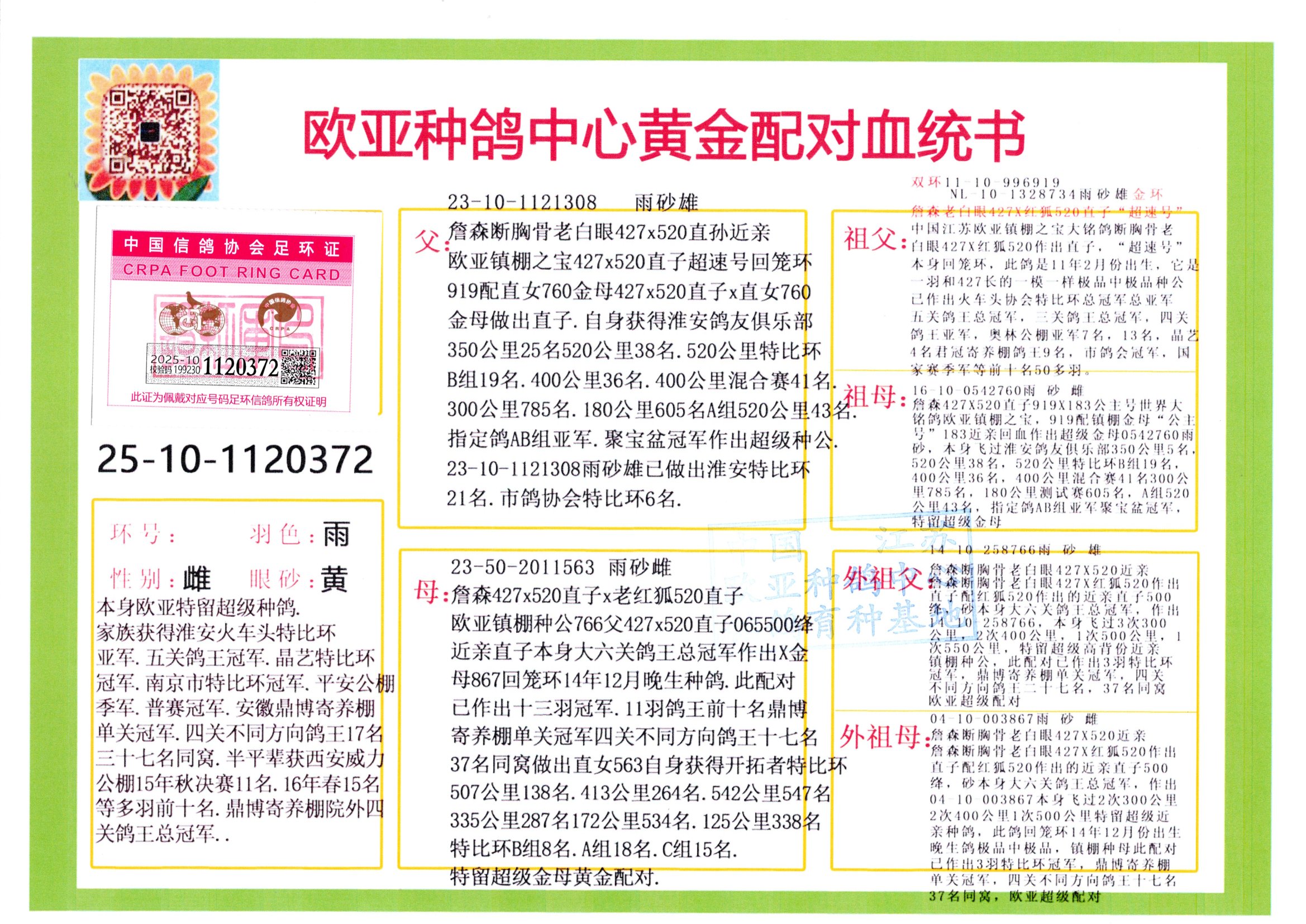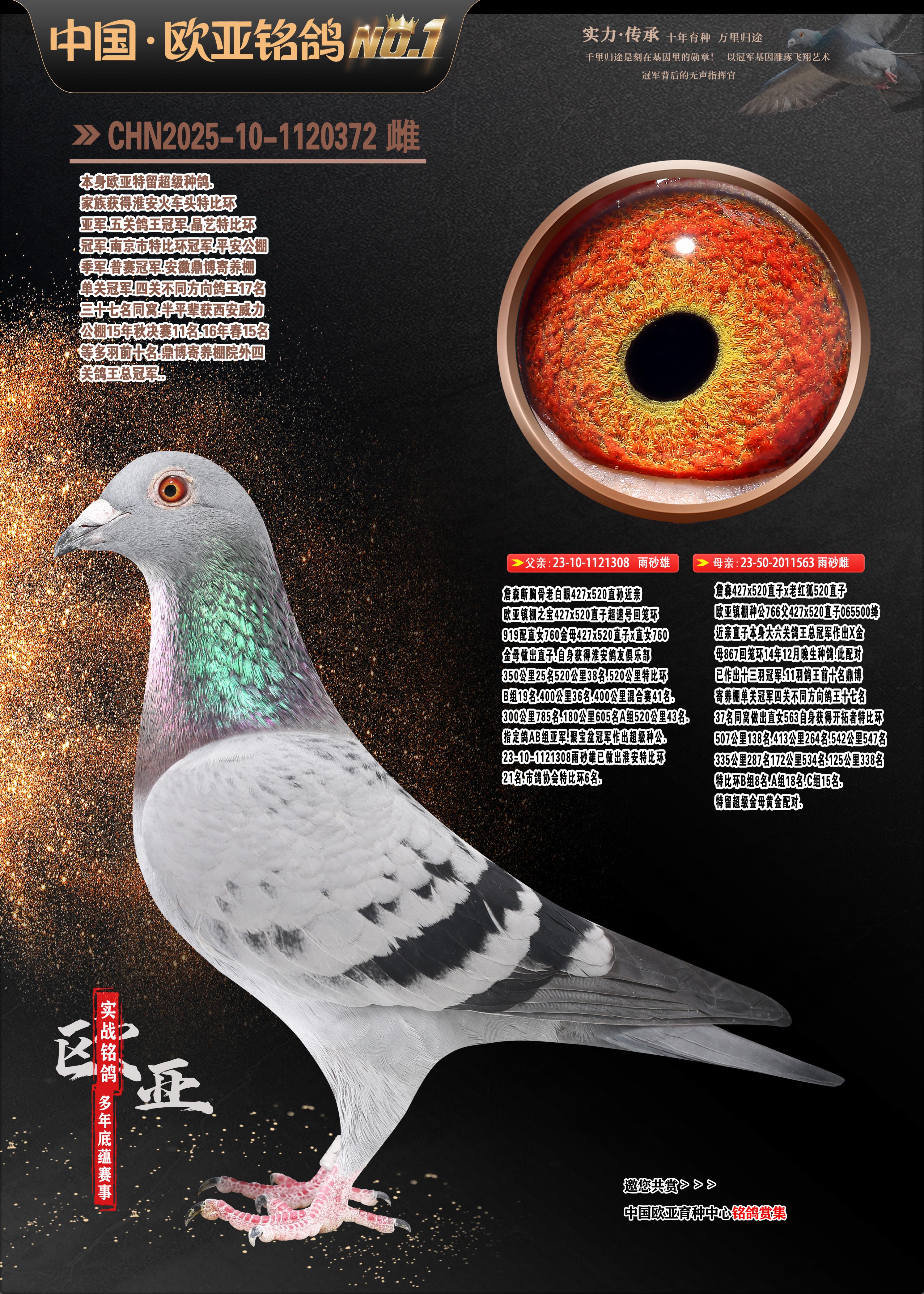 24年秋南京特比环欧亚荣获大团体冠军.小团体冠军551公里大特比13名.14名.16名.19名.20名.21名.24名.26名.27名.28名.42名.52名.54名.57名.65名.66名.68名.70名.71名.72名.74名.76名.80名.82名.83名.84名.85名.86名.90名.92名.110名.116名.121名.122名.128名.131名.158名.161名.164名.165名.166名.172名.174名.177名.182名.195名.196名.201名.205名.208名.210名.216名.253名.269名.275名.276名.294名.296名.299名,,24年秋云南天南铜都公棚决赛415名.天南铜都小棚决赛409名.云南玉活公棚决赛102名.490名.团体32名上笼二羽进二羽,天南铜都大棚506公里决赛445名。热烈祝贺河北省巨鹿县李兰生老师用欧亚泰山号血系连续十一年夺冠军,河北省国家赛冠军.全国季军等多次前十名高位,扬州王军王总用欧亚利奥24年春季获山东翔宇公棚决赛33名盖比53名。南京刘正龙刘总用欧亚盖比获得24年秋山东潍坊国际公棚决赛42名.精英赛30名.三关鸽王71名.决赛86名.加站赛16名.南京市特比环A组鸽王9名.B组鸽王5名.6名.C组鸽王5名.精英赛冠军4名.技能赛A组冠军4名.5名.秦淮区特比环荣获15名.46名.48名.87名。四川西昌徐亮徐总用欧亚利奥获得凉山州聚友决赛177名.第二关亚军双关鸽王19名.三关鸽王105名.云南豪庭公棚决赛603名。热烈祝贺24年四川重庆翔园鸽舍用欧亚泰山号荣获春季400公里冠军.秋季500公里冠军,河北王总用詹森X利奥获得千羽千翔公棚400公里冠军,广东蔡楷焕荣获24年秋爱好者 赛鸽俱乐部三关鸽王季军.一关420公里99名.二关450公里11名.三关520公里32名.单关季军.7名.12名,江西李卫兴荣获贵州红枫公棚8名.共翔俱乐部寄养棚四关综合鸽王30名.一关400公里78名.二关500公里55名.三关520公里37名.四关500公里57名.同父母获公棚18名.雷鸣获得武汉黄浦育翔中心冠军,四川陈文获得四川明鸿俱乐部300公里梦幻2名.3名.4名.9名.10名.13名.14名.15名.31名.34名.40名.41名.42名.43名.69名.71名.72名.73名.74名.94名.95名.97名.98名.99名.419公里决赛荣获总冠军7名.总共归巢9羽,四川徐亮获豪庭决赛603名,山西郑勇获得山西泰鑫公棚决赛255名詹森红狐,热烈祝贺马总获得开尔(飞跃队)决赛9名获奖金1310000万元.第一关52名,天津津福资赛180公里96名.获奖金429543万元,欧亚支持全国鸽友24年秋多人报喜 祝大家取得更好成绩,给欧亚报喜鸽友欧亚决定给每人赠送一羽超级种鸽。欧亚俱乐部特比环多关鸽王成绩:15年秋淮安特比环黑色星期一全会上笼9700多羽,当天无鸽归巢,第二天全会归巢357羽,本舍归巢158羽.前十名八羽.前一百名归巢57羽,16年春季获五关鸽王总冠军,总亚军四名.六名.七名.九名.十名.晶艺俱乐部520公里冠亚季军5名.6名.7名.9名.11名等,火车头冠军.季军6名.8名.9名.10名,16年秋晶艺俱乐部特比环520公里亚军.季军4名.6名.7名.9名,15年春南京白下特比环冠军.亚军.季军6名.7名.8名.9名.10名.指定鸽A B组获得冠军.亚军.季军4名.5名.,17年淮安特比环亚军.4名.5名.7名.8名.10名.六关鸽王总冠军.4名.6名.9名.10名,寄养棚宿迁刘总20羽特比环获冠军.季军.4名.7名.8名.9名等。18年荣获万羽特比环六关鸽王总冠军.总亚军.总季军.6名.8名.十名.单关四羽冠军.二羽亚军.四羽季军.前十名27羽。19年秋万羽特比环六关鸽王总亚军.总季军.5名.8名等,单关二羽冠军.三羽亚军.一羽季军前十名31羽。20年秋淮安市鸽会四关特比环大赛风雨无阻鸽王亚军.鸽王六名,金品俱乐部万羽特比环六关鸽王总冠军,总亚军.四名.五名.六名.七名.八名.十名.前二百名鸽王35羽,单关冠亚季军前十名四十多羽,火车头五关鸽王季军.六名.八名.前二百名鸽王十七羽。20年春荣获淮安五区一市四关鸽王总冠军.亚军.四名.八名.九名。21年秋荣获金品万羽特比环大赛六关鸽王总亚军.总季军.四名.七名.九名.十名.单关冠亚军季军前十名三十多羽。火车头协会鸽王六名.七名.十名.单关前十名十七羽。22年秋荣获鸽王总冠军.总亚军.5名.7名.8名.9名.11名.单关冠亚季军前十名三十多羽,第一关单关前二百名四十多羽,第二关前二百名三十多羽,第三关前二百名四十多羽,第四关前二百名四十多羽,第五关前一百名53羽。23年秋荣获鸽王季军.五名.八名.十名.13名.17名.20名.27名等多羽鸽王.单关前十名二十多羽。公棚.寄养棚部分成绩:16年秋宁夏黄河公棚总冠军电脑戈马力指定通炮冠军,17年送八羽参赛获得鸽王八名进奖四名,支持韩总荣获八名。支持鸽友荣获宁夏中卫公棚决赛总冠军.精英赛冠军,支持18年宁夏黄河公棚决赛冠军詹森X泰山。安徽鼎博寄养棚院内外四关鸽王总冠军.鸽王十七名.三十七名同窝,鸽王39名.42名.58名.67名。18年山东公棚预赛冠军.决赛65名.送八羽进奖五羽.指定获奔驰汽车一辆。支持鸽友获得云南蓝云公棚冠军.盖比X佛卡门。支持鸽友荣获云南银集公棚决赛冠军 詹森427X520血系 速度赛6700羽冠军。17年荣获金马俱乐部寄养棚四关鸽王总冠军.季军.六名.八名.第一关冠军.亚军.季军四名.七名.十一名.金牌教练奖。支持鸽友18年北京费翔公棚预赛九名电脑X桑杰士,支持鸽友荣获陕西威力公棚决赛11名.内蒙古临河寄养棚四关鸽王六名.詹森配泰山,支持河北王总用欧亚詹森427配胡本喜获20年秋开尔青年棚季军。云南东荣公棚16年预赛冠军.决赛77名.17年决赛12名.詹森红狐X泰山,17年平安公棚决赛4名 詹森427。欧亚获得21年金母寄养棚第一关四名.第二关5名.第三关5名.6名.7名.10名.三关鸽王总冠军,四关鸽王14名.十羽鸽王。支持河