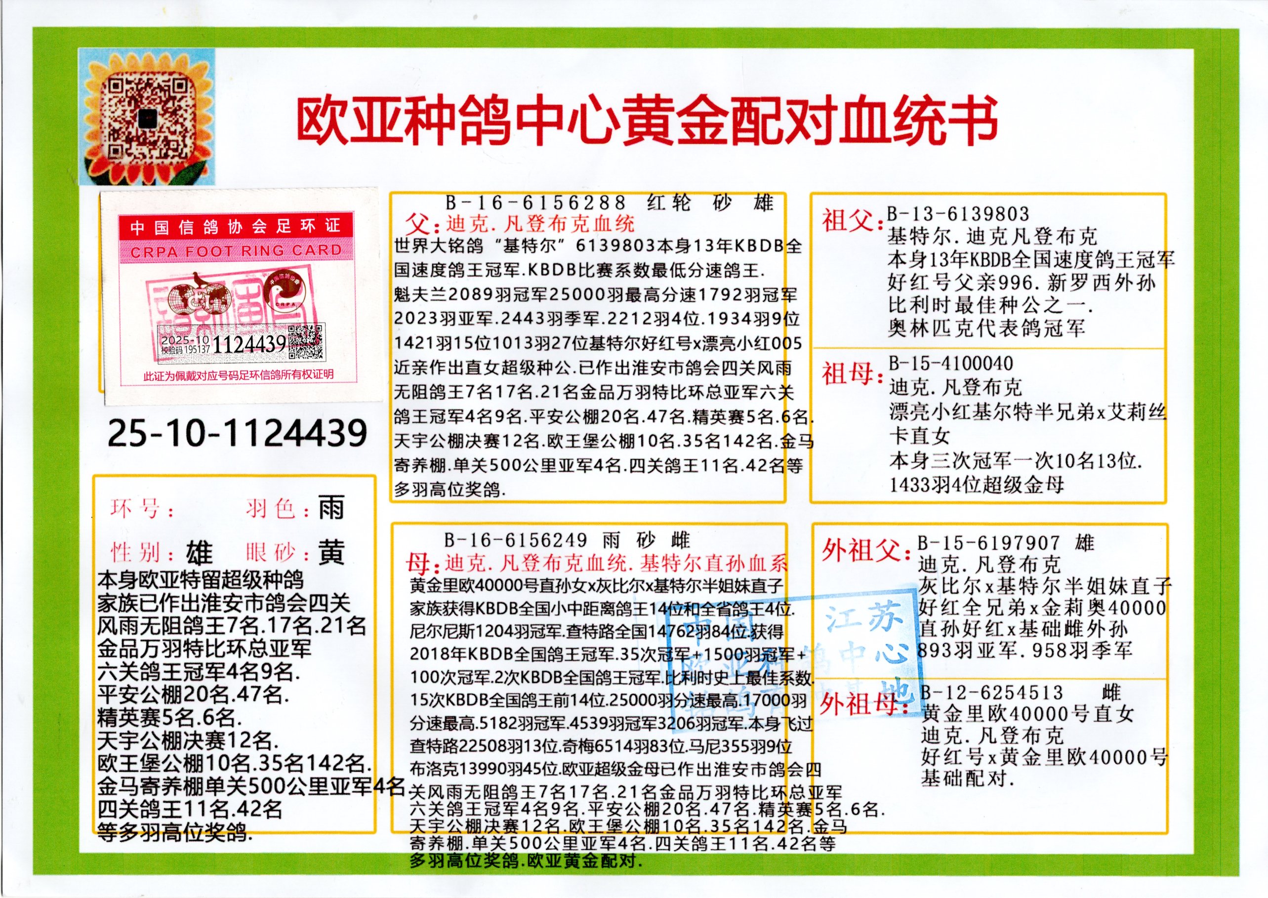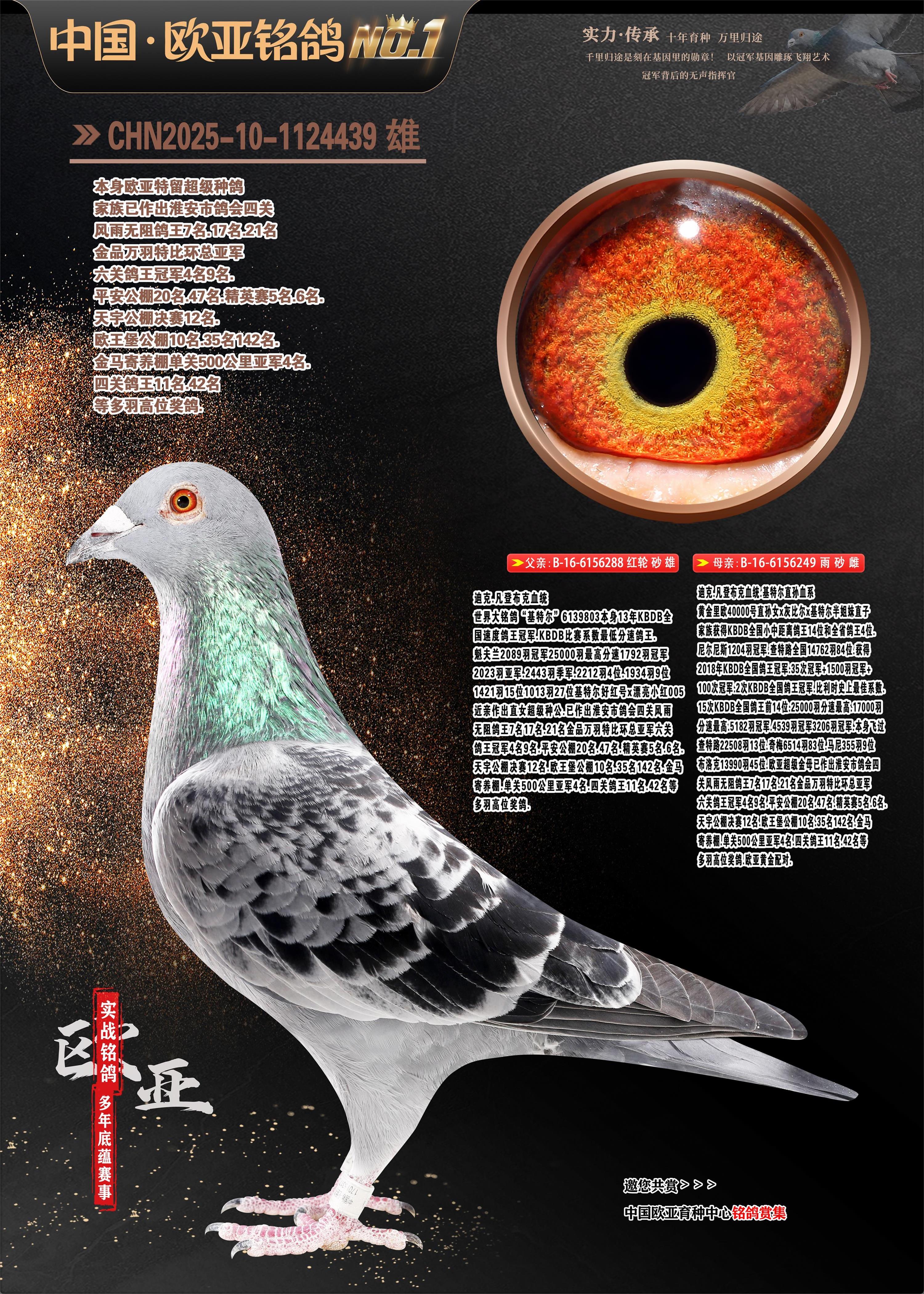 24年秋南京特比环欧亚荣获大团体冠军.小团体冠军551公里大特比13名.14名.16名.19名.20名.21名.24名.26名.27名.28名.42名.52名.54名.57名.65名.66名.68名.70名.71名.72名.74名.76名.80名.82名.83名.84名.85名.86名.90名.92名.110名.116名.121名.122名.128名.131名.158名.161名.164名.165名.166名.172名.174名.177名.182名.195名.196名.201名.205名.208名.210名.216名.253名.269名.275名.276名.294名.296名.299名,,24年秋云南天南铜都公棚决赛415名.天南铜都小棚决赛409名.云南玉活公棚决赛102名.490名.团体32名上笼二羽进二羽,天南铜都大棚506公里决赛445名。热烈祝贺河北省巨鹿县李兰生老师用欧亚泰山号血系连续十一年夺冠军,河北省国家赛冠军.全国季军等多次前十名高位,扬州王军王总用欧亚利奥24年春季获山东翔宇公棚决赛33名盖比53名。南京刘正龙刘总用欧亚盖比获得24年秋山东潍坊国际公棚决赛42名.精英赛30名.三关鸽王71名.决赛86名.加站赛16名.南京市特比环A组鸽王9名.B组鸽王5名.6名.C组鸽王5名.精英赛冠军4名.技能赛A组冠军4名.5名.秦淮区特比环荣获15名.46名.48名.87名。四川西昌徐亮徐总用欧亚利奥获得凉山州聚友决赛177名.第二关亚军双关鸽王19名.三关鸽王105名.云南豪庭公棚决赛603名。热烈祝贺24年四川重庆翔园鸽舍用欧亚泰山号荣获春季400公里冠军.秋季500公里冠军,河北王总用詹森X利奥获得千羽千翔公棚400公里冠军,广东蔡楷焕荣获24年秋爱好者 赛鸽俱乐部三关鸽王季军.一关420公里99名.二关450公里11名.三关520公里32名.单关季军.7名.12名,江西李卫兴荣获贵州红枫公棚8名.共翔俱乐部寄养棚四关综合鸽王30名.一关400公里78名.二关500公里55名.三关520公里37名.四关500公里57名.同父母获公棚18名.雷鸣获得武汉黄浦育翔中心冠军,四川陈文获得四川明鸿俱乐部300公里梦幻2名.3名.4名.9名.10名.13名.14名.15名.31名.34名.40名.41名.42名.43名.69名.71名.72名.73名.74名.94名.95名.97名.98名.99名.419公里决赛荣获总冠军7名.总共归巢9羽,四川徐亮获豪庭决赛603名,山西郑勇获得山西泰鑫公棚决赛255名詹森红狐,热烈祝贺马总获得开尔(飞跃队)决赛9名获奖金1310000万元.第一关52名,天津津福资赛180公里96名.获奖金429543万元,欧亚支持全国鸽友24年秋多人报喜 祝大家取得更好成绩,给欧亚报喜鸽友欧亚决定给每人赠送一羽超级种鸽。欧亚俱乐部特比环多关鸽王成绩:15年秋淮安特比环黑色星期一全会上笼9700多羽,当天无鸽归巢,第二天全会归巢357羽,本舍归巢158羽.前十名八羽.前一百名归巢57羽,16年春季获五关鸽王总冠军,总亚军四名.六名.七名.九名.十名.晶艺俱乐部520公里冠亚季军5名.6名.7名.9名.11名等,火车头冠军.季军6名.8名.9名.10名,16年秋晶艺俱乐部特比环520公里亚军.季军4名.6名.7名.9名,15年春南京白下特比环冠军.亚军.季军6名.7名.8名.9名.10名.指定鸽A B组获得冠军.亚军.季军4名.5名.,17年淮安特比环亚军.4名.5名.7名.8名.10名.六关鸽王总冠军.4名.6名.9名.10名,寄养棚宿迁刘总20羽特比环获冠军.季军.4名.7名.8名.9名等。18年荣获万羽特比环六关鸽王总冠军.总亚军.总季军.6名.8名.十名.单关四羽冠军.二羽亚军.四羽季军.前十名27羽。19年秋万羽特比环六关鸽王总亚军.总季军.5名.8名等,单关二羽冠军.三羽亚军.一羽季军前十名31羽。20年秋淮安市鸽会四关特比环大赛风雨无阻鸽王亚军.鸽王六名,金品俱乐部万羽特比环六关鸽王总冠军,总亚军.四名.五名.六名.七名.八名.十名.前二百名鸽王35羽,单关冠亚季军前十名四十多羽,火车头五关鸽王季军.六名.八名.前二百名鸽王十七羽。20年春荣获淮安五区一市四关鸽王总冠军.亚军.四名.八名.九名。21年秋荣获金品万羽特比环大赛六关鸽王总亚军.总季军.四名.七名.九名.十名.单关冠亚军季军前十名三十多羽。火车头协会鸽王六名.七名.十名.单关前十名十七羽。22年秋荣获鸽王总冠军.总亚军.5名.7名.8名.9名.11名.单关冠亚季军前十名三十多羽,第一关单关前二百名四十多羽,第二关前二百名三十多羽,第三关前二百名四十多羽,第四关前二百名四十多羽,第五关前一百名53羽。23年秋荣获鸽王季军.五名.八名.十名.13名.17名.20名.27名等多羽鸽王.单关前十名二十多羽。公棚.寄养棚部分成绩:16年秋宁夏黄河公棚总冠军电脑戈马力指定通炮冠军,17年送八羽参赛获得鸽王八名进奖四名,支持韩总荣获八名。支持鸽友荣获宁夏中卫公棚决赛总冠军.精英赛冠军,支持18年宁夏黄河公棚决赛冠军詹森X泰山。安徽鼎博寄养棚院内外四关鸽王总冠军.鸽王十七名.三十七名同窝,鸽王39名.42名.58名.67名。18年山东公棚预赛冠军.决赛65名.送八羽进奖五羽.指定获奔驰汽车一辆。支持鸽友获得云南蓝云公棚冠军.盖比X佛卡门。支持鸽友荣获云南银集公棚决赛冠军 詹森427X520血系 速度赛6700羽冠军。17年荣获金马俱乐部寄养棚四关鸽王总冠军.季军.六名.八名.第一关冠军.亚军.季军四名.七名.十一名.金牌教练奖。支持鸽友18年北京费翔公棚预赛九名电脑X桑杰士,支持鸽友荣获陕西威力公棚决赛11名.内蒙古临河寄养棚四关鸽王六名.詹森配泰山,支持河北王总用欧亚詹森427配胡本喜获20年秋开尔青年棚季军。云南东荣公棚16年预赛冠军.决赛77名.17年决赛12名.詹森红狐X泰山,17年平安公棚决赛4名 詹森427。欧亚获得21年金母寄养棚第一关四名.第二关5名.第三关5名.6名.7名.10名.三关鸽王总冠军,四关鸽王14名.十羽鸽王。支持河