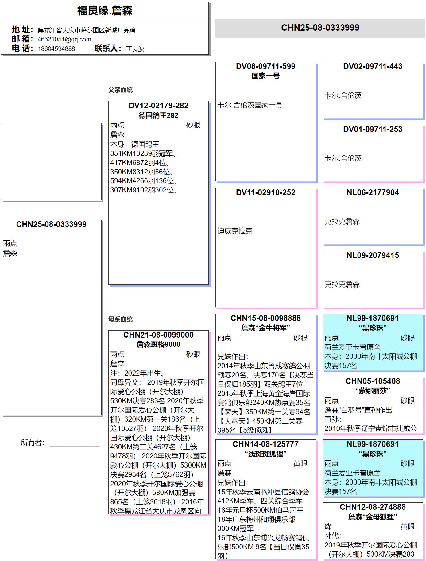 - 血统:德国鸽王冠军*詹森黑珍珠回血