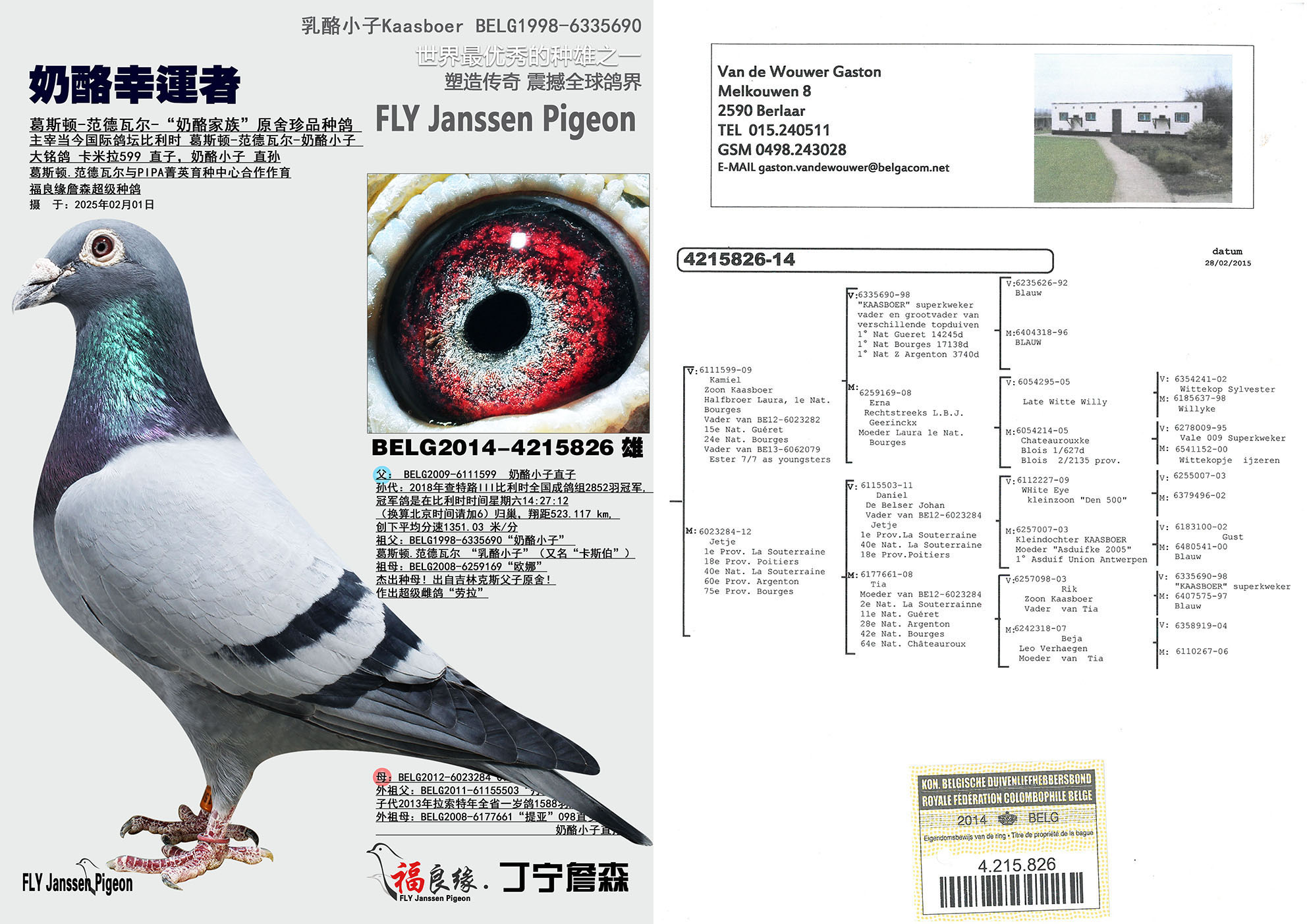 -“乳酪小子”的一羽直孙女于2011年为葛斯顿.范德瓦尔鸽舍荣获: