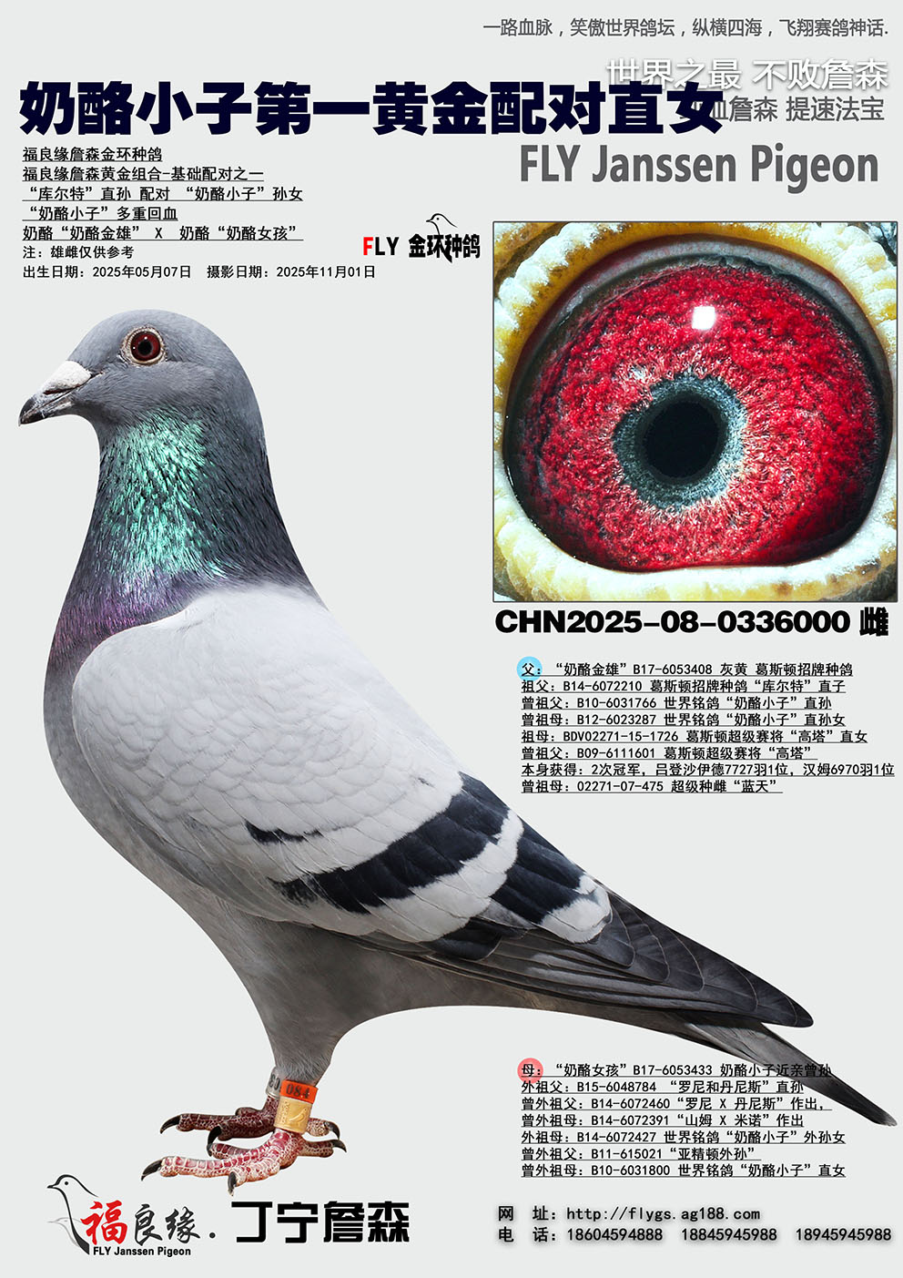 世界铭鸽“奶酪小子”直孙,奶酪240外孙,“罗尼”顶级种公世界铭鸽“奶酪小子”直子