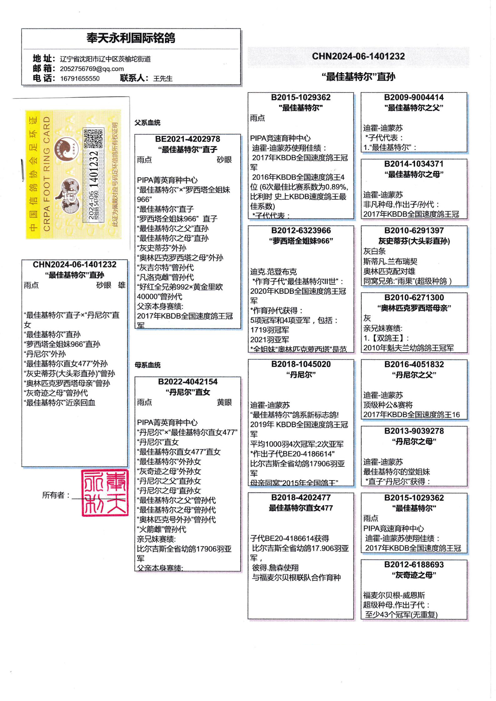 *全姐妹“奥林匹克萝西塔”是范登布克传奇鸽&铭鸽“基特尔”的母亲,获得: