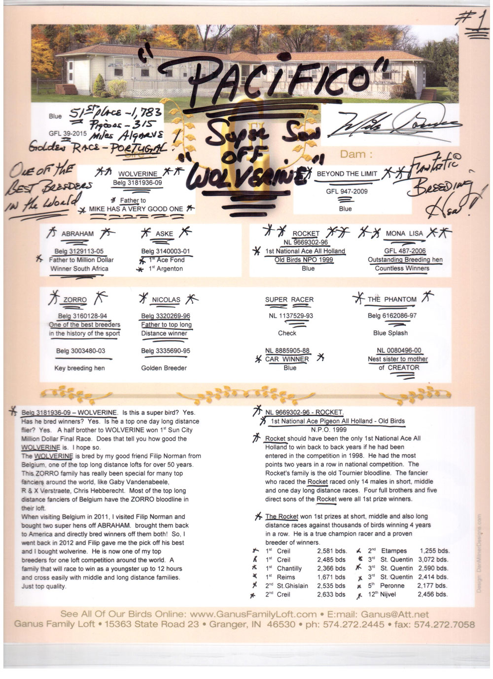 太平洋 甘纳斯作出 金刚狼直子 葡萄牙公棚决赛51名 作出直子赢得南非百万美元公棚鸽王8名,汽车大赛鸽王4名,19年涿州卡普公棚400公里34名,500公里决赛155名,双关鸽王20名