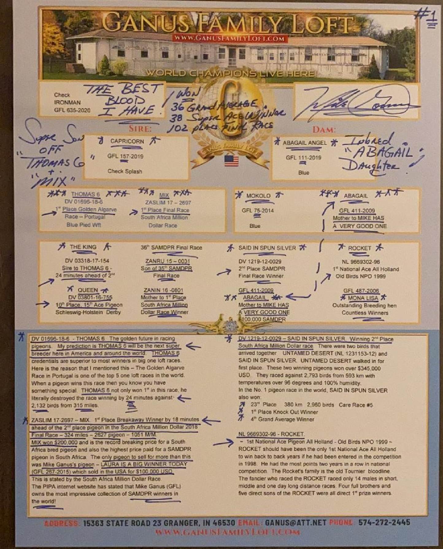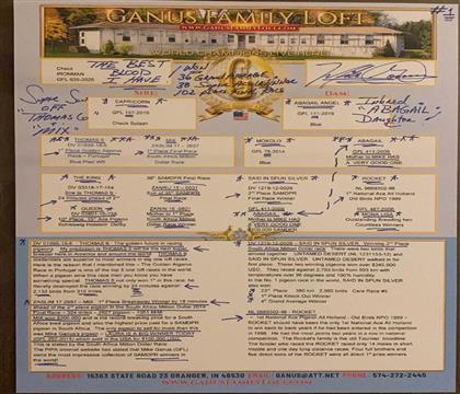 太平洋 甘纳斯作出 金刚狼直子 葡萄牙公棚决赛51名 作出直子赢得南非百万美元公棚鸽王8名,汽车大赛鸽王4名,19年涿州卡普公棚400公里34名,500公里决赛155名,双关鸽王20名