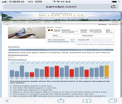 飞利浦诺曼作出 南非百万美元公棚赛决赛217名 平均分速105名 直孙22年内蒙古通辽兄弟公棚168公里303名,决赛350名,天津大天立决赛838名,加站赛233名(左腿折断,带伤比赛)春兴公棚加站赛223名