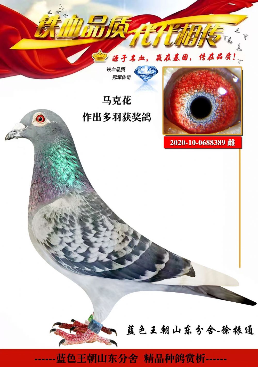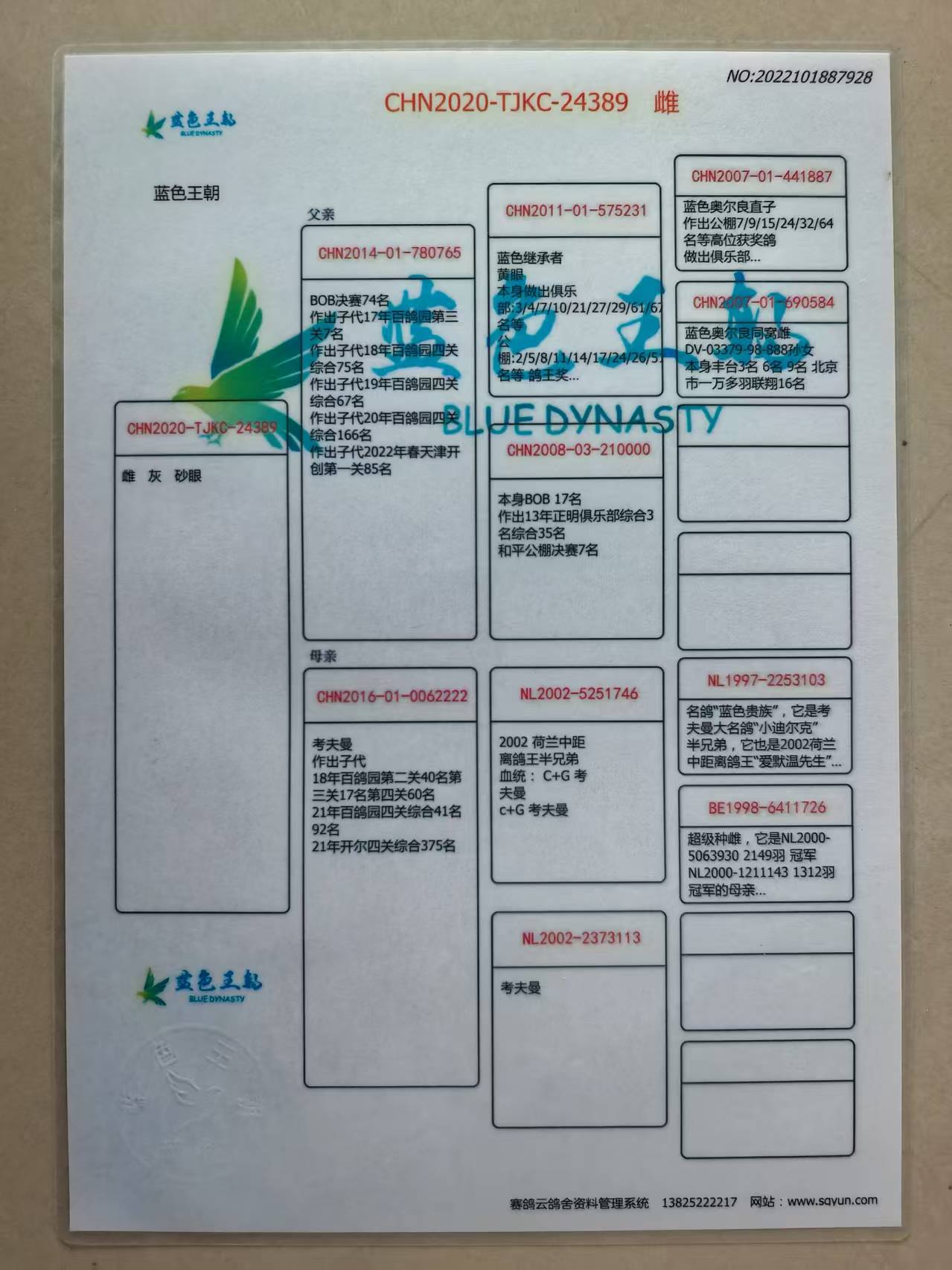 此鸽血统书给开错了,上传的血统书是从蓝色王朝带来的,足环号对应不上,此鸽本身的血统书没有,介意勿拍
