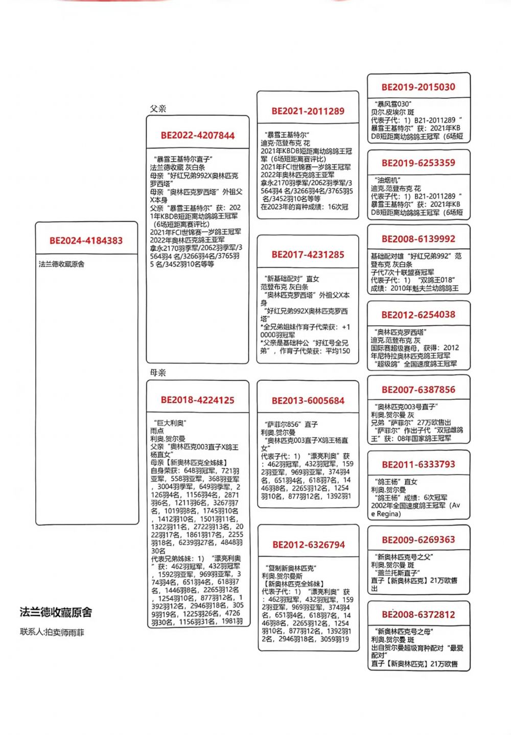 所有拍卖赛鸽,变换鸽舍及周边环境;如出现健康问题:发鸽之日起7日内联系;如有做育问题:秋季拍卖鸽,3个月内联系反馈;春节过后所售拍卖鸽,做育问题请在1个月内联系反馈。请鸽友收到鸽子实验配对做育,逾期本鸽业将不负责。不要1-2年后再联系我们反馈问题,时间长了,无法断定是在本舍还是您的鸽舍出现的问题。