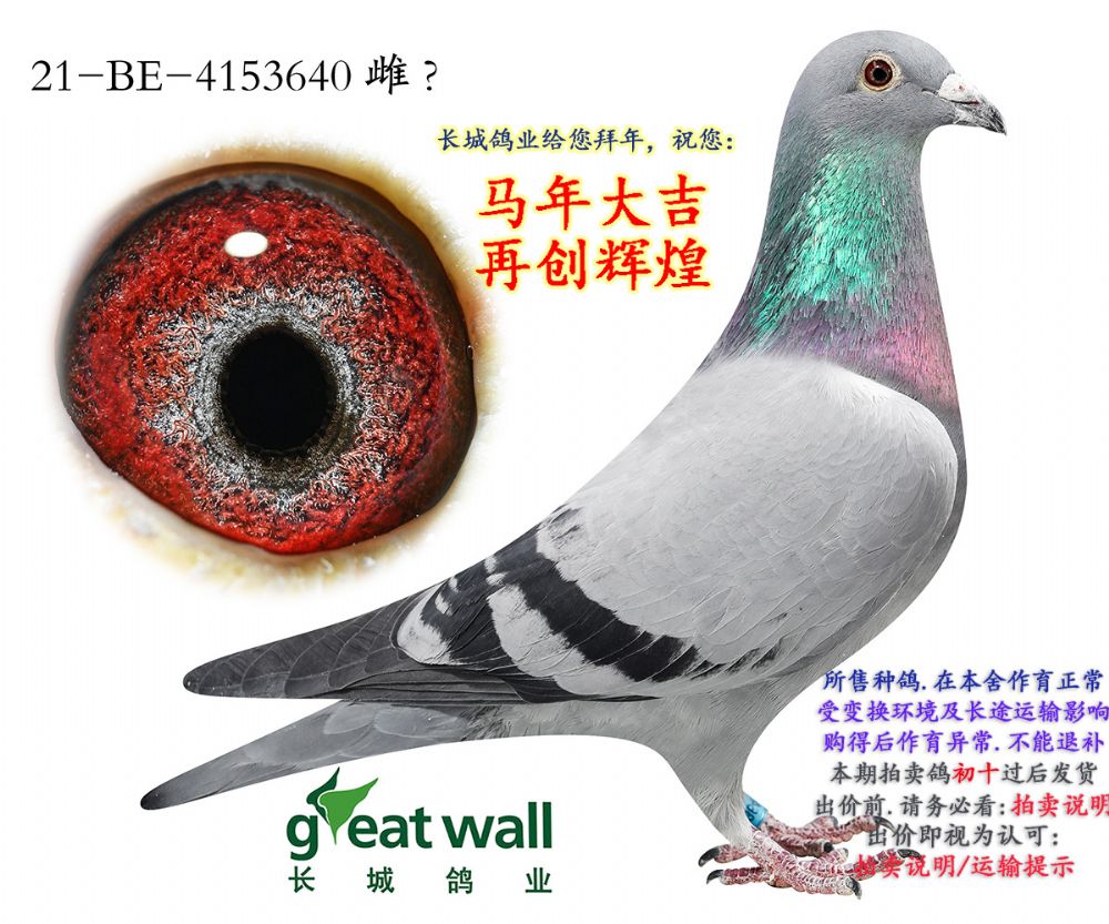 所有拍卖赛鸽,变换鸽舍及周边环境;如出现健康问题:发鸽之日起7日内联系;如有做育问题:秋季拍卖鸽,3个月内联系反馈;春节过后所售拍卖鸽,做育问题请在1个月内联系反馈。请鸽友收到鸽子实验配对做育,逾期本鸽业将不负责。不要1-2年后再联系我们反馈问题,时间长了,无法断定是在本舍还是您的鸽舍出现的问题。