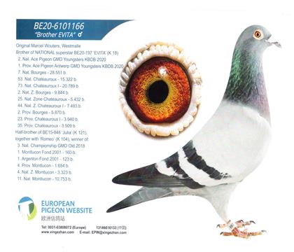 “伊薇塔全兄弟”伊薇塔 2020年KBDB全国大中距离幼鸽鸽王亚军 2020年KBDB全省大中距离幼鸽鸽王冠军(特优号直孙)“特优号直子X妮基全姐妹直孙女”马塞尔.沃特斯(Wouters Marcel) 原舍 马塞尔.沃特斯×威利.丹尼斯 “特优种雄X黄金威莉”直子 “电流号全兄弟”直子 “特优号X艾迪号半姐妹”直孙 “凯特半兄弟”(37号近亲)外 “ 狮王号”曾孙) 曾外孙 “基娅拉”(妮基全姐妹)及持 全姐妹“伊薇塔” 成绩: