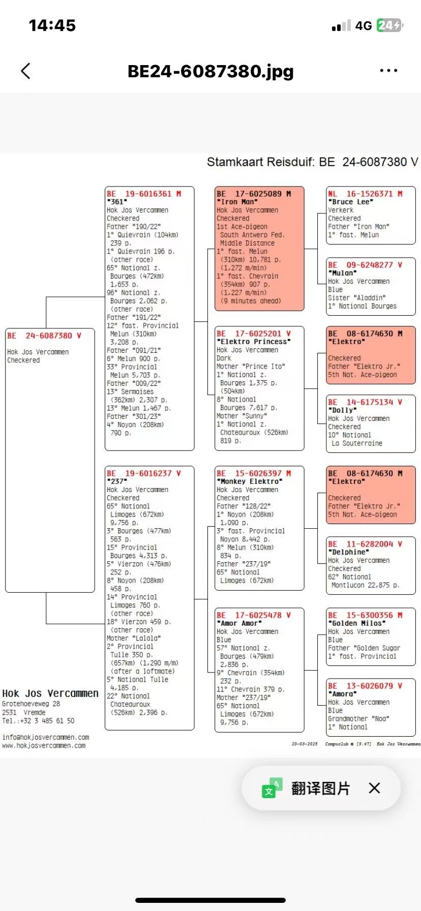 “特优种雄(电流号全兄弟)”马塞尔.沃特斯原舍 “特优号X艾迪号半姐妹”直子 “波治号半姐妹”直子 “狮王号”外孙 全兄弟“电流号”(乔斯.佛卡门) 育种:①直子“保罗”入赏布鲁瓦省联赛1519羽 冠军和杜丹6927羽季军 ②子代“三星”获苏普斯9294羽最高分速 ③直女“夏奇拉”入赏蒙吕松全国17865羽 9位和波治538羽冠军 管理 ④直女“拉蒂娜”入赏布鲁瓦半国家1165 羽冠军 ⑤直女“艾丽娜”入赏利蒙治全国14211羽 26位 雄“伊薇塔全兄弟”(特优号直孙)“特优号直子X妮基全姐妹直孙女”马塞尔.沃特斯(Wouters Marcel) 原舍 马塞尔.沃特斯×威利.丹尼斯 “特优种雄X黄金威莉”直子 “电流号全兄弟”直子
