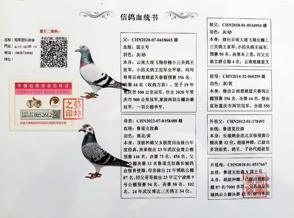 血统书足环卡随鸽发出,低价位高品质幼鸽,种赛皆宜。良心做人,所有成绩血统假一赔百,不做虚假宣传!