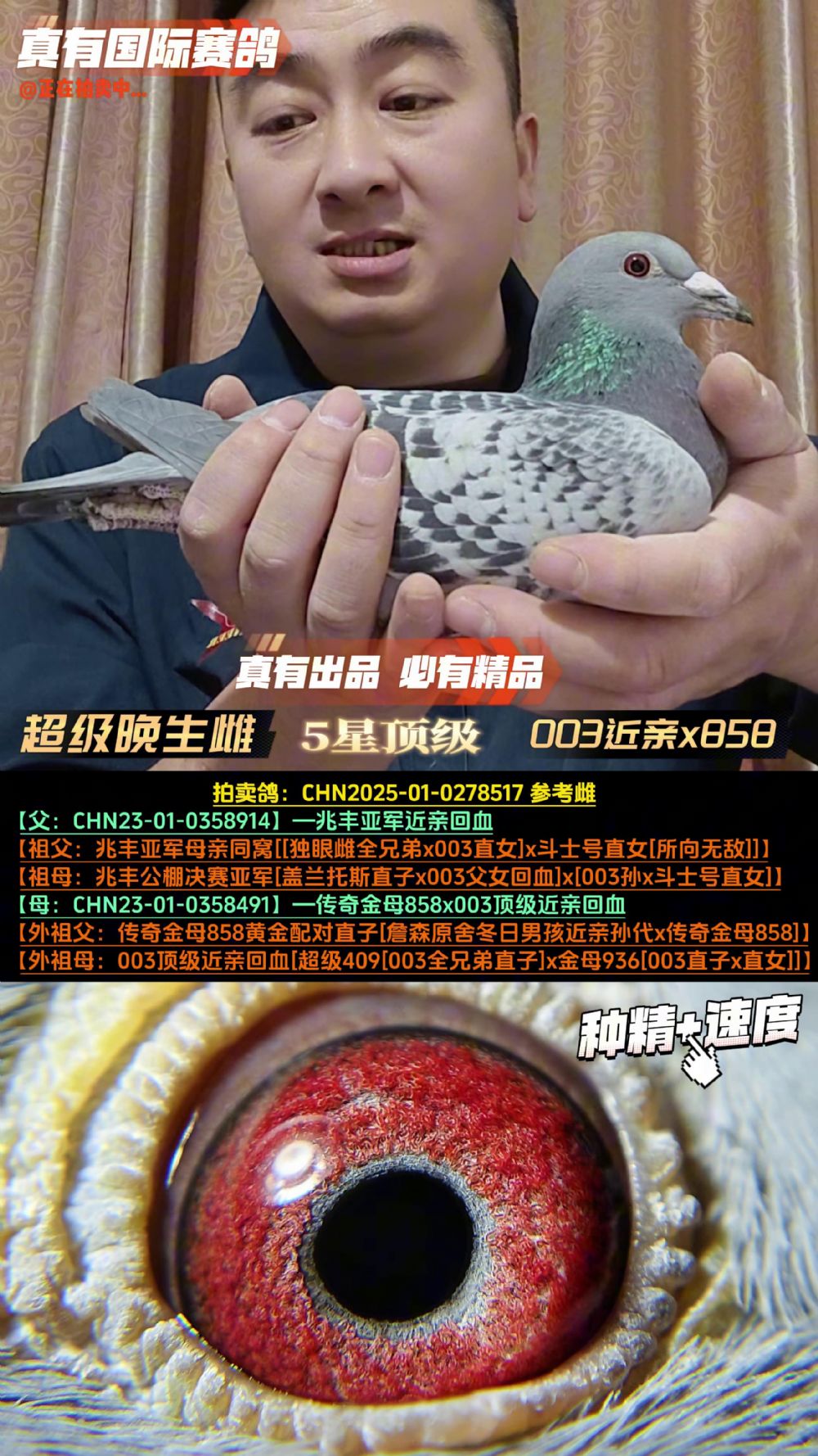 由于所有拍卖鸽均没有作育记录,因此无法100%保证雌雄的正确性,拍卖视频中的雌雄仅供参考,最终以实物为主。如有雌雄特殊要求请及时联系真有国际确认,所有拍卖鸽均享受7天免费换鸽服务(运费自理),由于拍卖形式的鸽子具备商品的唯一性,因此不支持退款服务,感谢大家的理解与支持!谢谢!