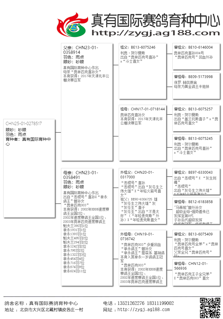 【在这三座金矿还未被世人发现之前,真有国际就第一时间把高品质的鸽子带到了国内,取得了空前的发挥。近几年大家才逐渐认识这几位大师鸽子的魅力。请记住!当任何商业鸽舍进入炒作后期的时候,他的鸽子质量与价值都会急剧下降,即便是詹森兄弟也难免于此。所以引进这家鸽舍最巅峰时期的鸽子,得以延续,才是真有国际成功的致胜法宝。】