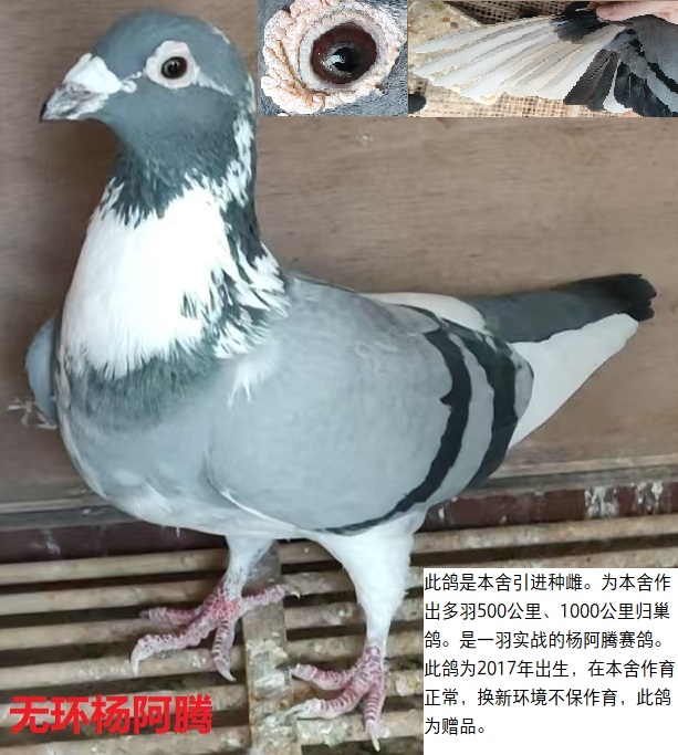 此鸽是本舍引进种雌。为本舍作出多羽500公里、1000公里归巢鸽。是一羽实战的杨阿腾赛鸽。此鸽为2017年出生,在本舍作育正常,换新环境不保作育,介意者勿拍。