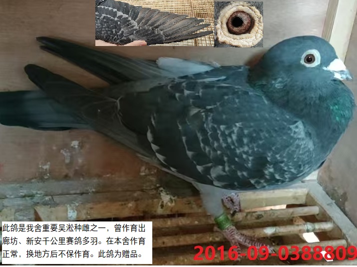 此鸽是我舍重要吴淞种雌之一,曾作育出廊坊、新安千公里赛鸽多羽。在本舍作育正常,换地方后不保作育。