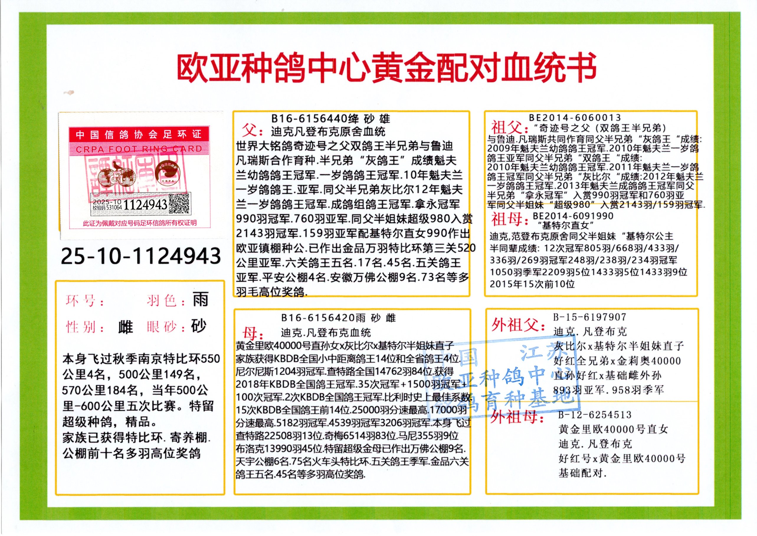 24年秋南京特比环欧亚荣获大团体冠军.小团体冠军551公里大特比13名.14名.16名.19名.20名.21名.24名.26名.27名.28名.42名.52名.54名.57名.65名.66名.68名.70名.71名.72名.74名.76名.80名.82名.83名.84名.85名.86名.90名.92名.110名.116名.121名.122名.128名.131名.158名.161名.164名.165名.166名.172名.174名.177名.182名.195名.196名.201名.205名.208名.210名.216名.253名.269名.275名.276名.294名.296名.299名,,24年秋云南天南铜都公棚决赛415名.天南铜都小棚决赛409名.云南玉活公棚决赛102名.490名.团体32名上笼二羽进二羽,天南铜都大棚506公里决赛445名。热烈祝贺河北省巨鹿县李兰生老师用欧亚泰山号血系连续十一年夺冠军,河北省国家赛冠军.全国季军等多次前十名高位,扬州王军王总用欧亚利奥24年春季获山东翔宇公棚决赛33名盖比53名。南京刘正龙刘总用欧亚盖比获得24年秋山东潍坊国际公棚决赛42名.精英赛30名.三关鸽王71名.决赛86名.加站赛16名.南京市特比环A组鸽王9名.B组鸽王5名.6名.C组鸽王5名.精英赛冠军4名.技能赛A组冠军4名.5名.秦淮区特比环荣获15名.46名.48名.87名。四川西昌徐亮徐总用欧亚利奥获得凉山州聚友决赛177名.第二关亚军双关鸽王19名.三关鸽王105名.云南豪庭公棚决赛603名。热烈祝贺24年四川重庆翔园鸽舍用欧亚泰山号荣获春季400公里冠军.秋季500公里冠军,河北王总用詹森X利奥获得千羽千翔公棚400公里冠军,广东蔡楷焕荣获24年秋爱好者 赛鸽俱乐部三关鸽王季军.一关420公里99名.二关450公里11名.三关520公里32名.单关季军.7名.12名,江西李卫兴荣获贵州红枫公棚8名.共翔俱乐部寄养棚四关综合鸽王30名.一关400公里78名.二关500公里55名.三关520公里37名.四关500公里57名.同父母获公棚18名.雷鸣获得武汉黄浦育翔中心冠军,四川陈文获得四川明鸿俱乐部300公里梦幻2名.3名.4名.9名.10名.13名.14名.15名.31名.34名.40名.41名.42名.43名.69名.71名.72名.73名.74名.94名.95名.97名.98名.99名.419公里决赛荣获总冠军7名.总共归巢9羽,四川徐亮获豪庭决赛603名,山西郑勇获得山西泰鑫公棚决赛255名詹森红狐,热烈祝贺马总获得开尔(飞跃队)决赛9名获奖金1310000万元.第一关52名,天津津福资赛180公里96名.获奖金429543万元,欧亚支持全国鸽友24年秋多人报喜 祝大家取得更好成绩,给欧亚报喜鸽友欧亚决定给每人赠送一羽超级种鸽。欧亚俱乐部特比环多关鸽王成绩:15年秋淮安特比环黑色星期一全会上笼9700多羽,当天无鸽归巢,第二天全会归巢357羽,本舍归巢158羽.前十名八羽.前一百名归巢57羽,16年春季获五关鸽王总冠军,总亚军四名.六名.七名.九名.十名.晶艺俱乐部520公里冠亚季军5名.6名.7名.9名.11名等,火车头冠军.季军6名.8名.9名.10名,16年秋晶艺俱乐部特比环520公里亚军.季军4名.6名.7名.9名,15年春南京白下特比环冠军.亚军.季军6名.7名.8名.9名.10名.指定鸽A B组获得冠军.亚军.季军4名.5名.,17年淮安特比环亚军.4名.5名.7名.8名.10名.六关鸽王总冠军.4名.6名.9名.10名,寄养棚宿迁刘总20羽特比环获冠军.季军.4名.7名.8名.9名等。18年荣获万羽特比环六关鸽王总冠军.总亚军.总季军.6名.8名.十名.单关四羽冠军.二羽亚军.四羽季军.前十名27羽。19年秋万羽特比环六关鸽王总亚军.总季军.5名.8名等,单关二羽冠军.三羽亚军.一羽季军前十名31羽。20年秋淮安市鸽会四关特比环大赛风雨无阻鸽王亚军.鸽王六名,金品俱乐部万羽特比环六关鸽王总冠军,总亚军.四名.五名.六名.七名.八名.十名.前二百名鸽王35羽,单关冠亚季军前十名四十多羽,火车头五关鸽王季军.六名.八名.前二百名鸽王十七羽。20年春荣获淮安五区一市四关鸽王总冠军.亚军.四名.八名.九名。21年秋荣获金品万羽特比环大赛六关鸽王总亚军.总季军.四名.七名.九名.十名.单关冠亚军季军前十名三十多羽。火车头协会鸽王六名.七名.十名.单关前十名十七羽。22年秋荣获鸽王总冠军.总亚军.5名.7名.8名.9名.11名.单关冠亚季军前十名三十多羽,第一关单关前二百名四十多羽,第二关前二百名三十多羽,第三关前二百名四十多羽,第四关前二百名四十多羽,第五关前一百名53羽。23年秋荣获鸽王季军.五名.八名.十名.13名.17名.20名.27名等多羽鸽王.单关前十名二十多羽。公棚.寄养棚部分成绩:16年秋宁夏黄河公棚总冠军电脑戈马力指定通炮冠军,17年送八羽参赛获得鸽王八名进奖四名,支持韩总荣获八名。支持鸽友荣获宁夏中卫公棚决赛总冠军.精英赛冠军,支持18年宁夏黄河公棚决赛冠军詹森X泰山。安徽鼎博寄养棚院内外四关鸽王总冠军.鸽王十七名.三十七名同窝,鸽王39名.42名.58名.67名。18年山东公棚预赛冠军.决赛65名.送八羽进奖五羽.指定获奔驰汽车一辆。支持鸽友获得云南蓝云公棚冠军.盖比X佛卡门。支持鸽友荣获云南银集公棚决赛冠军 詹森427X520血系 速度赛6700羽冠军。17年荣获金马俱乐部寄养棚四关鸽王总冠军.季军.六名.八名.第一关冠军.亚军.季军四名.七名.十一名.金牌教练奖。支持鸽友18年北京费翔公棚预赛九名电脑X桑杰士,支持鸽友荣获陕西威力公棚决赛11名.内蒙古临河寄养棚四关鸽王六名.詹森配泰山,支持河北王总用欧亚詹森427配胡本喜获20年秋开尔青年棚季军。云南东荣公棚16年预赛冠军.决赛77名.17年决赛12名.詹森红狐X泰山,17年平安公棚决赛4名 詹森427。欧亚获得21年金母寄养棚第一关四名.第二关5名.第三关5名.6名.7名.10名.三关鸽王总冠军,四关鸽王14名.十羽鸽王。支持河