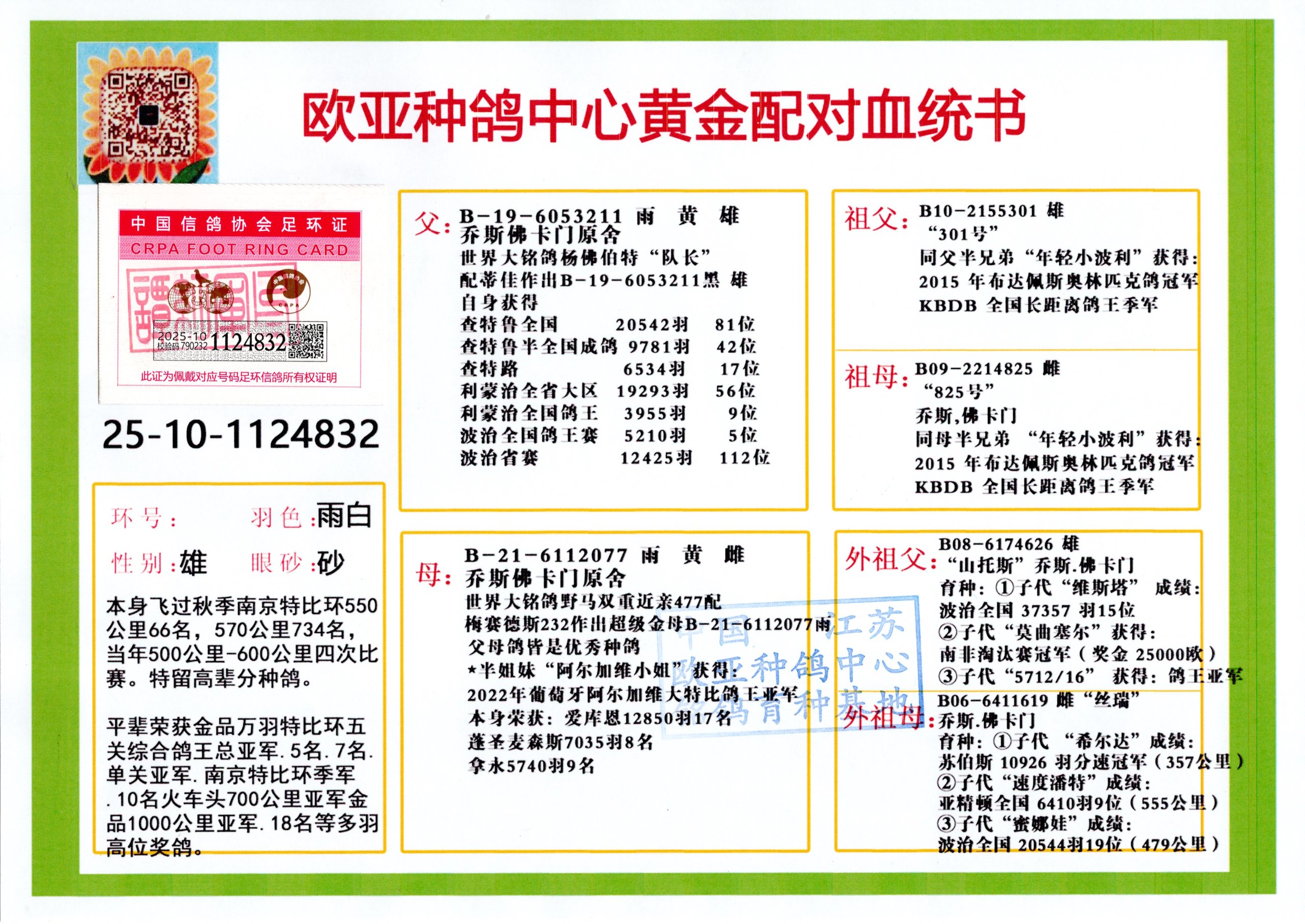 24年秋南京特比环欧亚荣获大团体冠军.小团体冠军551公里大特比13名.14名.16名.19名.20名.21名.24名.26名.27名.28名.42名.52名.54名.57名.65名.66名.68名.70名.71名.72名.74名.76名.80名.82名.83名.84名.85名.86名.90名.92名.110名.116名.121名.122名.128名.131名.158名.161名.164名.165名.166名.172名.174名.177名.182名.195名.196名.201名.205名.208名.210名.216名.253名.269名.275名.276名.294名.296名.299名,,24年秋云南天南铜都公棚决赛415名.天南铜都小棚决赛409名.云南玉活公棚决赛102名.490名.团体32名上笼二羽进二羽,天南铜都大棚506公里决赛445名。热烈祝贺河北省巨鹿县李兰生老师用欧亚泰山号血系连续十一年夺冠军,河北省国家赛冠军.全国季军等多次前十名高位,扬州王军王总用欧亚利奥24年春季获山东翔宇公棚决赛33名盖比53名。南京刘正龙刘总用欧亚盖比获得24年秋山东潍坊国际公棚决赛42名.精英赛30名.三关鸽王71名.决赛86名.加站赛16名.南京市特比环A组鸽王9名.B组鸽王5名.6名.C组鸽王5名.精英赛冠军4名.技能赛A组冠军4名.5名.秦淮区特比环荣获15名.46名.48名.87名。四川西昌徐亮徐总用欧亚利奥获得凉山州聚友决赛177名.第二关亚军双关鸽王19名.三关鸽王105名.云南豪庭公棚决赛603名。热烈祝贺24年四川重庆翔园鸽舍用欧亚泰山号荣获春季400公里冠军.秋季500公里冠军,河北王总用詹森X利奥获得千羽千翔公棚400公里冠军,广东蔡楷焕荣获24年秋爱好者 赛鸽俱乐部三关鸽王季军.一关420公里99名.二关450公里11名.三关520公里32名.单关季军.7名.12名,江西李卫兴荣获贵州红枫公棚8名.共翔俱乐部寄养棚四关综合鸽王30名.一关400公里78名.二关500公里55名.三关520公里37名.四关500公里57名.同父母获公棚18名.雷鸣获得武汉黄浦育翔中心冠军,四川陈文获得四川明鸿俱乐部300公里梦幻2名.3名.4名.9名.10名.13名.14名.15名.31名.34名.40名.41名.42名.43名.69名.71名.72名.73名.74名.94名.95名.97名.98名.99名.419公里决赛荣获总冠军7名.总共归巢9羽,四川徐亮获豪庭决赛603名,山西郑勇获得山西泰鑫公棚决赛255名詹森红狐,热烈祝贺马总获得开尔(飞跃队)决赛9名获奖金1310000万元.第一关52名,天津津福资赛180公里96名.获奖金429543万元,欧亚支持全国鸽友24年秋多人报喜 祝大家取得更好成绩,给欧亚报喜鸽友欧亚决定给每人赠送一羽超级种鸽。欧亚俱乐部特比环多关鸽王成绩:15年秋淮安特比环黑色星期一全会上笼9700多羽,当天无鸽归巢,第二天全会归巢357羽,本舍归巢158羽.前十名八羽.前一百名归巢57羽,16年春季获五关鸽王总冠军,总亚军四名.六名.七名.九名.十名.晶艺俱乐部520公里冠亚季军5名.6名.7名.9名.11名等,火车头冠军.季军6名.8名.9名.10名,16年秋晶艺俱乐部特比环520公里亚军.季军4名.6名.7名.9名,15年春南京白下特比环冠军.亚军.季军6名.7名.8名.9名.10名.指定鸽A B组获得冠军.亚军.季军4名.5名.,17年淮安特比环亚军.4名.5名.7名.8名.10名.六关鸽王总冠军.4名.6名.9名.10名,寄养棚宿迁刘总20羽特比环获冠军.季军.4名.7名.8名.9名等。18年荣获万羽特比环六关鸽王总冠军.总亚军.总季军.6名.8名.十名.单关四羽冠军.二羽亚军.四羽季军.前十名27羽。19年秋万羽特比环六关鸽王总亚军.总季军.5名.8名等,单关二羽冠军.三羽亚军.一羽季军前十名31羽。20年秋淮安市鸽会四关特比环大赛风雨无阻鸽王亚军.鸽王六名,金品俱乐部万羽特比环六关鸽王总冠军,总亚军.四名.五名.六名.七名.八名.十名.前二百名鸽王35羽,单关冠亚季军前十名四十多羽,火车头五关鸽王季军.六名.八名.前二百名鸽王十七羽。20年春荣获淮安五区一市四关鸽王总冠军.亚军.四名.八名.九名。21年秋荣获金品万羽特比环大赛六关鸽王总亚军.总季军.四名.七名.九名.十名.单关冠亚军季军前十名三十多羽。火车头协会鸽王六名.七名.十名.单关前十名十七羽。22年秋荣获鸽王总冠军.总亚军.5名.7名.8名.9名.11名.单关冠亚季军前十名三十多羽,第一关单关前二百名四十多羽,第二关前二百名三十多羽,第三关前二百名四十多羽,第四关前二百名四十多羽,第五关前一百名53羽。23年秋荣获鸽王季军.五名.八名.十名.13名.17名.20名.27名等多羽鸽王.单关前十名二十多羽。公棚.寄养棚部分成绩:16年秋宁夏黄河公棚总冠军电脑戈马力指定通炮冠军,17年送八羽参赛获得鸽王八名进奖四名,支持韩总荣获八名。支持鸽友荣获宁夏中卫公棚决赛总冠军.精英赛冠军,支持18年宁夏黄河公棚决赛冠军詹森X泰山。安徽鼎博寄养棚院内外四关鸽王总冠军.鸽王十七名.三十七名同窝,鸽王39名.42名.58名.67名。18年山东公棚预赛冠军.决赛65名.送八羽进奖五羽.指定获奔驰汽车一辆。支持鸽友获得云南蓝云公棚冠军.盖比X佛卡门。支持鸽友荣获云南银集公棚决赛冠军 詹森427X520血系 速度赛6700羽冠军。17年荣获金马俱乐部寄养棚四关鸽王总冠军.季军.六名.八名.第一关冠军.亚军.季军四名.七名.十一名.金牌教练奖。支持鸽友18年北京费翔公棚预赛九名电脑X桑杰士,支持鸽友荣获陕西威力公棚决赛11名.内蒙古临河寄养棚四关鸽王六名.詹森配泰山,支持河北王总用欧亚詹森427配胡本喜获20年秋开尔青年棚季军。云南东荣公棚16年预赛冠军.决赛77名.17年决赛12名.詹森红狐X泰山,17年平安公棚决赛4名 詹森427。欧亚获得21年金母寄养棚第一关四名.第二关5名.第三关5名.6名.7名.10名.三关鸽王总冠军,四关鸽王14名.十羽鸽王。支持河