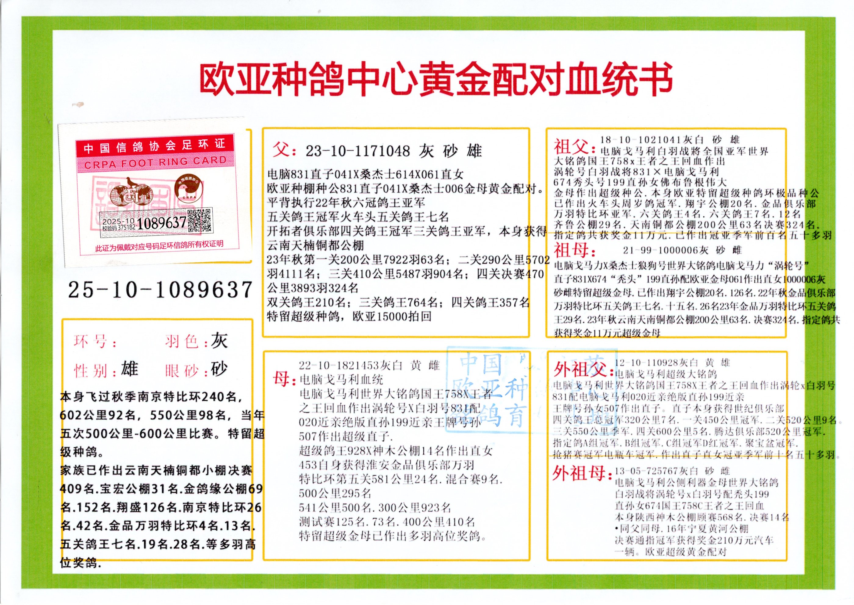 24年秋南京特比环欧亚荣获大团体冠军.小团体冠军551公里大特比13名.14名.16名.19名.20名.21名.24名.26名.27名.28名.42名.52名.54名.57名.65名.66名.68名.70名.71名.72名.74名.76名.80名.82名.83名.84名.85名.86名.90名.92名.110名.116名.121名.122名.128名.131名.158名.161名.164名.165名.166名.172名.174名.177名.182名.195名.196名.201名.205名.208名.210名.216名.253名.269名.275名.276名.294名.296名.299名,,24年秋云南天南铜都公棚决赛415名.天南铜都小棚决赛409名.云南玉活公棚决赛102名.490名.团体32名上笼二羽进二羽,天南铜都大棚506公里决赛445名。热烈祝贺河北省巨鹿县李兰生老师用欧亚泰山号血系连续十一年夺冠军,河北省国家赛冠军.全国季军等多次前十名高位,扬州王军王总用欧亚利奥24年春季获山东翔宇公棚决赛33名盖比53名。南京刘正龙刘总用欧亚盖比获得24年秋山东潍坊国际公棚决赛42名.精英赛30名.三关鸽王71名.决赛86名.加站赛16名.南京市特比环A组鸽王9名.B组鸽王5名.6名.C组鸽王5名.精英赛冠军4名.技能赛A组冠军4名.5名.秦淮区特比环荣获15名.46名.48名.87名。四川西昌徐亮徐总用欧亚利奥获得凉山州聚友决赛177名.第二关亚军双关鸽王19名.三关鸽王105名.云南豪庭公棚决赛603名。热烈祝贺24年四川重庆翔园鸽舍用欧亚泰山号荣获春季400公里冠军.秋季500公里冠军,河北王总用詹森X利奥获得千羽千翔公棚400公里冠军,广东蔡楷焕荣获24年秋爱好者 赛鸽俱乐部三关鸽王季军.一关420公里99名.二关450公里11名.三关520公里32名.单关季军.7名.12名,江西李卫兴荣获贵州红枫公棚8名.共翔俱乐部寄养棚四关综合鸽王30名.一关400公里78名.二关500公里55名.三关520公里37名.四关500公里57名.同父母获公棚18名.雷鸣获得武汉黄浦育翔中心冠军,四川陈文获得四川明鸿俱乐部300公里梦幻2名.3名.4名.9名.10名.13名.14名.15名.31名.34名.40名.41名.42名.43名.69名.71名.72名.73名.74名.94名.95名.97名.98名.99名.419公里决赛荣获总冠军7名.总共归巢9羽,四川徐亮获豪庭决赛603名,山西郑勇获得山西泰鑫公棚决赛255名詹森红狐,热烈祝贺马总获得开尔(飞跃队)决赛9名获奖金1310000万元.第一关52名,天津津福资赛180公里96名.获奖金429543万元,欧亚支持全国鸽友24年秋多人报喜 祝大家取得更好成绩,给欧亚报喜鸽友欧亚决定给每人赠送一羽超级种鸽。欧亚俱乐部特比环多关鸽王成绩:15年秋淮安特比环黑色星期一全会上笼9700多羽,当天无鸽归巢,第二天全会归巢357羽,本舍归巢158羽.前十名八羽.前一百名归巢57羽,16年春季获五关鸽王总冠军,总亚军四名.六名.七名.九名.十名.晶艺俱乐部520公里冠亚季军5名.6名.7名.9名.11名等,火车头冠军.季军6名.8名.9名.10名,16年秋晶艺俱乐部特比环520公里亚军.季军4名.6名.7名.9名,15年春南京白下特比环冠军.亚军.季军6名.7名.8名.9名.10名.指定鸽A B组获得冠军.亚军.季军4名.5名.,17年淮安特比环亚军.4名.5名.7名.8名.10名.六关鸽王总冠军.4名.6名.9名.10名,寄养棚宿迁刘总20羽特比环获冠军.季军.4名.7名.8名.9名等。18年荣获万羽特比环六关鸽王总冠军.总亚军.总季军.6名.8名.十名.单关四羽冠军.二羽亚军.四羽季军.前十名27羽。19年秋万羽特比环六关鸽王总亚军.总季军.5名.8名等,单关二羽冠军.三羽亚军.一羽季军前十名31羽。20年秋淮安市鸽会四关特比环大赛风雨无阻鸽王亚军.鸽王六名,金品俱乐部万羽特比环六关鸽王总冠军,总亚军.四名.五名.六名.七名.八名.十名.前二百名鸽王35羽,单关冠亚季军前十名四十多羽,火车头五关鸽王季军.六名.八名.前二百名鸽王十七羽。20年春荣获淮安五区一市四关鸽王总冠军.亚军.四名.八名.九名。21年秋荣获金品万羽特比环大赛六关鸽王总亚军.总季军.四名.七名.九名.十名.单关冠亚军季军前十名三十多羽。火车头协会鸽王六名.七名.十名.单关前十名十七羽。22年秋荣获鸽王总冠军.总亚军.5名.7名.8名.9名.11名.单关冠亚季军前十名三十多羽,第一关单关前二百名四十多羽,第二关前二百名三十多羽,第三关前二百名四十多羽,第四关前二百名四十多羽,第五关前一百名53羽。23年秋荣获鸽王季军.五名.八名.十名.13名.17名.20名.27名等多羽鸽王.单关前十名二十多羽。公棚.寄养棚部分成绩:16年秋宁夏黄河公棚总冠军电脑戈马力指定通炮冠军,17年送八羽参赛获得鸽王八名进奖四名,支持韩总荣获八名。支持鸽友荣获宁夏中卫公棚决赛总冠军.精英赛冠军,支持18年宁夏黄河公棚决赛冠军詹森X泰山。安徽鼎博寄养棚院内外四关鸽王总冠军.鸽王十七名.三十七名同窝,鸽王39名.42名.58名.67名。18年山东公棚预赛冠军.决赛65名.送八羽进奖五羽.指定获奔驰汽车一辆。支持鸽友获得云南蓝云公棚冠军.盖比X佛卡门。支持鸽友荣获云南银集公棚决赛冠军 詹森427X520血系 速度赛6700羽冠军。17年荣获金马俱乐部寄养棚四关鸽王总冠军.季军.六名.八名.第一关冠军.亚军.季军四名.七名.十一名.金牌教练奖。支持鸽友18年北京费翔公棚预赛九名电脑X桑杰士,支持鸽友荣获陕西威力公棚决赛11名.内蒙古临河寄养棚四关鸽王六名.詹森配泰山,支持河北王总用欧亚詹森427配胡本喜获20年秋开尔青年棚季军。云南东荣公棚16年预赛冠军.决赛77名.17年决赛12名.詹森红狐X泰山,17年平安公棚决赛4名 詹森427。欧亚获得21年金母寄养棚第一关四名.第二关5名.第三关5名.6名.7名.10名.三关鸽王总冠军,四关鸽王14名.十羽鸽王。支持河