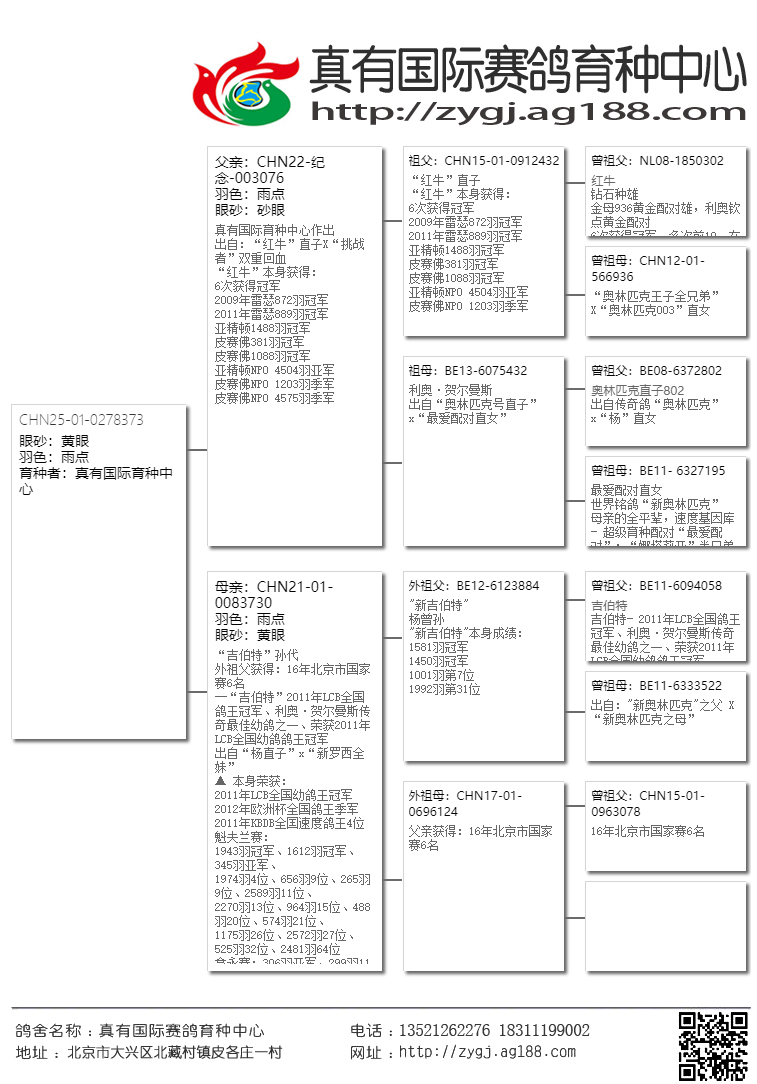 【在这三座金矿还未被世人发现之前,真有国际就第一时间把高品质的鸽子带到了国内,取得了空前的发挥。近几年大家才逐渐认识这几位大师鸽子的魅力。请记住!当任何商业鸽舍进入炒作后期的时候,他的鸽子质量与价值都会急剧下降,即便是詹森兄弟也难免于此。所以引进这家鸽舍最巅峰时期的鸽子,得以延续,才是真有国际成功的致胜法宝。】