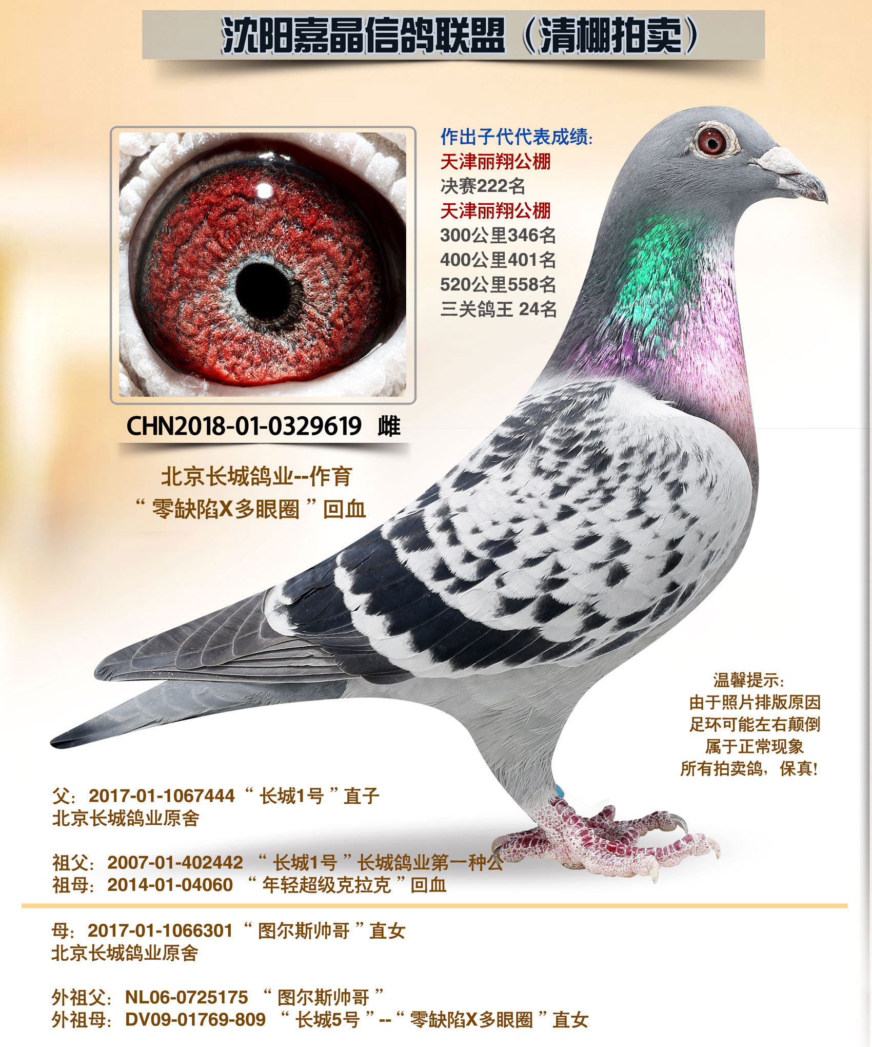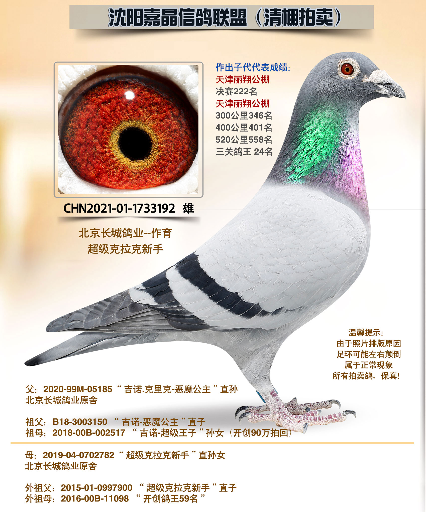 本联盟无奈,清舍拍卖,鸽舍因距离沈飞机场跑道太近,鸽群经常飞入机场试飞跑道内,飞机试飞存在安全隐患,机场工作人员多次找到本人,要求搬离拆除鸽舍,切全面停止赛鸽飞行,起初也没当回事,就在去年12月初,派出所民警找到本人,强制确切要求,必须拆除或搬离鸽舍。所给时间且非常紧迫,无奈之下将多年来饲养的种赛鸽(包括奖鸽祖辈、父母、奖鸽极其平辈)全部清棚一羽不留,本舍比赛20年,作出奖赛鸽百余羽,所留下的都是最顶尖,最实战的鸽系,希望我个人的鸽子能成为纽带,能为广大鸽友作出更优秀的赛绩,感谢鸽友多年来对嘉晶信鸽的信任与支持!!!