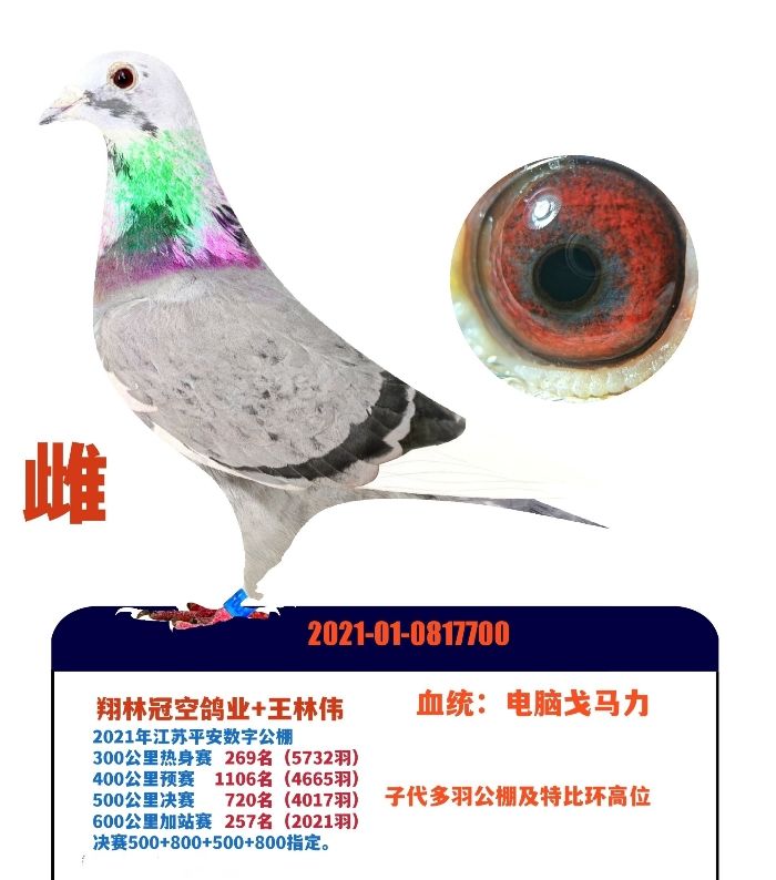 戈马力种雌,自身公棚成绩鸽,子代已发挥。