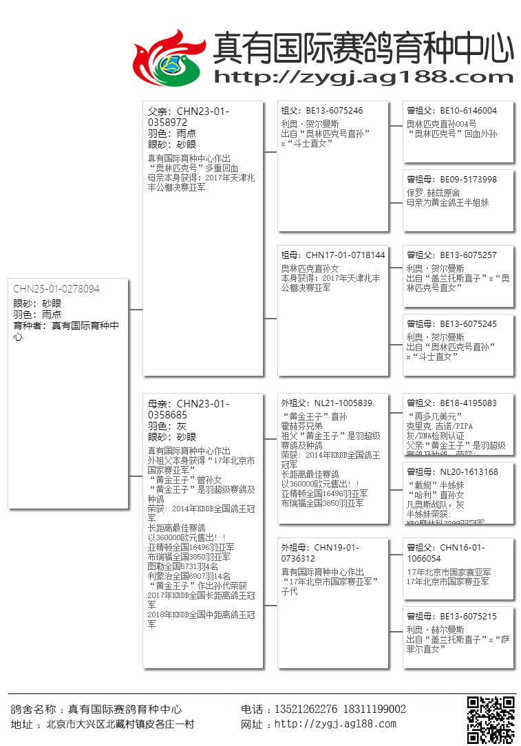 【在这三座金矿还未被世人发现之前,真有国际就第一时间把高品质的鸽子带到了国内,取得了空前的发挥。近几年大家才逐渐认识这几位大师鸽子的魅力。请记住!当任何商业鸽舍进入炒作后期的时候,他的鸽子质量与价值都会急剧下降,即便是詹森兄弟也难免于此。所以引进这家鸽舍最巅峰时期的鸽子,得以延续,才是真有国际成功的致胜法宝。】