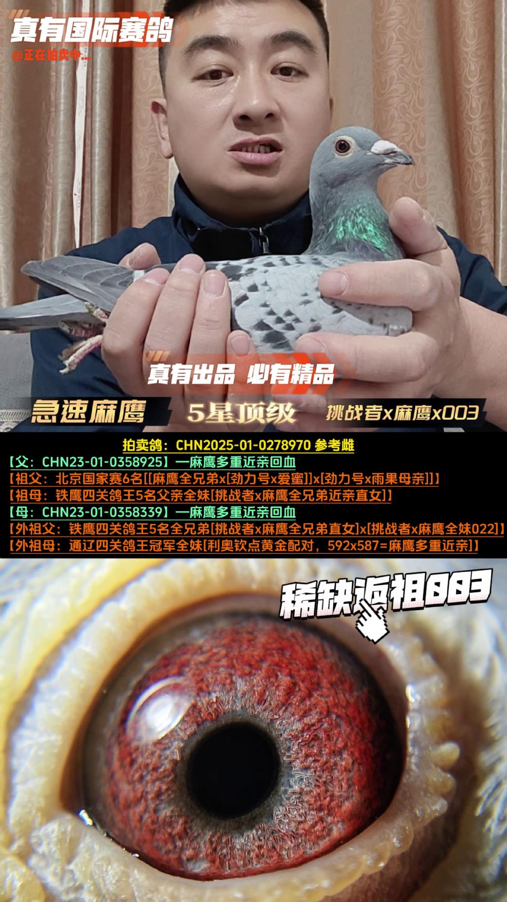 由于所有拍卖鸽均没有作育记录,因此无法100%保证雌雄的正确性,拍卖视频中的雌雄仅供参考,最终以实物为主。如有雌雄特殊要求请及时联系真有国际确认,所有拍卖鸽均享受7天免费换鸽服务(运费自理),由于拍卖形式的鸽子具备商品的唯一性,因此不支持退款服务,感谢大家的理解与支持!谢谢!