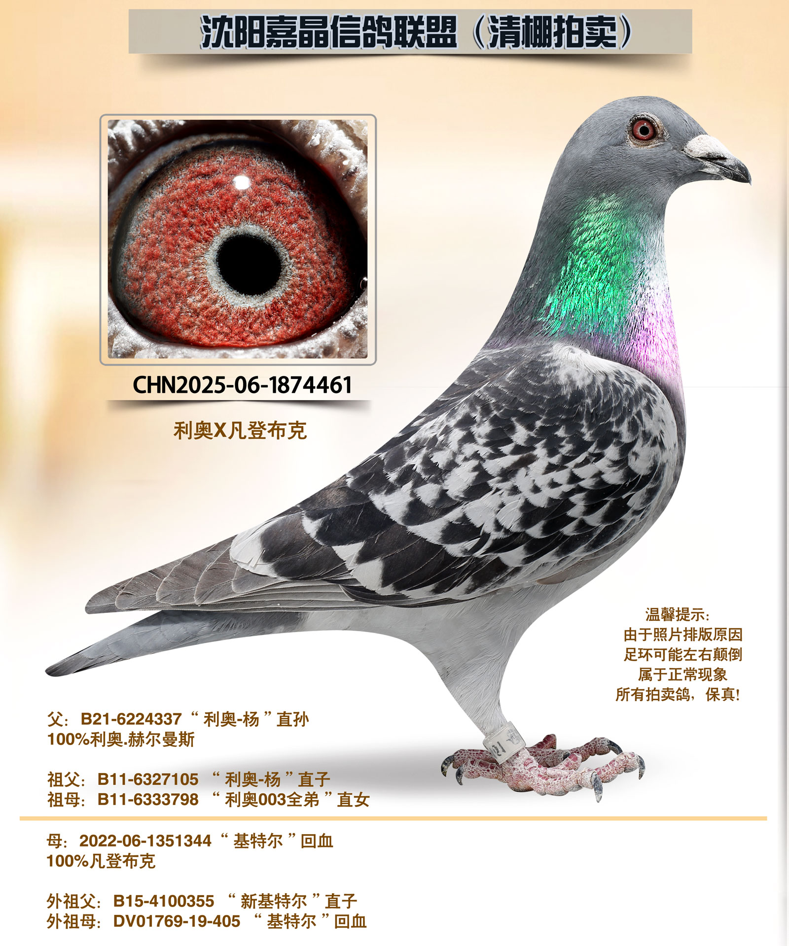 本联盟无奈,清舍拍卖,鸽舍因距离沈飞机场跑道太近,鸽群经常飞入机场试飞跑道内,飞机试飞存在安全隐患,机场工作人员多次找到本人,要求搬离拆除鸽舍,切全面停止赛鸽飞行,起初也没当回事,就在去年12月初,派出所民警找到本人,强制确切要求,必须拆除或搬离鸽舍。所给时间且非常紧迫,无奈之下将多年来饲养的种赛鸽(包括奖鸽祖辈、父母、奖鸽极其平辈)全部清棚一羽不留,本舍比赛20年,作出奖赛鸽百余羽,所留下的都是最顶尖,最实战的鸽系,希望我个人的鸽子能成为纽带,能为广大鸽友作出更优秀的赛绩,感谢鸽友多年来对嘉晶信鸽的信任与支持!!!
