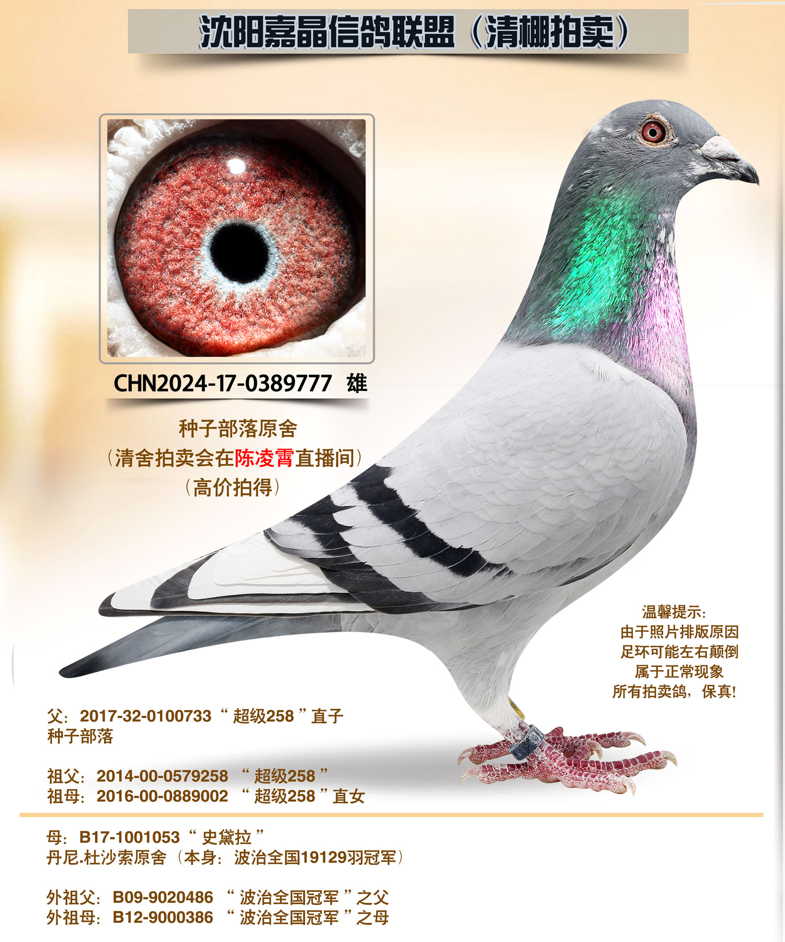 本联盟无奈,清舍拍卖,鸽舍因距离沈飞机场跑道太近,鸽群经常飞入机场试飞跑道内,飞机试飞存在安全隐患,机场工作人员多次找到本人,要求搬离拆除鸽舍,切全面停止赛鸽飞行,起初也没当回事,就在去年12月初,派出所民警找到本人,强制确切要求,必须拆除或搬离鸽舍。所给时间且非常紧迫,无奈之下将多年来饲养的种赛鸽(包括奖鸽祖辈、父母、奖鸽极其平辈)全部清棚一羽不留,本舍比赛20年,作出奖赛鸽百余羽,所留下的都是最顶尖,最实战的鸽系,希望我个人的鸽子能成为纽带,能为广大鸽友作出更优秀的赛绩,感谢鸽友多年来对嘉晶信鸽的信任与支持!!!