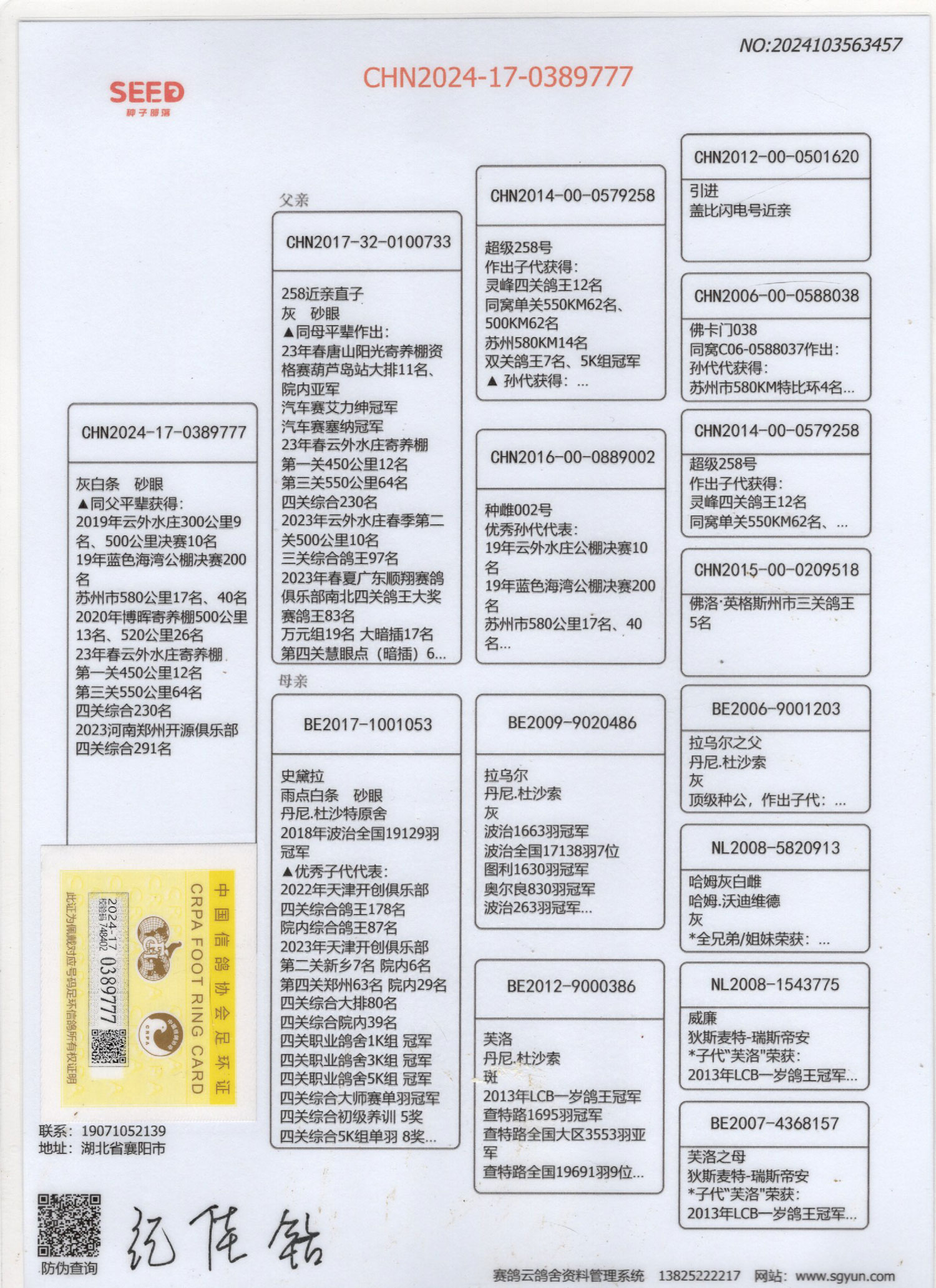 本鸽原始血统书,随鸽发出。