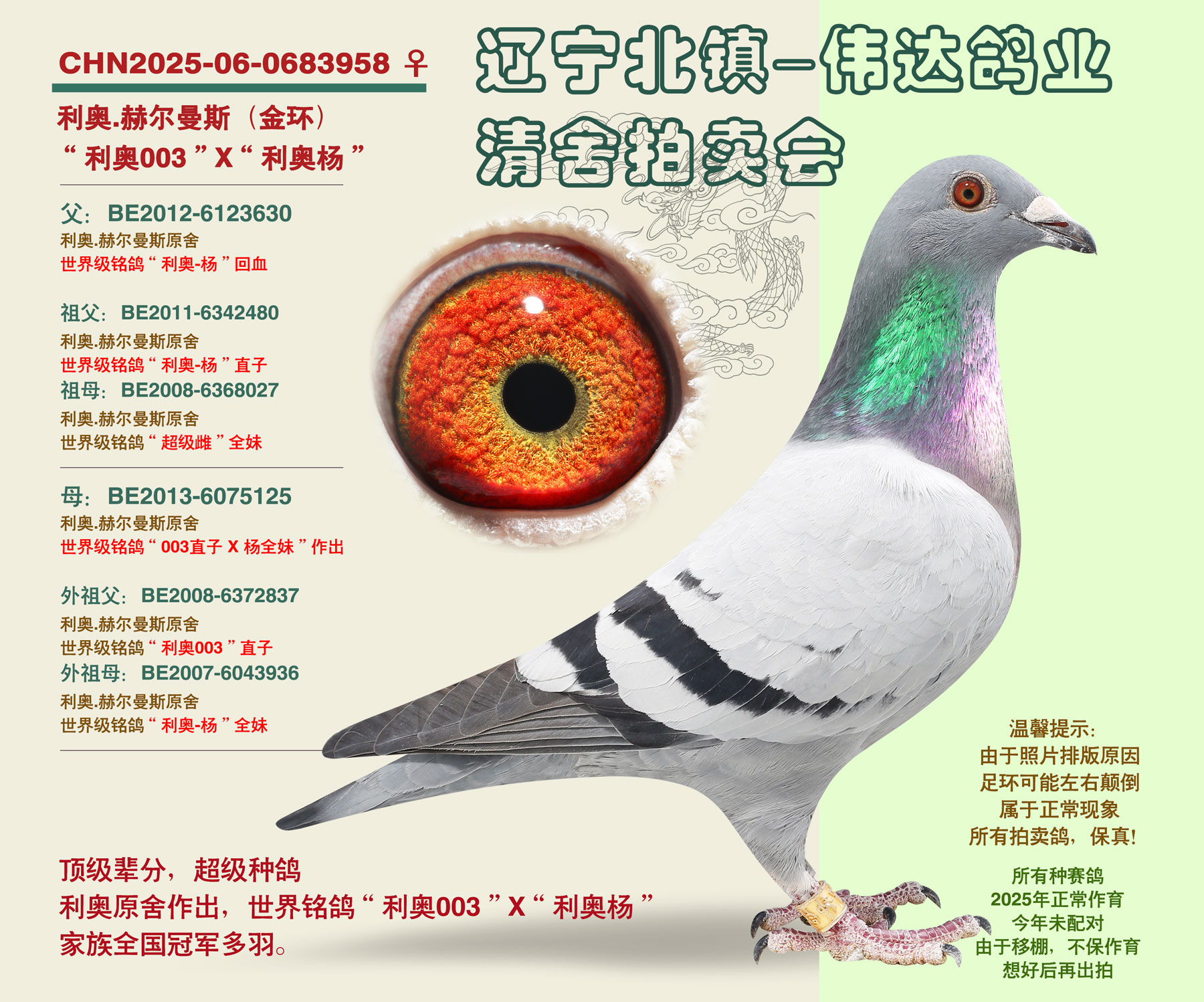 北镇伟达鸽业,鸽主由于家庭原因,全棚清舍拍卖,一羽不留,全部在中信网平台,公平竞拍,鸽主入赏率极高,仅公棚一年内获奖37羽,顶尖血统,高辈分实战种鸽,家族式发挥,此次拍卖含金量极高,希望大家珍惜!!!