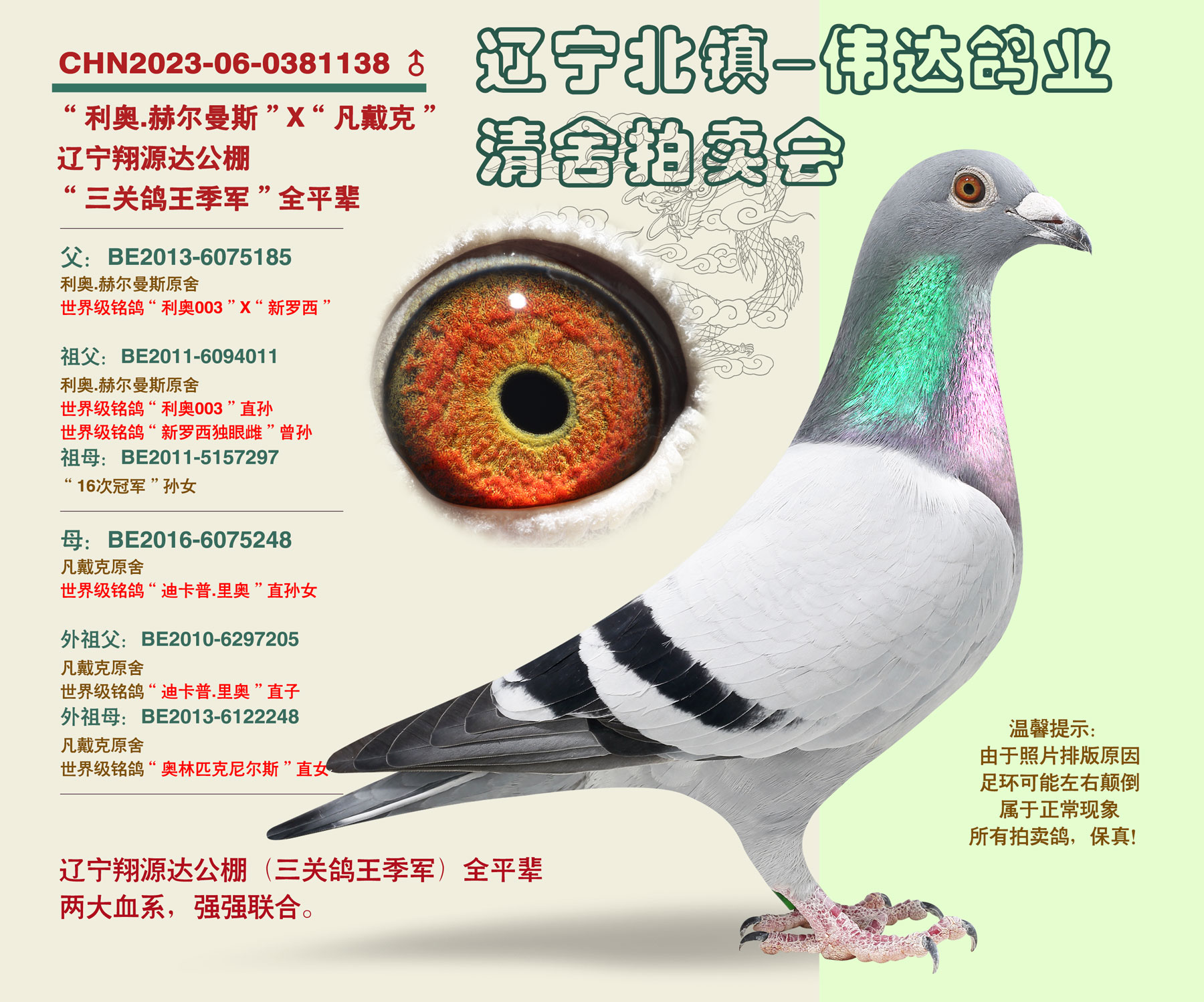 北镇伟达鸽业,鸽主由于家庭原因,全棚清舍拍卖,一羽不留,全部在中信网平台,公平竞拍,鸽主入赏率极高,仅公棚一年内获奖37羽,顶尖血统,高辈分实战种鸽,家族式发挥,此次拍卖含金量极高,希望大家珍惜!!!