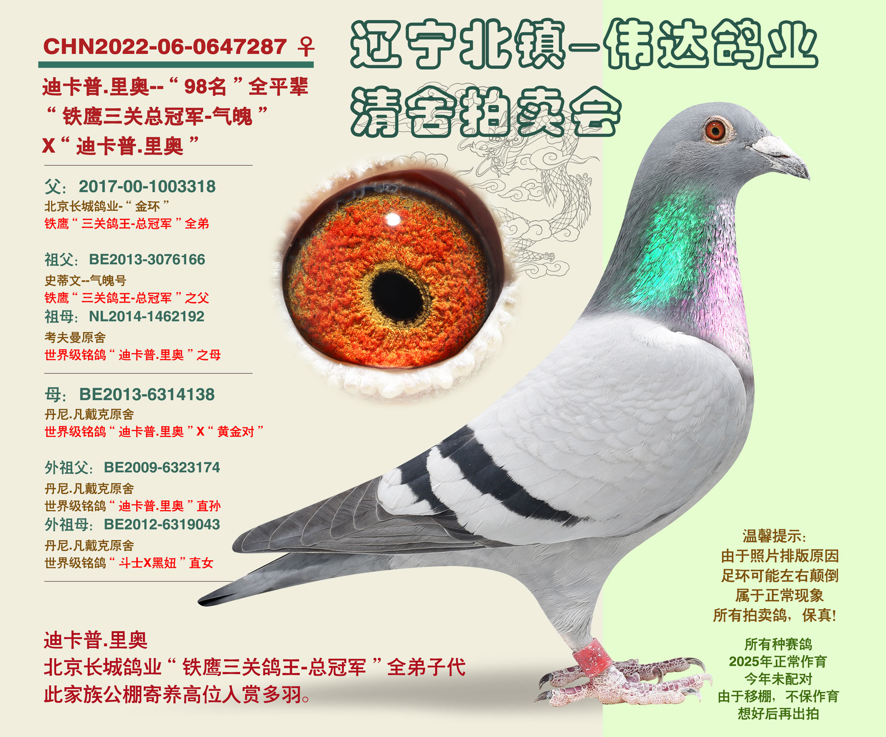 北镇伟达鸽业,鸽主由于家庭原因,全棚清舍拍卖,一羽不留,全部在中信网平台,公平竞拍,鸽主入赏率极高,仅公棚一年内获奖37羽,顶尖血统,高辈分实战种鸽,家族式发挥,此次拍卖含金量极高,希望大家珍惜!!!