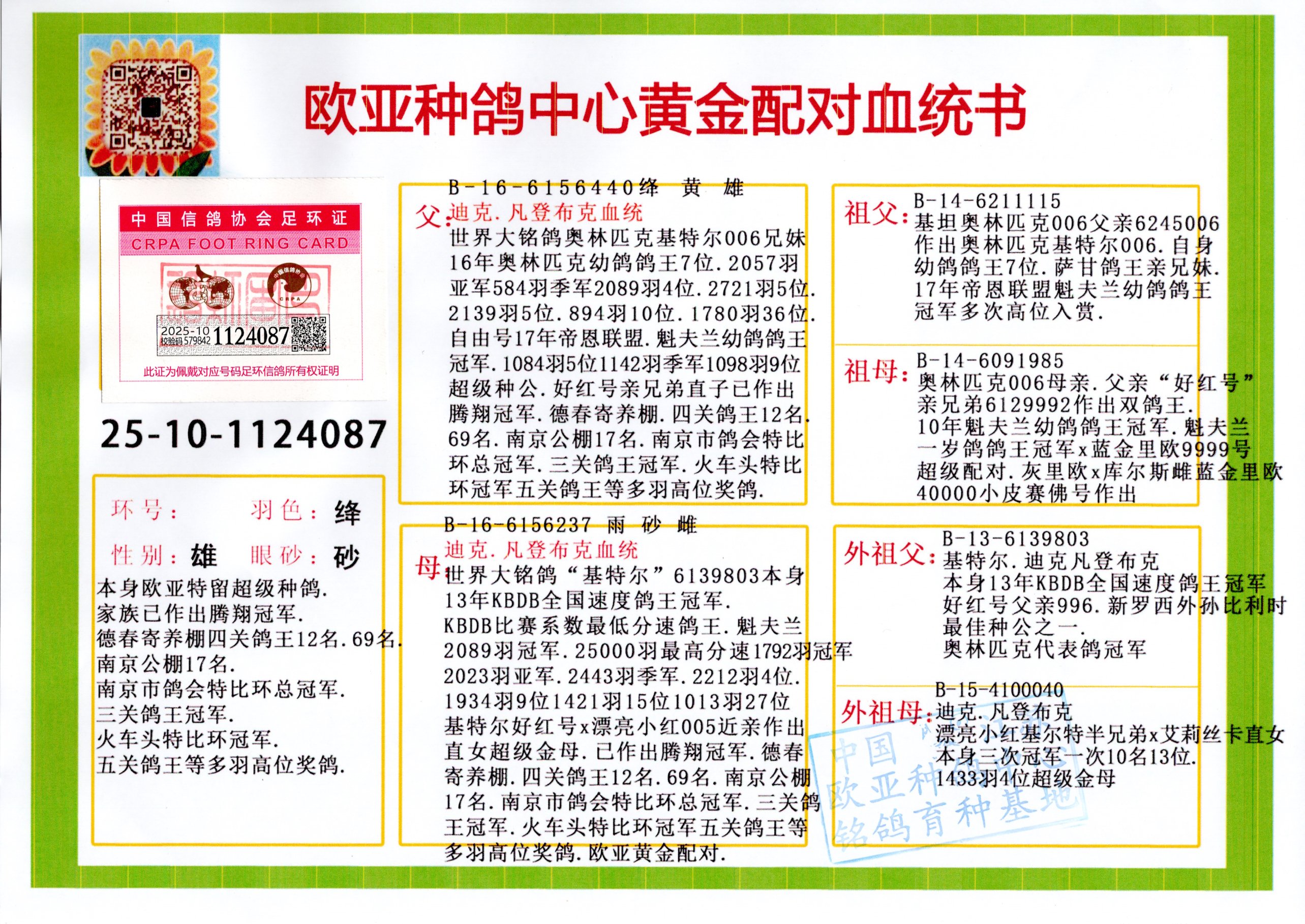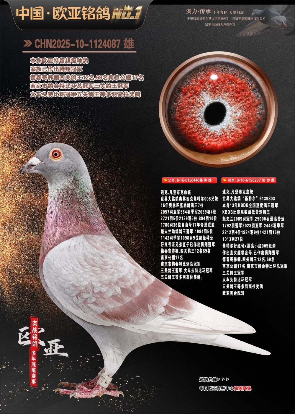 24年秋南京特比环欧亚荣获大团体冠军.小团体冠军551公里大特比13名.14名.16名.19名.20名.21名.24名.26名.27名.28名.42名.52名.54名.57名.65名.66名.68名.70名.71名.72名.74名.76名.80名.82名.83名.84名.85名.86名.90名.92名.110名.116名.121名.122名.128名.131名.158名.161名.164名.165名.166名.172名.174名.177名.182名.195名.196名.201名.205名.208名.210名.216名.253名.269名.275名.276名.294名.296名.299名,,24年秋云南天南铜都公棚决赛415名.天南铜都小棚决赛409名.云南玉活公棚决赛102名.490名.团体32名上笼二羽进二羽,天南铜都大棚506公里决赛445名。热烈祝贺河北省巨鹿县李兰生老师用欧亚泰山号血系连续十一年夺冠军,河北省国家赛冠军.全国季军等多次前十名高位,扬州王军王总用欧亚利奥24年春季获山东翔宇公棚决赛33名盖比53名。南京刘正龙刘总用欧亚盖比获得24年秋山东潍坊国际公棚决赛42名.精英赛30名.三关鸽王71名.决赛86名.加站赛16名.南京市特比环A组鸽王9名.B组鸽王5名.6名.C组鸽王5名.精英赛冠军4名.技能赛A组冠军4名.5名.秦淮区特比环荣获15名.46名.48名.87名。四川西昌徐亮徐总用欧亚利奥获得凉山州聚友决赛177名.第二关亚军双关鸽王19名.三关鸽王105名.云南豪庭公棚决赛603名。热烈祝贺24年四川重庆翔园鸽舍用欧亚泰山号荣获春季400公里冠军.秋季500公里冠军,河北王总用詹森X利奥获得千羽千翔公棚400公里冠军,广东蔡楷焕荣获24年秋爱好者 赛鸽俱乐部三关鸽王季军.一关420公里99名.二关450公里11名.三关520公里32名.单关季军.7名.12名,江西李卫兴荣获贵州红枫公棚8名.共翔俱乐部寄养棚四关综合鸽王30名.一关400公里78名.二关500公里55名.三关520公里37名.四关500公里57名.同父母获公棚18名.雷鸣获得武汉黄浦育翔中心冠军,四川陈文获得四川明鸿俱乐部300公里梦幻2名.3名.4名.9名.10名.13名.14名.15名.31名.34名.40名.41名.42名.43名.69名.71名.72名.73名.74名.94名.95名.97名.98名.99名.419公里决赛荣获总冠军7名.总共归巢9羽,四川徐亮获豪庭决赛603名,山西郑勇获得山西泰鑫公棚决赛255名詹森红狐,热烈祝贺马总获得开尔(飞跃队)决赛9名获奖金1310000万元.第一关52名,天津津福资赛180公里96名.获奖金429543万元,欧亚支持全国鸽友24年秋多人报喜 祝大家取得更好成绩,给欧亚报喜鸽友欧亚决定给每人赠送一羽超级种鸽。欧亚俱乐部特比环多关鸽王成绩:15年秋淮安特比环黑色星期一全会上笼9700多羽,当天无鸽归巢,第二天全会归巢357羽,本舍归巢158羽.前十名八羽.前一百名归巢57羽,16年春季获五关鸽王总冠军,总亚军四名.六名.七名.九名.十名.晶艺俱乐部520公里冠亚季军5名.6名.7名.9名.11名等,火车头冠军.季军6名.8名.9名.10名,16年秋晶艺俱乐部特比环520公里亚军.季军4名.6名.7名.9名,15年春南京白下特比环冠军.亚军.季军6名.7名.8名.9名.10名.指定鸽A B组获得冠军.亚军.季军4名.5名.,17年淮安特比环亚军.4名.5名.7名.8名.10名.六关鸽王总冠军.4名.6名.9名.10名,寄养棚宿迁刘总20羽特比环获冠军.季军.4名.7名.8名.9名等。18年荣获万羽特比环六关鸽王总冠军.总亚军.总季军.6名.8名.十名.单关四羽冠军.二羽亚军.四羽季军.前十名27羽。19年秋万羽特比环六关鸽王总亚军.总季军.5名.8名等,单关二羽冠军.三羽亚军.一羽季军前十名31羽。20年秋淮安市鸽会四关特比环大赛风雨无阻鸽王亚军.鸽王六名,金品俱乐部万羽特比环六关鸽王总冠军,总亚军.四名.五名.六名.七名.八名.十名.前二百名鸽王35羽,单关冠亚季军前十名四十多羽,火车头五关鸽王季军.六名.八名.前二百名鸽王十七羽。20年春荣获淮安五区一市四关鸽王总冠军.亚军.四名.八名.九名。21年秋荣获金品万羽特比环大赛六关鸽王总亚军.总季军.四名.七名.九名.十名.单关冠亚军季军前十名三十多羽。火车头协会鸽王六名.七名.十名.单关前十名十七羽。22年秋荣获鸽王总冠军.总亚军.5名.7名.8名.9名.11名.单关冠亚季军前十名三十多羽,第一关单关前二百名四十多羽,第二关前二百名三十多羽,第三关前二百名四十多羽,第四关前二百名四十多羽,第五关前一百名53羽。23年秋荣获鸽王季军.五名.八名.十名.13名.17名.20名.27名等多羽鸽王.单关前十名二十多羽。公棚.寄养棚部分成绩:16年秋宁夏黄河公棚总冠军电脑戈马力指定通炮冠军,17年送八羽参赛获得鸽王八名进奖四名,支持韩总荣获八名。支持鸽友荣获宁夏中卫公棚决赛总冠军.精英赛冠军,支持18年宁夏黄河公棚决赛冠军詹森X泰山。安徽鼎博寄养棚院内外四关鸽王总冠军.鸽王十七名.三十七名同窝,鸽王39名.42名.58名.67名。18年山东公棚预赛冠军.决赛65名.送八羽进奖五羽.指定获奔驰汽车一辆。支持鸽友获得云南蓝云公棚冠军.盖比X佛卡门。支持鸽友荣获云南银集公棚决赛冠军 詹森427X520血系 速度赛6700羽冠军。17年荣获金马俱乐部寄养棚四关鸽王总冠军.季军.六名.八名.第一关冠军.亚军.季军四名.七名.十一名.金牌教练奖。支持鸽友18年北京费翔公棚预赛九名电脑X桑杰士,支持鸽友荣获陕西威力公棚决赛11名.内蒙古临河寄养棚四关鸽王六名.詹森配泰山,支持河北王总用欧亚詹森427配胡本喜获20年秋开尔青年棚季军。云南东荣公棚16年预赛冠军.决赛77名.17年决赛12名.詹森红狐X泰山,17年平安公棚决赛4名 詹森427。欧亚获得21年金母寄养棚第一关四名.第二关5名.第三关5名.6名.7名.10名.三关鸽王总冠军,四关鸽王14名.十羽鸽王。支持河