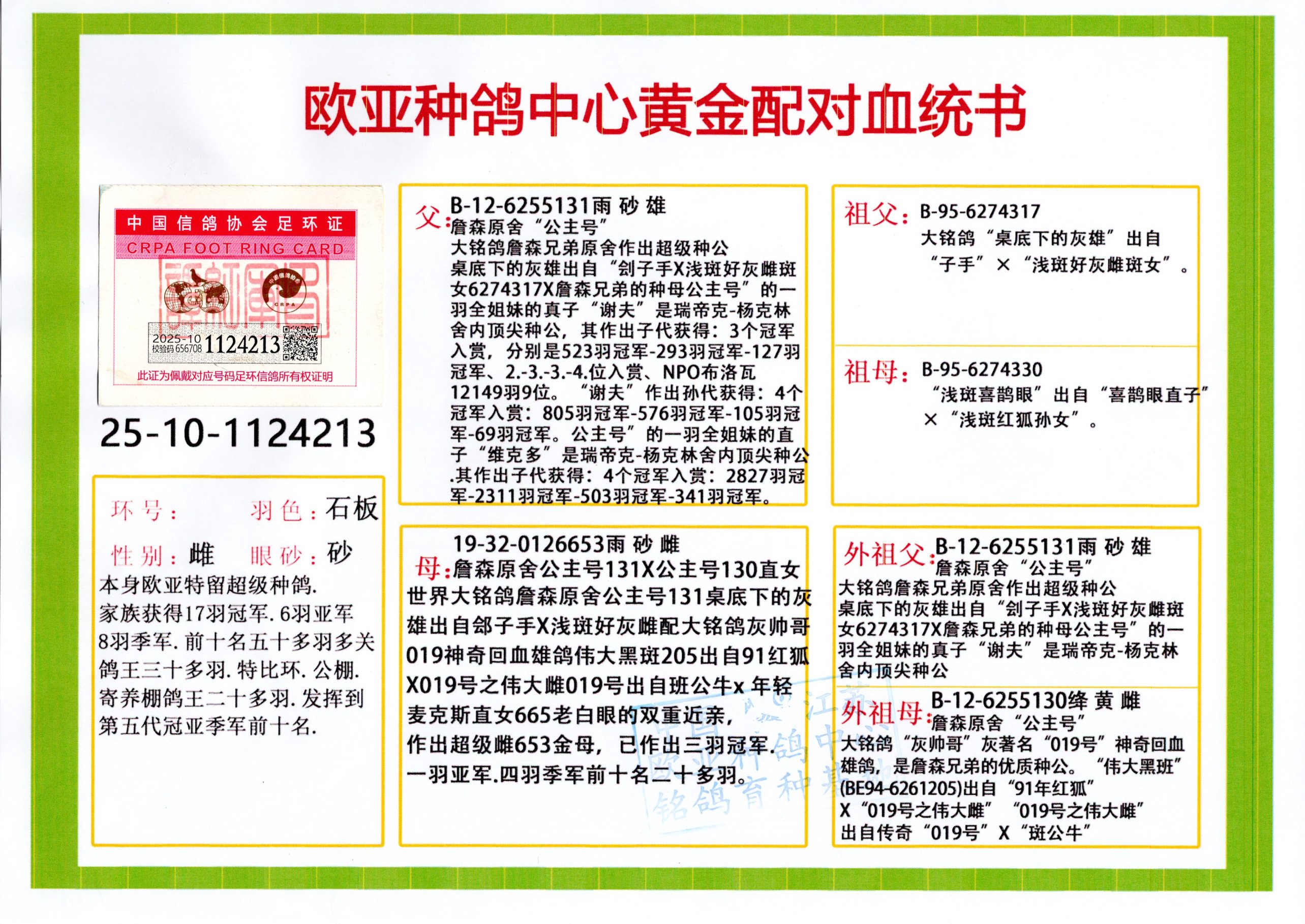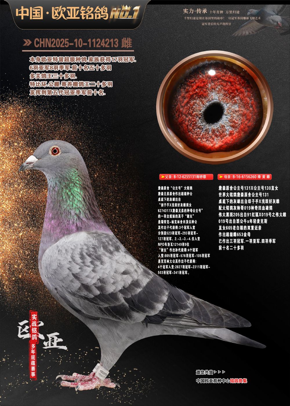 24年秋南京特比环欧亚荣获大团体冠军.小团体冠军551公里大特比13名.14名.16名.19名.20名.21名.24名.26名.27名.28名.42名.52名.54名.57名.65名.66名.68名.70名.71名.72名.74名.76名.80名.82名.83名.84名.85名.86名.90名.92名.110名.116名.121名.122名.128名.131名.158名.161名.164名.165名.166名.172名.174名.177名.182名.195名.196名.201名.205名.208名.210名.216名.253名.269名.275名.276名.294名.296名.299名,,24年秋云南天南铜都公棚决赛415名.天南铜都小棚决赛409名.云南玉活公棚决赛102名.490名.团体32名上笼二羽进二羽,天南铜都大棚506公里决赛445名。热烈祝贺河北省巨鹿县李兰生老师用欧亚泰山号血系连续十一年夺冠军,河北省国家赛冠军.全国季军等多次前十名高位,扬州王军王总用欧亚利奥24年春季获山东翔宇公棚决赛33名盖比53名。南京刘正龙刘总用欧亚盖比获得24年秋山东潍坊国际公棚决赛42名.精英赛30名.三关鸽王71名.决赛86名.加站赛16名.南京市特比环A组鸽王9名.B组鸽王5名.6名.C组鸽王5名.精英赛冠军4名.技能赛A组冠军4名.5名.秦淮区特比环荣获15名.46名.48名.87名。四川西昌徐亮徐总用欧亚利奥获得凉山州聚友决赛177名.第二关亚军双关鸽王19名.三关鸽王105名.云南豪庭公棚决赛603名。热烈祝贺24年四川重庆翔园鸽舍用欧亚泰山号荣获春季400公里冠军.秋季500公里冠军,河北王总用詹森X利奥获得千羽千翔公棚400公里冠军,广东蔡楷焕荣获24年秋爱好者 赛鸽俱乐部三关鸽王季军.一关420公里99名.二关450公里11名.三关520公里32名.单关季军.7名.12名,江西李卫兴荣获贵州红枫公棚8名.共翔俱乐部寄养棚四关综合鸽王30名.一关400公里78名.二关500公里55名.三关520公里37名.四关500公里57名.同父母获公棚18名.雷鸣获得武汉黄浦育翔中心冠军,四川陈文获得四川明鸿俱乐部300公里梦幻2名.3名.4名.9名.10名.13名.14名.15名.31名.34名.40名.41名.42名.43名.69名.71名.72名.73名.74名.94名.95名.97名.98名.99名.419公里决赛荣获总冠军7名.总共归巢9羽,四川徐亮获豪庭决赛603名,山西郑勇获得山西泰鑫公棚决赛255名詹森红狐,热烈祝贺马总获得开尔(飞跃队)决赛9名获奖金1310000万元.第一关52名,天津津福资赛180公里96名.获奖金429543万元,欧亚支持全国鸽友24年秋多人报喜 祝大家取得更好成绩,给欧亚报喜鸽友欧亚决定给每人赠送一羽超级种鸽。欧亚俱乐部特比环多关鸽王成绩:15年秋淮安特比环黑色星期一全会上笼9700多羽,当天无鸽归巢,第二天全会归巢357羽,本舍归巢158羽.前十名八羽.前一百名归巢57羽,16年春季获五关鸽王总冠军,总亚军四名.六名.七名.九名.十名.晶艺俱乐部520公里冠亚季军5名.6名.7名.9名.11名等,火车头冠军.季军6名.8名.9名.10名,16年秋晶艺俱乐部特比环520公里亚军.季军4名.6名.7名.9名,15年春南京白下特比环冠军.亚军.季军6名.7名.8名.9名.10名.指定鸽A B组获得冠军.亚军.季军4名.5名.,17年淮安特比环亚军.4名.5名.7名.8名.10名.六关鸽王总冠军.4名.6名.9名.10名,寄养棚宿迁刘总20羽特比环获冠军.季军.4名.7名.8名.9名等。18年荣获万羽特比环六关鸽王总冠军.总亚军.总季军.6名.8名.十名.单关四羽冠军.二羽亚军.四羽季军.前十名27羽。19年秋万羽特比环六关鸽王总亚军.总季军.5名.8名等,单关二羽冠军.三羽亚军.一羽季军前十名31羽。20年秋淮安市鸽会四关特比环大赛风雨无阻鸽王亚军.鸽王六名,金品俱乐部万羽特比环六关鸽王总冠军,总亚军.四名.五名.六名.七名.八名.十名.前二百名鸽王35羽,单关冠亚季军前十名四十多羽,火车头五关鸽王季军.六名.八名.前二百名鸽王十七羽。20年春荣获淮安五区一市四关鸽王总冠军.亚军.四名.八名.九名。21年秋荣获金品万羽特比环大赛六关鸽王总亚军.总季军.四名.七名.九名.十名.单关冠亚军季军前十名三十多羽。火车头协会鸽王六名.七名.十名.单关前十名十七羽。22年秋荣获鸽王总冠军.总亚军.5名.7名.8名.9名.11名.单关冠亚季军前十名三十多羽,第一关单关前二百名四十多羽,第二关前二百名三十多羽,第三关前二百名四十多羽,第四关前二百名四十多羽,第五关前一百名53羽。23年秋荣获鸽王季军.五名.八名.十名.13名.17名.20名.27名等多羽鸽王.单关前十名二十多羽。公棚.寄养棚部分成绩:16年秋宁夏黄河公棚总冠军电脑戈马力指定通炮冠军,17年送八羽参赛获得鸽王八名进奖四名,支持韩总荣获八名。支持鸽友荣获宁夏中卫公棚决赛总冠军.精英赛冠军,支持18年宁夏黄河公棚决赛冠军詹森X泰山。安徽鼎博寄养棚院内外四关鸽王总冠军.鸽王十七名.三十七名同窝,鸽王39名.42名.58名.67名。18年山东公棚预赛冠军.决赛65名.送八羽进奖五羽.指定获奔驰汽车一辆。支持鸽友获得云南蓝云公棚冠军.盖比X佛卡门。支持鸽友荣获云南银集公棚决赛冠军 詹森427X520血系 速度赛6700羽冠军。17年荣获金马俱乐部寄养棚四关鸽王总冠军.季军.六名.八名.第一关冠军.亚军.季军四名.七名.十一名.金牌教练奖。支持鸽友18年北京费翔公棚预赛九名电脑X桑杰士,支持鸽友荣获陕西威力公棚决赛11名.内蒙古临河寄养棚四关鸽王六名.詹森配泰山,支持河北王总用欧亚詹森427配胡本喜获20年秋开尔青年棚季军。云南东荣公棚16年预赛冠军.决赛77名.17年决赛12名.詹森红狐X泰山,17年平安公棚决赛4名 詹森427。欧亚获得21年金母寄养棚第一关四名.第二关5名.第三关5名.6名.7名.10名.三关鸽王总冠军,四关鸽王14名.十羽鸽王。支持河