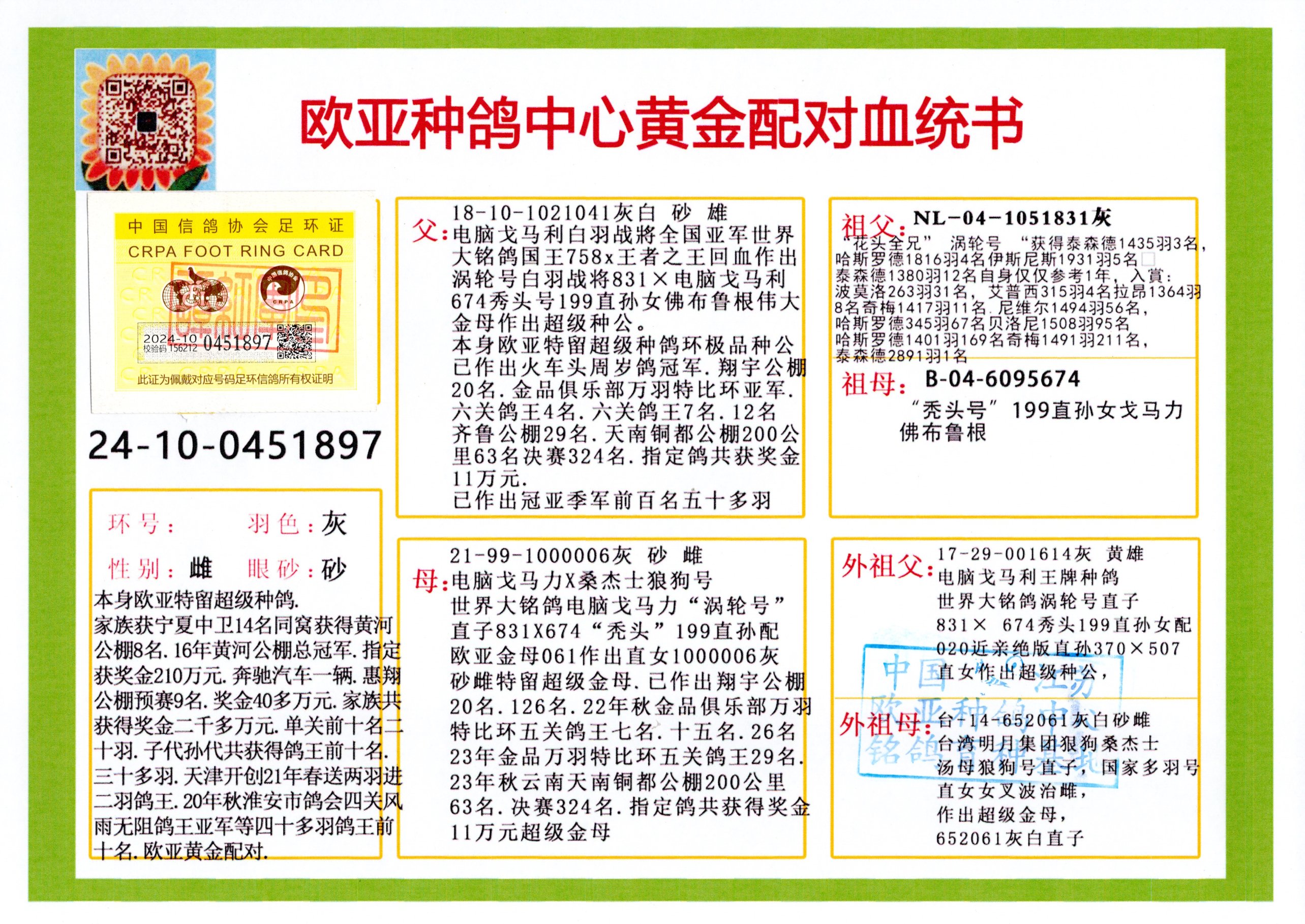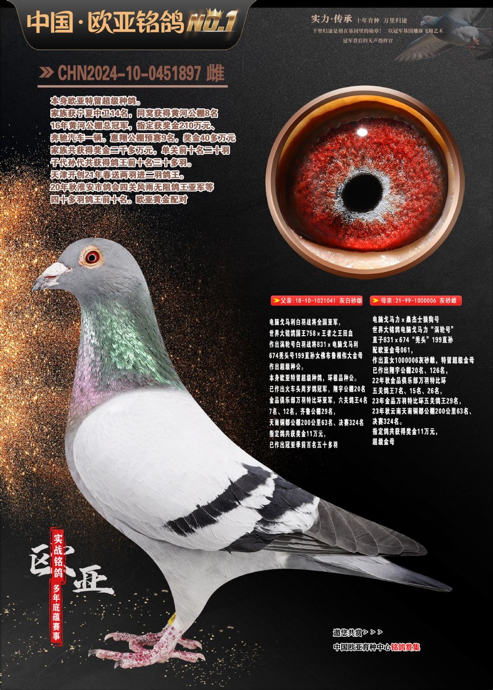 24年秋南京特比环欧亚荣获大团体冠军.小团体冠军551公里大特比13名.14名.16名.19名.20名.21名.24名.26名.27名.28名.42名.52名.54名.57名.65名.66名.68名.70名.71名.72名.74名.76名.80名.82名.83名.84名.85名.86名.90名.92名.110名.116名.121名.122名.128名.131名.158名.161名.164名.165名.166名.172名.174名.177名.182名.195名.196名.201名.205名.208名.210名.216名.253名.269名.275名.276名.294名.296名.299名,,24年秋云南天南铜都公棚决赛415名.天南铜都小棚决赛409名.云南玉活公棚决赛102名.490名.团体32名上笼二羽进二羽,天南铜都大棚506公里决赛445名。热烈祝贺河北省巨鹿县李兰生老师用欧亚泰山号血系连续十一年夺冠军,河北省国家赛冠军.全国季军等多次前十名高位,扬州王军王总用欧亚利奥24年春季获山东翔宇公棚决赛33名盖比53名。南京刘正龙刘总用欧亚盖比获得24年秋山东潍坊国际公棚决赛42名.精英赛30名.三关鸽王71名.决赛86名.加站赛16名.南京市特比环A组鸽王9名.B组鸽王5名.6名.C组鸽王5名.精英赛冠军4名.技能赛A组冠军4名.5名.秦淮区特比环荣获15名.46名.48名.87名。四川西昌徐亮徐总用欧亚利奥获得凉山州聚友决赛177名.第二关亚军双关鸽王19名.三关鸽王105名.云南豪庭公棚决赛603名。热烈祝贺24年四川重庆翔园鸽舍用欧亚泰山号荣获春季400公里冠军.秋季500公里冠军,河北王总用詹森X利奥获得千羽千翔公棚400公里冠军,广东蔡楷焕荣获24年秋爱好者 赛鸽俱乐部三关鸽王季军.一关420公里99名.二关450公里11名.三关520公里32名.单关季军.7名.12名,江西李卫兴荣获贵州红枫公棚8名.共翔俱乐部寄养棚四关综合鸽王30名.一关400公里78名.二关500公里55名.三关520公里37名.四关500公里57名.同父母获公棚18名.雷鸣获得武汉黄浦育翔中心冠军,四川陈文获得四川明鸿俱乐部300公里梦幻2名.3名.4名.9名.10名.13名.14名.15名.31名.34名.40名.41名.42名.43名.69名.71名.72名.73名.74名.94名.95名.97名.98名.99名.419公里决赛荣获总冠军7名.总共归巢9羽,四川徐亮获豪庭决赛603名,山西郑勇获得山西泰鑫公棚决赛255名詹森红狐,热烈祝贺马总获得开尔(飞跃队)决赛9名获奖金1310000万元.第一关52名,天津津福资赛180公里96名.获奖金429543万元,欧亚支持全国鸽友24年秋多人报喜 祝大家取得更好成绩,给欧亚报喜鸽友欧亚决定给每人赠送一羽超级种鸽。欧亚俱乐部特比环多关鸽王成绩:15年秋淮安特比环黑色星期一全会上笼9700多羽,当天无鸽归巢,第二天全会归巢357羽,本舍归巢158羽.前十名八羽.前一百名归巢57羽,16年春季获五关鸽王总冠军,总亚军四名.六名.七名.九名.十名.晶艺俱乐部520公里冠亚季军5名.6名.7名.9名.11名等,火车头冠军.季军6名.8名.9名.10名,16年秋晶艺俱乐部特比环520公里亚军.季军4名.6名.7名.9名,15年春南京白下特比环冠军.亚军.季军6名.7名.8名.9名.10名.指定鸽A B组获得冠军.亚军.季军4名.5名.,17年淮安特比环亚军.4名.5名.7名.8名.10名.六关鸽王总冠军.4名.6名.9名.10名,寄养棚宿迁刘总20羽特比环获冠军.季军.4名.7名.8名.9名等。18年荣获万羽特比环六关鸽王总冠军.总亚军.总季军.6名.8名.十名.单关四羽冠军.二羽亚军.四羽季军.前十名27羽。19年秋万羽特比环六关鸽王总亚军.总季军.5名.8名等,单关二羽冠军.三羽亚军.一羽季军前十名31羽。20年秋淮安市鸽会四关特比环大赛风雨无阻鸽王亚军.鸽王六名,金品俱乐部万羽特比环六关鸽王总冠军,总亚军.四名.五名.六名.七名.八名.十名.前二百名鸽王35羽,单关冠亚季军前十名四十多羽,火车头五关鸽王季军.六名.八名.前二百名鸽王十七羽。20年春荣获淮安五区一市四关鸽王总冠军.亚军.四名.八名.九名。21年秋荣获金品万羽特比环大赛六关鸽王总亚军.总季军.四名.七名.九名.十名.单关冠亚军季军前十名三十多羽。火车头协会鸽王六名.七名.十名.单关前十名十七羽。22年秋荣获鸽王总冠军.总亚军.5名.7名.8名.9名.11名.单关冠亚季军前十名三十多羽,第一关单关前二百名四十多羽,第二关前二百名三十多羽,第三关前二百名四十多羽,第四关前二百名四十多羽,第五关前一百名53羽。23年秋荣获鸽王季军.五名.八名.十名.13名.17名.20名.27名等多羽鸽王.单关前十名二十多羽。公棚.寄养棚部分成绩:16年秋宁夏黄河公棚总冠军电脑戈马力指定通炮冠军,17年送八羽参赛获得鸽王八名进奖四名,支持韩总荣获八名。支持鸽友荣获宁夏中卫公棚决赛总冠军.精英赛冠军,支持18年宁夏黄河公棚决赛冠军詹森X泰山。安徽鼎博寄养棚院内外四关鸽王总冠军.鸽王十七名.三十七名同窝,鸽王39名.42名.58名.67名。18年山东公棚预赛冠军.决赛65名.送八羽进奖五羽.指定获奔驰汽车一辆。支持鸽友获得云南蓝云公棚冠军.盖比X佛卡门。支持鸽友荣获云南银集公棚决赛冠军 詹森427X520血系 速度赛6700羽冠军。17年荣获金马俱乐部寄养棚四关鸽王总冠军.季军.六名.八名.第一关冠军.亚军.季军四名.七名.十一名.金牌教练奖。支持鸽友18年北京费翔公棚预赛九名电脑X桑杰士,支持鸽友荣获陕西威力公棚决赛11名.内蒙古临河寄养棚四关鸽王六名.詹森配泰山,支持河北王总用欧亚詹森427配胡本喜获20年秋开尔青年棚季军。云南东荣公棚16年预赛冠军.决赛77名.17年决赛12名.詹森红狐X泰山,17年平安公棚决赛4名 詹森427。欧亚获得21年金母寄养棚第一关四名.第二关5名.第三关5名.6名.7名.10名.三关鸽王总冠军,四关鸽王14名.十羽鸽王。支持河