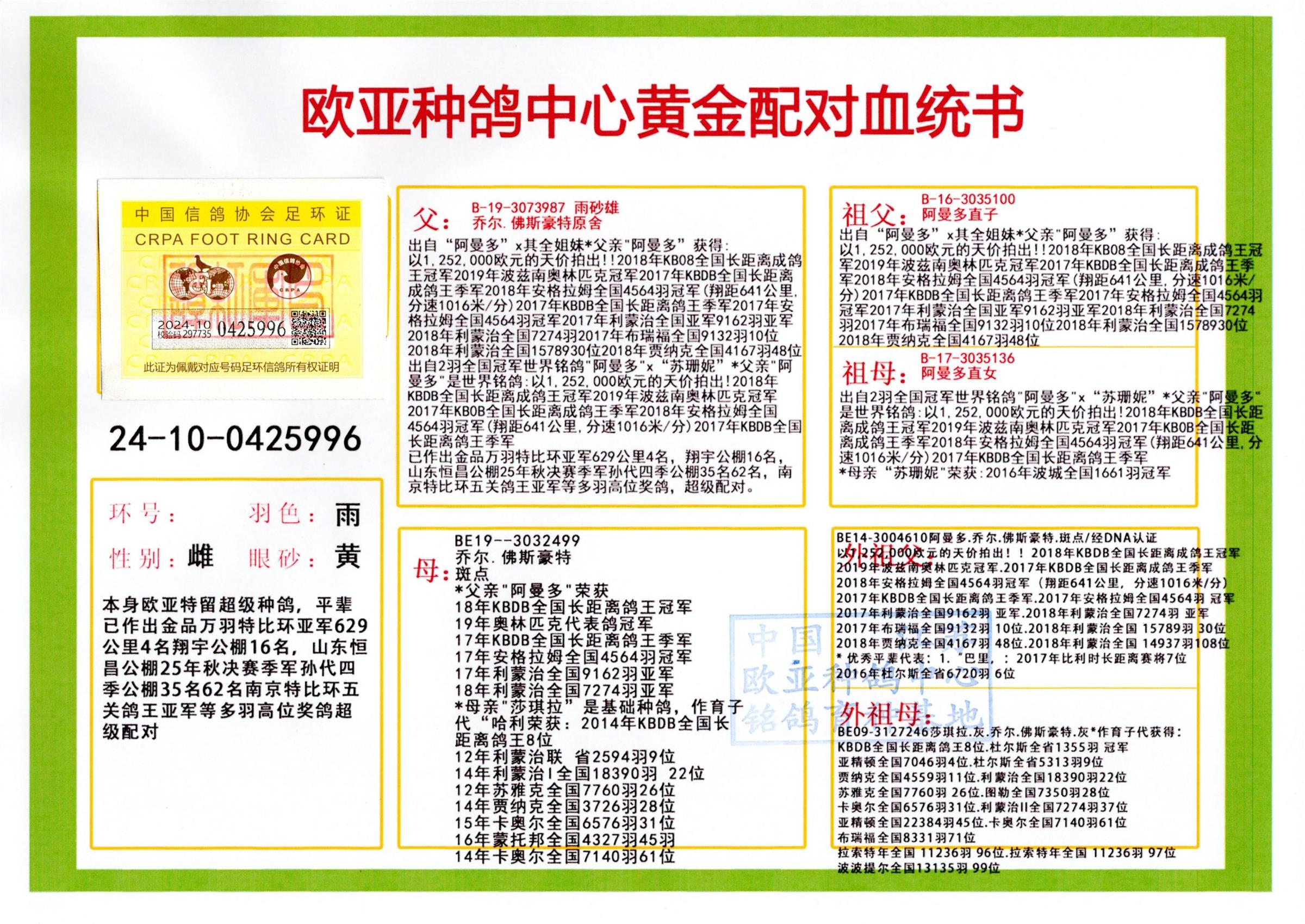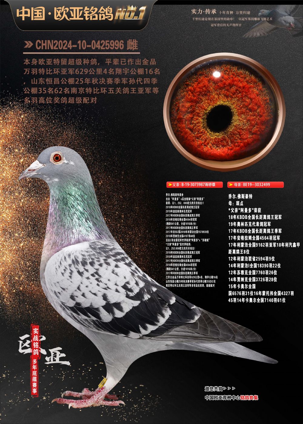 24年秋南京特比环欧亚荣获大团体冠军.小团体冠军551公里大特比13名.14名.16名.19名.20名.21名.24名.26名.27名.28名.42名.52名.54名.57名.65名.66名.68名.70名.71名.72名.74名.76名.80名.82名.83名.84名.85名.86名.90名.92名.110名.116名.121名.122名.128名.131名.158名.161名.164名.165名.166名.172名.174名.177名.182名.195名.196名.201名.205名.208名.210名.216名.253名.269名.275名.276名.294名.296名.299名,,24年秋云南天南铜都公棚决赛415名.天南铜都小棚决赛409名.云南玉活公棚决赛102名.490名.团体32名上笼二羽进二羽,天南铜都大棚506公里决赛445名。热烈祝贺河北省巨鹿县李兰生老师用欧亚泰山号血系连续十一年夺冠军,河北省国家赛冠军.全国季军等多次前十名高位,扬州王军王总用欧亚利奥24年春季获山东翔宇公棚决赛33名盖比53名。南京刘正龙刘总用欧亚盖比获得24年秋山东潍坊国际公棚决赛42名.精英赛30名.三关鸽王71名.决赛86名.加站赛16名.南京市特比环A组鸽王9名.B组鸽王5名.6名.C组鸽王5名.精英赛冠军4名.技能赛A组冠军4名.5名.秦淮区特比环荣获15名.46名.48名.87名。四川西昌徐亮徐总用欧亚利奥获得凉山州聚友决赛177名.第二关亚军双关鸽王19名.三关鸽王105名.云南豪庭公棚决赛603名。热烈祝贺24年四川重庆翔园鸽舍用欧亚泰山号荣获春季400公里冠军.秋季500公里冠军,河北王总用詹森X利奥获得千羽千翔公棚400公里冠军,广东蔡楷焕荣获24年秋爱好者 赛鸽俱乐部三关鸽王季军.一关420公里99名.二关450公里11名.三关520公里32名.单关季军.7名.12名,江西李卫兴荣获贵州红枫公棚8名.共翔俱乐部寄养棚四关综合鸽王30名.一关400公里78名.二关500公里55名.三关520公里37名.四关500公里57名.同父母获公棚18名.雷鸣获得武汉黄浦育翔中心冠军,四川陈文获得四川明鸿俱乐部300公里梦幻2名.3名.4名.9名.10名.13名.14名.15名.31名.34名.40名.41名.42名.43名.69名.71名.72名.73名.74名.94名.95名.97名.98名.99名.419公里决赛荣获总冠军7名.总共归巢9羽,四川徐亮获豪庭决赛603名,山西郑勇获得山西泰鑫公棚决赛255名詹森红狐,热烈祝贺马总获得开尔(飞跃队)决赛9名获奖金1310000万元.第一关52名,天津津福资赛180公里96名.获奖金429543万元,欧亚支持全国鸽友24年秋多人报喜 祝大家取得更好成绩,给欧亚报喜鸽友欧亚决定给每人赠送一羽超级种鸽。欧亚俱乐部特比环多关鸽王成绩:15年秋淮安特比环黑色星期一全会上笼9700多羽,当天无鸽归巢,第二天全会归巢357羽,本舍归巢158羽.前十名八羽.前一百名归巢57羽,16年春季获五关鸽王总冠军,总亚军四名.六名.七名.九名.十名.晶艺俱乐部520公里冠亚季军5名.6名.7名.9名.11名等,火车头冠军.季军6名.8名.9名.10名,16年秋晶艺俱乐部特比环520公里亚军.季军4名.6名.7名.9名,15年春南京白下特比环冠军.亚军.季军6名.7名.8名.9名.10名.指定鸽A B组获得冠军.亚军.季军4名.5名.,17年淮安特比环亚军.4名.5名.7名.8名.10名.六关鸽王总冠军.4名.6名.9名.10名,寄养棚宿迁刘总20羽特比环获冠军.季军.4名.7名.8名.9名等。18年荣获万羽特比环六关鸽王总冠军.总亚军.总季军.6名.8名.十名.单关四羽冠军.二羽亚军.四羽季军.前十名27羽。19年秋万羽特比环六关鸽王总亚军.总季军.5名.8名等,单关二羽冠军.三羽亚军.一羽季军前十名31羽。20年秋淮安市鸽会四关特比环大赛风雨无阻鸽王亚军.鸽王六名,金品俱乐部万羽特比环六关鸽王总冠军,总亚军.四名.五名.六名.七名.八名.十名.前二百名鸽王35羽,单关冠亚季军前十名四十多羽,火车头五关鸽王季军.六名.八名.前二百名鸽王十七羽。20年春荣获淮安五区一市四关鸽王总冠军.亚军.四名.八名.九名。21年秋荣获金品万羽特比环大赛六关鸽王总亚军.总季军.四名.七名.九名.十名.单关冠亚军季军前十名三十多羽。火车头协会鸽王六名.七名.十名.单关前十名十七羽。22年秋荣获鸽王总冠军.总亚军.5名.7名.8名.9名.11名.单关冠亚季军前十名三十多羽,第一关单关前二百名四十多羽,第二关前二百名三十多羽,第三关前二百名四十多羽,第四关前二百名四十多羽,第五关前一百名53羽。23年秋荣获鸽王季军.五名.八名.十名.13名.17名.20名.27名等多羽鸽王.单关前十名二十多羽。公棚.寄养棚部分成绩:16年秋宁夏黄河公棚总冠军电脑戈马力指定通炮冠军,17年送八羽参赛获得鸽王八名进奖四名,支持韩总荣获八名。支持鸽友荣获宁夏中卫公棚决赛总冠军.精英赛冠军,支持18年宁夏黄河公棚决赛冠军詹森X泰山。安徽鼎博寄养棚院内外四关鸽王总冠军.鸽王十七名.三十七名同窝,鸽王39名.42名.58名.67名。18年山东公棚预赛冠军.决赛65名.送八羽进奖五羽.指定获奔驰汽车一辆。支持鸽友获得云南蓝云公棚冠军.盖比X佛卡门。支持鸽友荣获云南银集公棚决赛冠军 詹森427X520血系 速度赛6700羽冠军。17年荣获金马俱乐部寄养棚四关鸽王总冠军.季军.六名.八名.第一关冠军.亚军.季军四名.七名.十一名.金牌教练奖。支持鸽友18年北京费翔公棚预赛九名电脑X桑杰士,支持鸽友荣获陕西威力公棚决赛11名.内蒙古临河寄养棚四关鸽王六名.詹森配泰山,支持河北王总用欧亚詹森427配胡本喜获20年秋开尔青年棚季军。云南东荣公棚16年预赛冠军.决赛77名.17年决赛12名.詹森红狐X泰山,17年平安公棚决赛4名 詹森427。欧亚获得21年金母寄养棚第一关四名.第二关5名.第三关5名.6名.7名.10名.三关鸽王总冠军,四关鸽王14名.十羽鸽王。支持河
