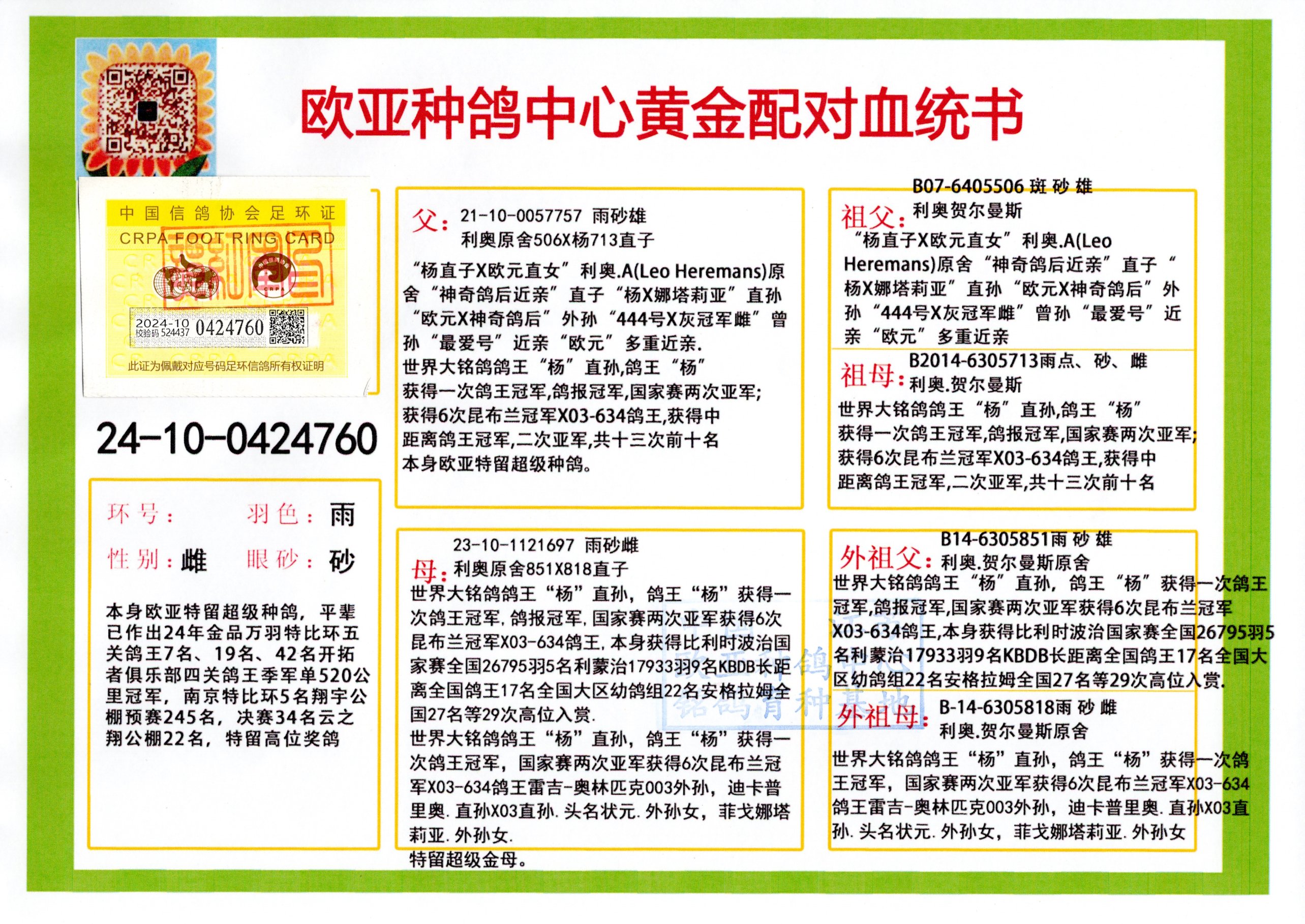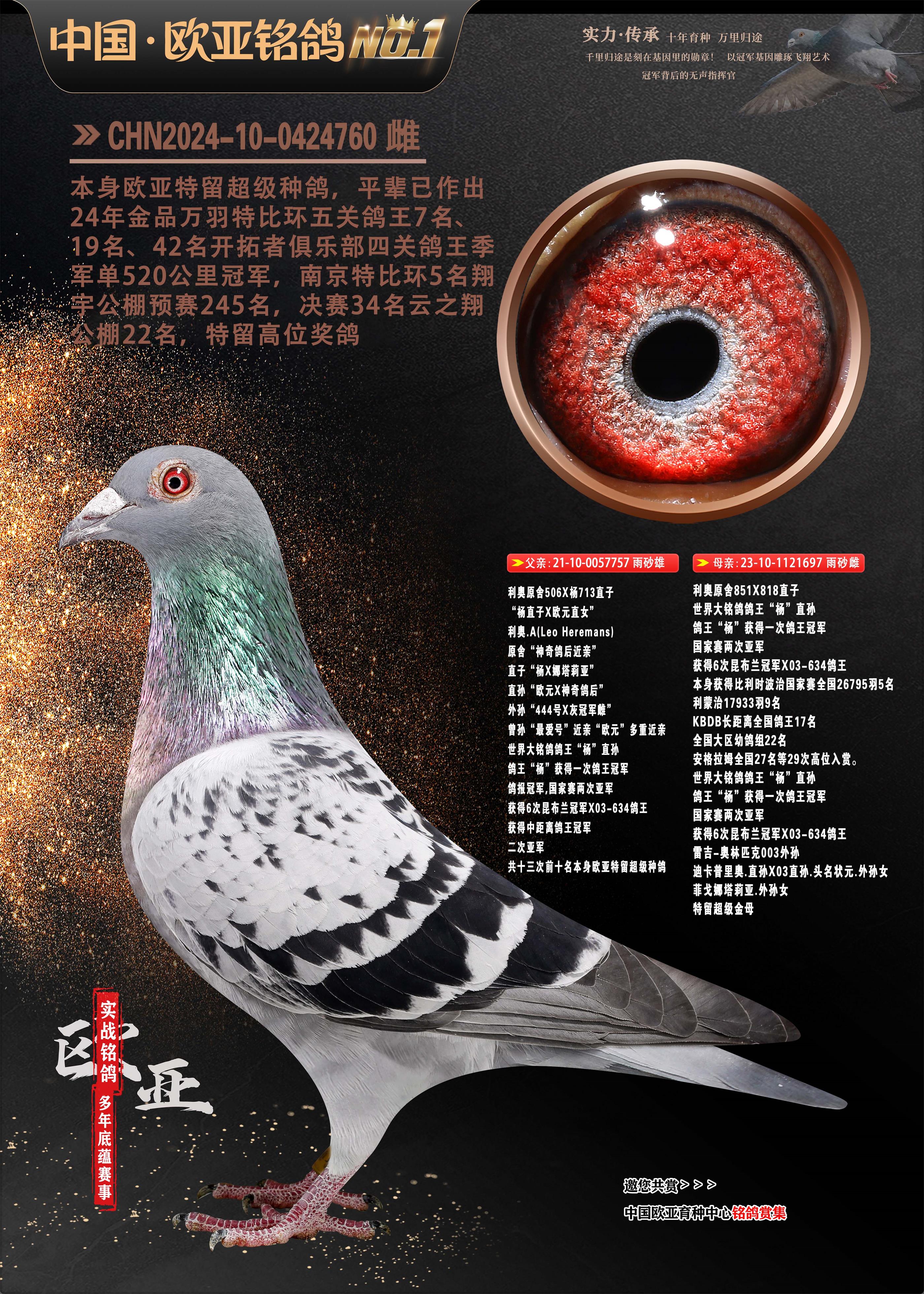 24年秋南京特比环欧亚荣获大团体冠军.小团体冠军551公里大特比13名.14名.16名.19名.20名.21名.24名.26名.27名.28名.42名.52名.54名.57名.65名.66名.68名.70名.71名.72名.74名.76名.80名.82名.83名.84名.85名.86名.90名.92名.110名.116名.121名.122名.128名.131名.158名.161名.164名.165名.166名.172名.174名.177名.182名.195名.196名.201名.205名.208名.210名.216名.253名.269名.275名.276名.294名.296名.299名,,24年秋云南天南铜都公棚决赛415名.天南铜都小棚决赛409名.云南玉活公棚决赛102名.490名.团体32名上笼二羽进二羽,天南铜都大棚506公里决赛445名。热烈祝贺河北省巨鹿县李兰生老师用欧亚泰山号血系连续十一年夺冠军,河北省国家赛冠军.全国季军等多次前十名高位,扬州王军王总用欧亚利奥24年春季获山东翔宇公棚决赛33名盖比53名。南京刘正龙刘总用欧亚盖比获得24年秋山东潍坊国际公棚决赛42名.精英赛30名.三关鸽王71名.决赛86名.加站赛16名.南京市特比环A组鸽王9名.B组鸽王5名.6名.C组鸽王5名.精英赛冠军4名.技能赛A组冠军4名.5名.秦淮区特比环荣获15名.46名.48名.87名。四川西昌徐亮徐总用欧亚利奥获得凉山州聚友决赛177名.第二关亚军双关鸽王19名.三关鸽王105名.云南豪庭公棚决赛603名。热烈祝贺24年四川重庆翔园鸽舍用欧亚泰山号荣获春季400公里冠军.秋季500公里冠军,河北王总用詹森X利奥获得千羽千翔公棚400公里冠军,广东蔡楷焕荣获24年秋爱好者 赛鸽俱乐部三关鸽王季军.一关420公里99名.二关450公里11名.三关520公里32名.单关季军.7名.12名,江西李卫兴荣获贵州红枫公棚8名.共翔俱乐部寄养棚四关综合鸽王30名.一关400公里78名.二关500公里55名.三关520公里37名.四关500公里57名.同父母获公棚18名.雷鸣获得武汉黄浦育翔中心冠军,四川陈文获得四川明鸿俱乐部300公里梦幻2名.3名.4名.9名.10名.13名.14名.15名.31名.34名.40名.41名.42名.43名.69名.71名.72名.73名.74名.94名.95名.97名.98名.99名.419公里决赛荣获总冠军7名.总共归巢9羽,四川徐亮获豪庭决赛603名,山西郑勇获得山西泰鑫公棚决赛255名詹森红狐,热烈祝贺马总获得开尔(飞跃队)决赛9名获奖金1310000万元.第一关52名,天津津福资赛180公里96名.获奖金429543万元,欧亚支持全国鸽友24年秋多人报喜 祝大家取得更好成绩,给欧亚报喜鸽友欧亚决定给每人赠送一羽超级种鸽。欧亚俱乐部特比环多关鸽王成绩:15年秋淮安特比环黑色星期一全会上笼9700多羽,当天无鸽归巢,第二天全会归巢357羽,本舍归巢158羽.前十名八羽.前一百名归巢57羽,16年春季获五关鸽王总冠军,总亚军四名.六名.七名.九名.十名.晶艺俱乐部520公里冠亚季军5名.6名.7名.9名.11名等,火车头冠军.季军6名.8名.9名.10名,16年秋晶艺俱乐部特比环520公里亚军.季军4名.6名.7名.9名,15年春南京白下特比环冠军.亚军.季军6名.7名.8名.9名.10名.指定鸽A B组获得冠军.亚军.季军4名.5名.,17年淮安特比环亚军.4名.5名.7名.8名.10名.六关鸽王总冠军.4名.6名.9名.10名,寄养棚宿迁刘总20羽特比环获冠军.季军.4名.7名.8名.9名等。18年荣获万羽特比环六关鸽王总冠军.总亚军.总季军.6名.8名.十名.单关四羽冠军.二羽亚军.四羽季军.前十名27羽。19年秋万羽特比环六关鸽王总亚军.总季军.5名.8名等,单关二羽冠军.三羽亚军.一羽季军前十名31羽。20年秋淮安市鸽会四关特比环大赛风雨无阻鸽王亚军.鸽王六名,金品俱乐部万羽特比环六关鸽王总冠军,总亚军.四名.五名.六名.七名.八名.十名.前二百名鸽王35羽,单关冠亚季军前十名四十多羽,火车头五关鸽王季军.六名.八名.前二百名鸽王十七羽。20年春荣获淮安五区一市四关鸽王总冠军.亚军.四名.八名.九名。21年秋荣获金品万羽特比环大赛六关鸽王总亚军.总季军.四名.七名.九名.十名.单关冠亚军季军前十名三十多羽。火车头协会鸽王六名.七名.十名.单关前十名十七羽。22年秋荣获鸽王总冠军.总亚军.5名.7名.8名.9名.11名.单关冠亚季军前十名三十多羽,第一关单关前二百名四十多羽,第二关前二百名三十多羽,第三关前二百名四十多羽,第四关前二百名四十多羽,第五关前一百名53羽。23年秋荣获鸽王季军.五名.八名.十名.13名.17名.20名.27名等多羽鸽王.单关前十名二十多羽。公棚.寄养棚部分成绩:16年秋宁夏黄河公棚总冠军电脑戈马力指定通炮冠军,17年送八羽参赛获得鸽王八名进奖四名,支持韩总荣获八名。支持鸽友荣获宁夏中卫公棚决赛总冠军.精英赛冠军,支持18年宁夏黄河公棚决赛冠军詹森X泰山。安徽鼎博寄养棚院内外四关鸽王总冠军.鸽王十七名.三十七名同窝,鸽王39名.42名.58名.67名。18年山东公棚预赛冠军.决赛65名.送八羽进奖五羽.指定获奔驰汽车一辆。支持鸽友获得云南蓝云公棚冠军.盖比X佛卡门。支持鸽友荣获云南银集公棚决赛冠军 詹森427X520血系 速度赛6700羽冠军。17年荣获金马俱乐部寄养棚四关鸽王总冠军.季军.六名.八名.第一关冠军.亚军.季军四名.七名.十一名.金牌教练奖。支持鸽友18年北京费翔公棚预赛九名电脑X桑杰士,支持鸽友荣获陕西威力公棚决赛11名.内蒙古临河寄养棚四关鸽王六名.詹森配泰山,支持河北王总用欧亚詹森427配胡本喜获20年秋开尔青年棚季军。云南东荣公棚16年预赛冠军.决赛77名.17年决赛12名.詹森红狐X泰山,17年平安公棚决赛4名 詹森427。欧亚获得21年金母寄养棚第一关四名.第二关5名.第三关5名.6名.7名.10名.三关鸽王总冠军,四关鸽王14名.十羽鸽王。支持河