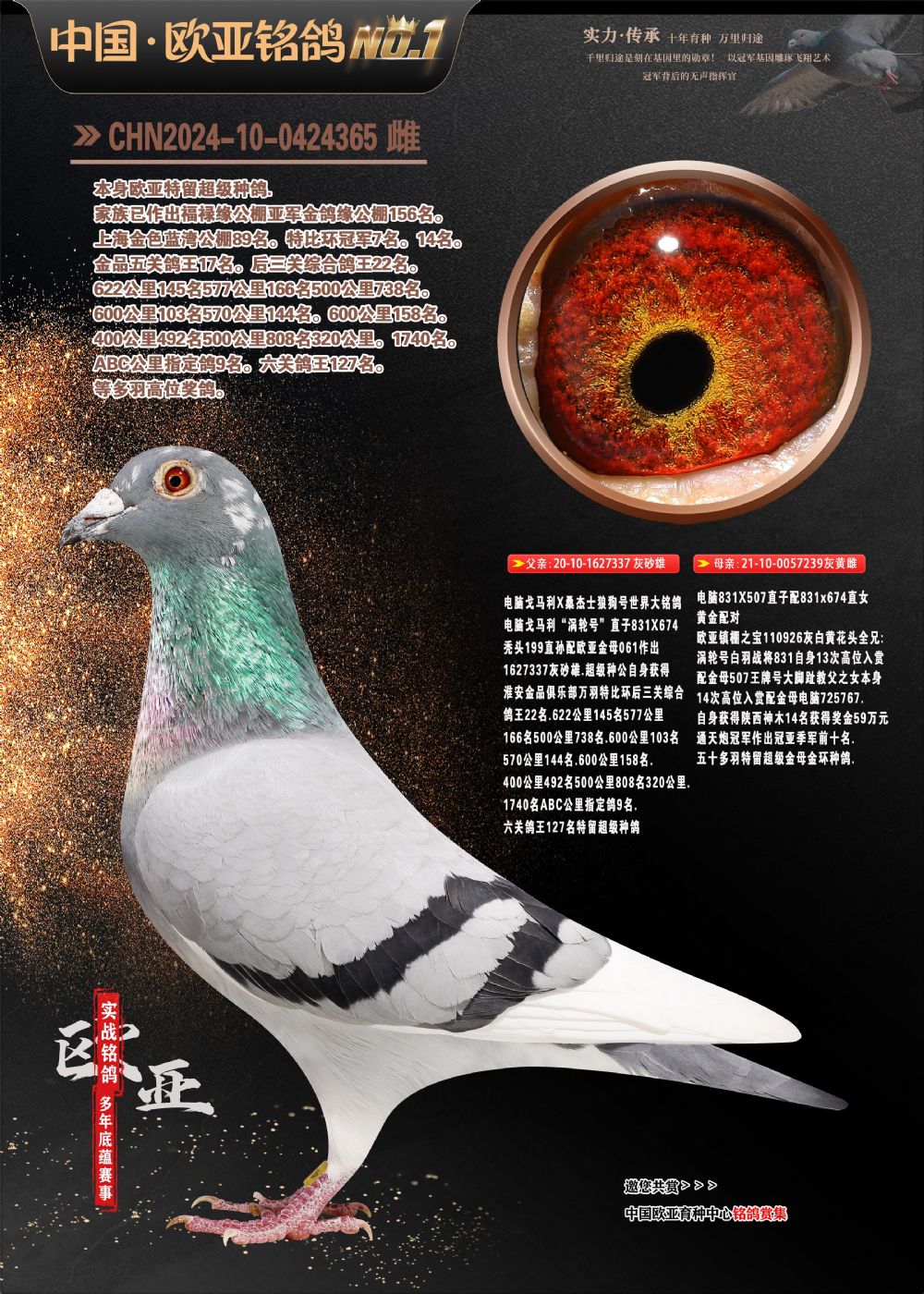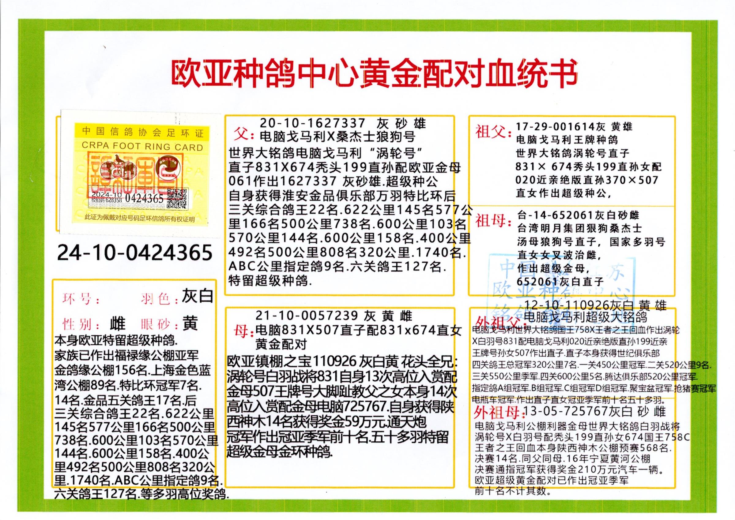 24年秋南京特比环欧亚荣获大团体冠军.小团体冠军551公里大特比13名.14名.16名.19名.20名.21名.24名.26名.27名.28名.42名.52名.54名.57名.65名.66名.68名.70名.71名.72名.74名.76名.80名.82名.83名.84名.85名.86名.90名.92名.110名.116名.121名.122名.128名.131名.158名.161名.164名.165名.166名.172名.174名.177名.182名.195名.196名.201名.205名.208名.210名.216名.253名.269名.275名.276名.294名.296名.299名,,24年秋云南天南铜都公棚决赛415名.天南铜都小棚决赛409名.云南玉活公棚决赛102名.490名.团体32名上笼二羽进二羽,天南铜都大棚506公里决赛445名。热烈祝贺河北省巨鹿县李兰生老师用欧亚泰山号血系连续十一年夺冠军,河北省国家赛冠军.全国季军等多次前十名高位,扬州王军王总用欧亚利奥24年春季获山东翔宇公棚决赛33名盖比53名。南京刘正龙刘总用欧亚盖比获得24年秋山东潍坊国际公棚决赛42名.精英赛30名.三关鸽王71名.决赛86名.加站赛16名.南京市特比环A组鸽王9名.B组鸽王5名.6名.C组鸽王5名.精英赛冠军4名.技能赛A组冠军4名.5名.秦淮区特比环荣获15名.46名.48名.87名。四川西昌徐亮徐总用欧亚利奥获得凉山州聚友决赛177名.第二关亚军双关鸽王19名.三关鸽王105名.云南豪庭公棚决赛603名。热烈祝贺24年四川重庆翔园鸽舍用欧亚泰山号荣获春季400公里冠军.秋季500公里冠军,河北王总用詹森X利奥获得千羽千翔公棚400公里冠军,广东蔡楷焕荣获24年秋爱好者 赛鸽俱乐部三关鸽王季军.一关420公里99名.二关450公里11名.三关520公里32名.单关季军.7名.12名,江西李卫兴荣获贵州红枫公棚8名.共翔俱乐部寄养棚四关综合鸽王30名.一关400公里78名.二关500公里55名.三关520公里37名.四关500公里57名.同父母获公棚18名.雷鸣获得武汉黄浦育翔中心冠军,四川陈文获得四川明鸿俱乐部300公里梦幻2名.3名.4名.9名.10名.13名.14名.15名.31名.34名.40名.41名.42名.43名.69名.71名.72名.73名.74名.94名.95名.97名.98名.99名.419公里决赛荣获总冠军7名.总共归巢9羽,四川徐亮获豪庭决赛603名,山西郑勇获得山西泰鑫公棚决赛255名詹森红狐,热烈祝贺马总获得开尔(飞跃队)决赛9名获奖金1310000万元.第一关52名,天津津福资赛180公里96名.获奖金429543万元,欧亚支持全国鸽友24年秋多人报喜 祝大家取得更好成绩,给欧亚报喜鸽友欧亚决定给每人赠送一羽超级种鸽。欧亚俱乐部特比环多关鸽王成绩:15年秋淮安特比环黑色星期一全会上笼9700多羽,当天无鸽归巢,第二天全会归巢357羽,本舍归巢158羽.前十名八羽.前一百名归巢57羽,16年春季获五关鸽王总冠军,总亚军四名.六名.七名.九名.十名.晶艺俱乐部520公里冠亚季军5名.6名.7名.9名.11名等,火车头冠军.季军6名.8名.9名.10名,16年秋晶艺俱乐部特比环520公里亚军.季军4名.6名.7名.9名,15年春南京白下特比环冠军.亚军.季军6名.7名.8名.9名.10名.指定鸽A B组获得冠军.亚军.季军4名.5名.,17年淮安特比环亚军.4名.5名.7名.8名.10名.六关鸽王总冠军.4名.6名.9名.10名,寄养棚宿迁刘总20羽特比环获冠军.季军.4名.7名.8名.9名等。18年荣获万羽特比环六关鸽王总冠军.总亚军.总季军.6名.8名.十名.单关四羽冠军.二羽亚军.四羽季军.前十名27羽。19年秋万羽特比环六关鸽王总亚军.总季军.5名.8名等,单关二羽冠军.三羽亚军.一羽季军前十名31羽。20年秋淮安市鸽会四关特比环大赛风雨无阻鸽王亚军.鸽王六名,金品俱乐部万羽特比环六关鸽王总冠军,总亚军.四名.五名.六名.七名.八名.十名.前二百名鸽王35羽,单关冠亚季军前十名四十多羽,火车头五关鸽王季军.六名.八名.前二百名鸽王十七羽。20年春荣获淮安五区一市四关鸽王总冠军.亚军.四名.八名.九名。21年秋荣获金品万羽特比环大赛六关鸽王总亚军.总季军.四名.七名.九名.十名.单关冠亚军季军前十名三十多羽。火车头协会鸽王六名.七名.十名.单关前十名十七羽。22年秋荣获鸽王总冠军.总亚军.5名.7名.8名.9名.11名.单关冠亚季军前十名三十多羽,第一关单关前二百名四十多羽,第二关前二百名三十多羽,第三关前二百名四十多羽,第四关前二百名四十多羽,第五关前一百名53羽。23年秋荣获鸽王季军.五名.八名.十名.13名.17名.20名.27名等多羽鸽王.单关前十名二十多羽。公棚.寄养棚部分成绩:16年秋宁夏黄河公棚总冠军电脑戈马力指定通炮冠军,17年送八羽参赛获得鸽王八名进奖四名,支持韩总荣获八名。支持鸽友荣获宁夏中卫公棚决赛总冠军.精英赛冠军,支持18年宁夏黄河公棚决赛冠军詹森X泰山。安徽鼎博寄养棚院内外四关鸽王总冠军.鸽王十七名.三十七名同窝,鸽王39名.42名.58名.67名。18年山东公棚预赛冠军.决赛65名.送八羽进奖五羽.指定获奔驰汽车一辆。支持鸽友获得云南蓝云公棚冠军.盖比X佛卡门。支持鸽友荣获云南银集公棚决赛冠军 詹森427X520血系 速度赛6700羽冠军。17年荣获金马俱乐部寄养棚四关鸽王总冠军.季军.六名.八名.第一关冠军.亚军.季军四名.七名.十一名.金牌教练奖。支持鸽友18年北京费翔公棚预赛九名电脑X桑杰士,支持鸽友荣获陕西威力公棚决赛11名.内蒙古临河寄养棚四关鸽王六名.詹森配泰山,支持河北王总用欧亚詹森427配胡本喜获20年秋开尔青年棚季军。云南东荣公棚16年预赛冠军.决赛77名.17年决赛12名.詹森红狐X泰山,17年平安公棚决赛4名 詹森427。欧亚获得21年金母寄养棚第一关四名.第二关5名.第三关5名.6名.7名.10名.三关鸽王总冠军,四关鸽王14名.十羽鸽王。支持河