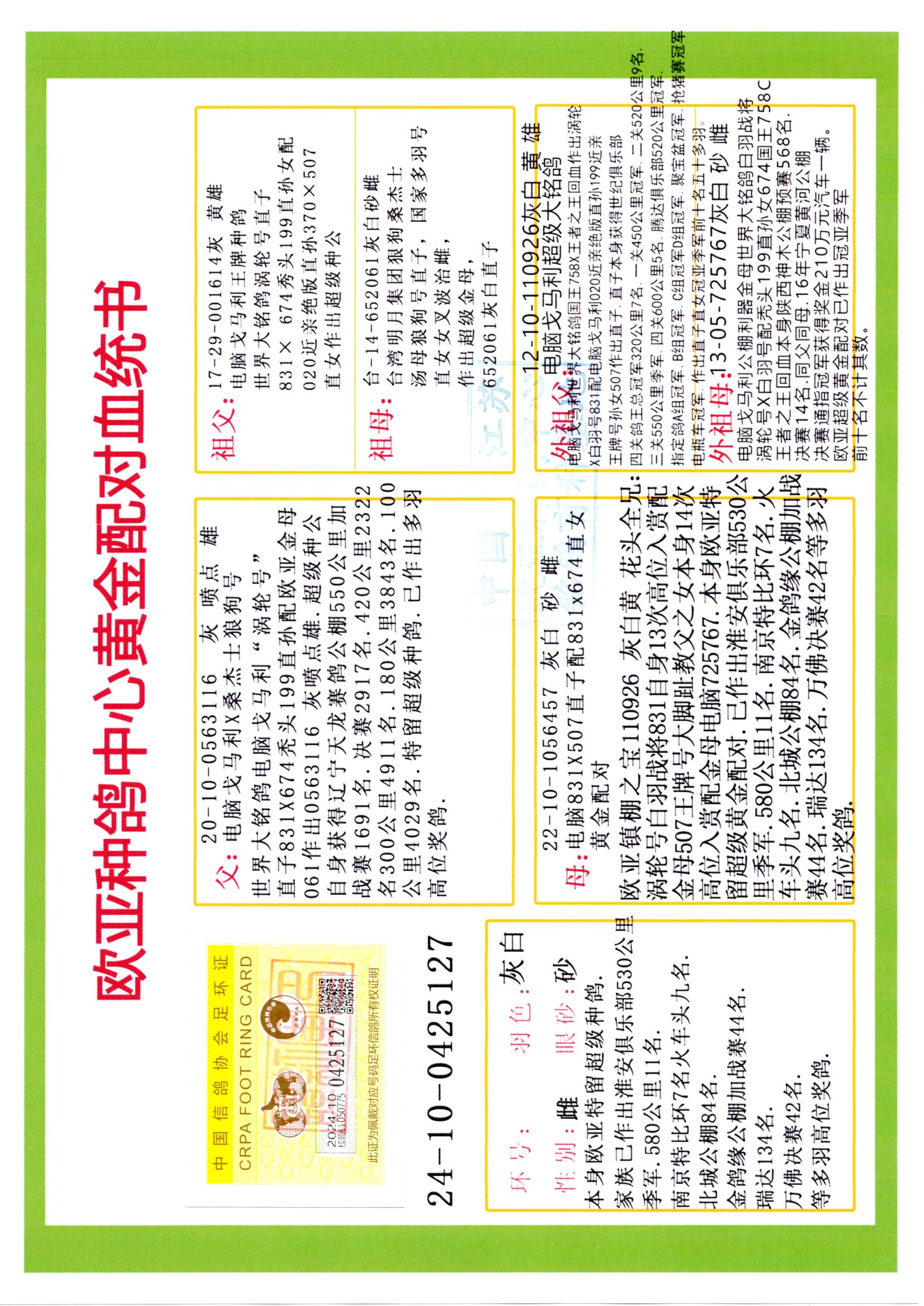 24年秋南京特比环欧亚荣获大团体冠军.小团体冠军551公里大特比13名.14名.16名.19名.20名.21名.24名.26名.27名.28名.42名.52名.54名.57名.65名.66名.68名.70名.71名.72名.74名.76名.80名.82名.83名.84名.85名.86名.90名.92名.110名.116名.121名.122名.128名.131名.158名.161名.164名.165名.166名.172名.174名.177名.182名.195名.196名.201名.205名.208名.210名.216名.253名.269名.275名.276名.294名.296名.299名,,24年秋云南天南铜都公棚决赛415名.天南铜都小棚决赛409名.云南玉活公棚决赛102名.490名.团体32名上笼二羽进二羽,天南铜都大棚506公里决赛445名。热烈祝贺河北省巨鹿县李兰生老师用欧亚泰山号血系连续十一年夺冠军,河北省国家赛冠军.全国季军等多次前十名高位,扬州王军王总用欧亚利奥24年春季获山东翔宇公棚决赛33名盖比53名。南京刘正龙刘总用欧亚盖比获得24年秋山东潍坊国际公棚决赛42名.精英赛30名.三关鸽王71名.决赛86名.加站赛16名.南京市特比环A组鸽王9名.B组鸽王5名.6名.C组鸽王5名.精英赛冠军4名.技能赛A组冠军4名.5名.秦淮区特比环荣获15名.46名.48名.87名。四川西昌徐亮徐总用欧亚利奥获得凉山州聚友决赛177名.第二关亚军双关鸽王19名.三关鸽王105名.云南豪庭公棚决赛603名。热烈祝贺24年四川重庆翔园鸽舍用欧亚泰山号荣获春季400公里冠军.秋季500公里冠军,河北王总用詹森X利奥获得千羽千翔公棚400公里冠军,广东蔡楷焕荣获24年秋爱好者 赛鸽俱乐部三关鸽王季军.一关420公里99名.二关450公里11名.三关520公里32名.单关季军.7名.12名,江西李卫兴荣获贵州红枫公棚8名.共翔俱乐部寄养棚四关综合鸽王30名.一关400公里78名.二关500公里55名.三关520公里37名.四关500公里57名.同父母获公棚18名.雷鸣获得武汉黄浦育翔中心冠军,四川陈文获得四川明鸿俱乐部300公里梦幻2名.3名.4名.9名.10名.13名.14名.15名.31名.34名.40名.41名.42名.43名.69名.71名.72名.73名.74名.94名.95名.97名.98名.99名.419公里决赛荣获总冠军7名.总共归巢9羽,四川徐亮获豪庭决赛603名,山西郑勇获得山西泰鑫公棚决赛255名詹森红狐,热烈祝贺马总获得开尔(飞跃队)决赛9名获奖金1310000万元.第一关52名,天津津福资赛180公里96名.获奖金429543万元,欧亚支持全国鸽友24年秋多人报喜 祝大家取得更好成绩,给欧亚报喜鸽友欧亚决定给每人赠送一羽超级种鸽。欧亚俱乐部特比环多关鸽王成绩:15年秋淮安特比环黑色星期一全会上笼9700多羽,当天无鸽归巢,第二天全会归巢357羽,本舍归巢158羽.前十名八羽.前一百名归巢57羽,16年春季获五关鸽王总冠军,总亚军四名.六名.七名.九名.十名.晶艺俱乐部520公里冠亚季军5名.6名.7名.9名.11名等,火车头冠军.季军6名.8名.9名.10名,16年秋晶艺俱乐部特比环520公里亚军.季军4名.6名.7名.9名,15年春南京白下特比环冠军.亚军.季军6名.7名.8名.9名.10名.指定鸽A B组获得冠军.亚军.季军4名.5名.,17年淮安特比环亚军.4名.5名.7名.8名.10名.六关鸽王总冠军.4名.6名.9名.10名,寄养棚宿迁刘总20羽特比环获冠军.季军.4名.7名.8名.9名等。18年荣获万羽特比环六关鸽王总冠军.总亚军.总季军.6名.8名.十名.单关四羽冠军.二羽亚军.四羽季军.前十名27羽。19年秋万羽特比环六关鸽王总亚军.总季军.5名.8名等,单关二羽冠军.三羽亚军.一羽季军前十名31羽。20年秋淮安市鸽会四关特比环大赛风雨无阻鸽王亚军.鸽王六名,金品俱乐部万羽特比环六关鸽王总冠军,总亚军.四名.五名.六名.七名.八名.十名.前二百名鸽王35羽,单关冠亚季军前十名四十多羽,火车头五关鸽王季军.六名.八名.前二百名鸽王十七羽。20年春荣获淮安五区一市四关鸽王总冠军.亚军.四名.八名.九名。21年秋荣获金品万羽特比环大赛六关鸽王总亚军.总季军.四名.七名.九名.十名.单关冠亚军季军前十名三十多羽。火车头协会鸽王六名.七名.十名.单关前十名十七羽。22年秋荣获鸽王总冠军.总亚军.5名.7名.8名.9名.11名.单关冠亚季军前十名三十多羽,第一关单关前二百名四十多羽,第二关前二百名三十多羽,第三关前二百名四十多羽,第四关前二百名四十多羽,第五关前一百名53羽。23年秋荣获鸽王季军.五名.八名.十名.13名.17名.20名.27名等多羽鸽王.单关前十名二十多羽。公棚.寄养棚部分成绩:16年秋宁夏黄河公棚总冠军电脑戈马力指定通炮冠军,17年送八羽参赛获得鸽王八名进奖四名,支持韩总荣获八名。支持鸽友荣获宁夏中卫公棚决赛总冠军.精英赛冠军,支持18年宁夏黄河公棚决赛冠军詹森X泰山。安徽鼎博寄养棚院内外四关鸽王总冠军.鸽王十七名.三十七名同窝,鸽王39名.42名.58名.67名。18年山东公棚预赛冠军.决赛65名.送八羽进奖五羽.指定获奔驰汽车一辆。支持鸽友获得云南蓝云公棚冠军.盖比X佛卡门。支持鸽友荣获云南银集公棚决赛冠军 詹森427X520血系 速度赛6700羽冠军。17年荣获金马俱乐部寄养棚四关鸽王总冠军.季军.六名.八名.第一关冠军.亚军.季军四名.七名.十一名.金牌教练奖。支持鸽友18年北京费翔公棚预赛九名电脑X桑杰士,支持鸽友荣获陕西威力公棚决赛11名.内蒙古临河寄养棚四关鸽王六名.詹森配泰山,支持河北王总用欧亚詹森427配胡本喜获20年秋开尔青年棚季军。云南东荣公棚16年预赛冠军.决赛77名.17年决赛12名.詹森红狐X泰山,17年平安公棚决赛4名 詹森427。欧亚获得21年金母寄养棚第一关四名.第二关5名.第三关5名.6名.7名.10名.三关鸽王总冠军,四关鸽王14名.十羽鸽王。支持河