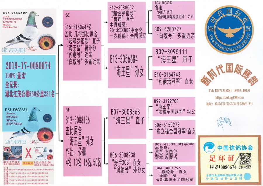 本鸽B12-3088156 配 佛卡门B09-6248061作出:2014年武汉博达公棚秋决赛354名
