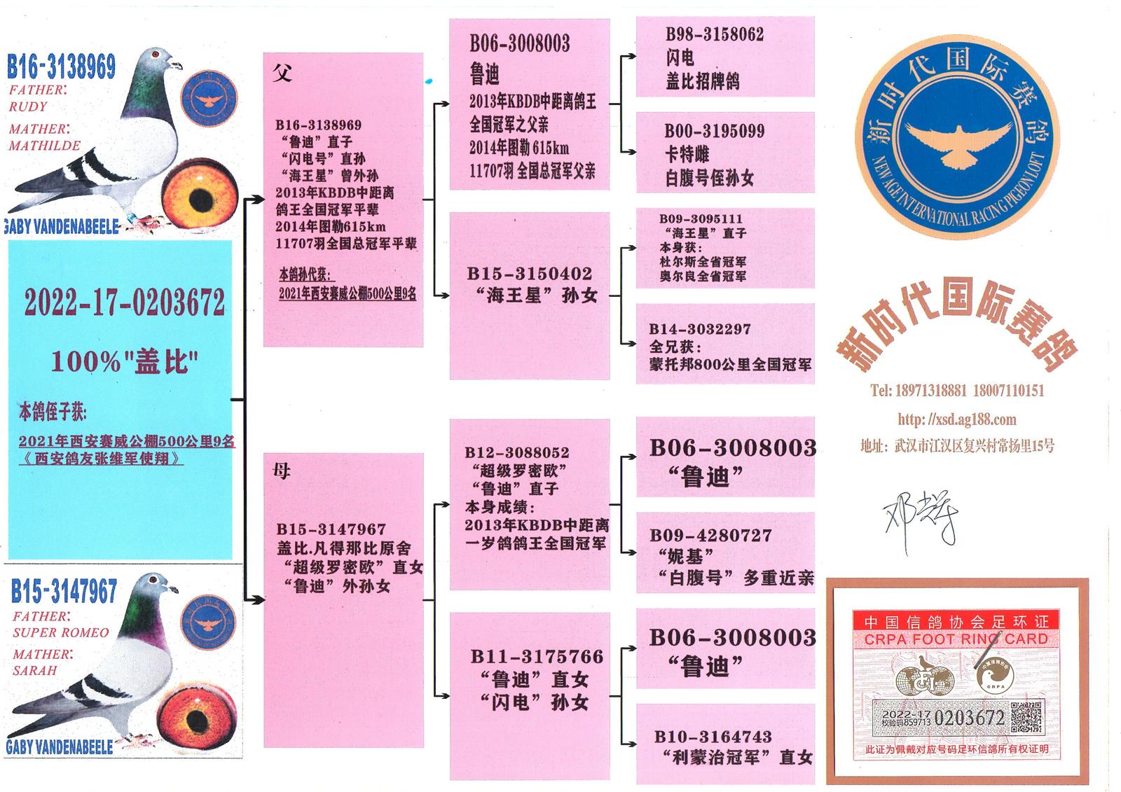 比利时赛鸽教父盖比,一岁鸽B13-3056024,勇夺一岁鸽冠军,11707羽总冠军!此鸽于当天下午14点37分57秒归巢,空距为614.934公里,分速为1342.8米/分。