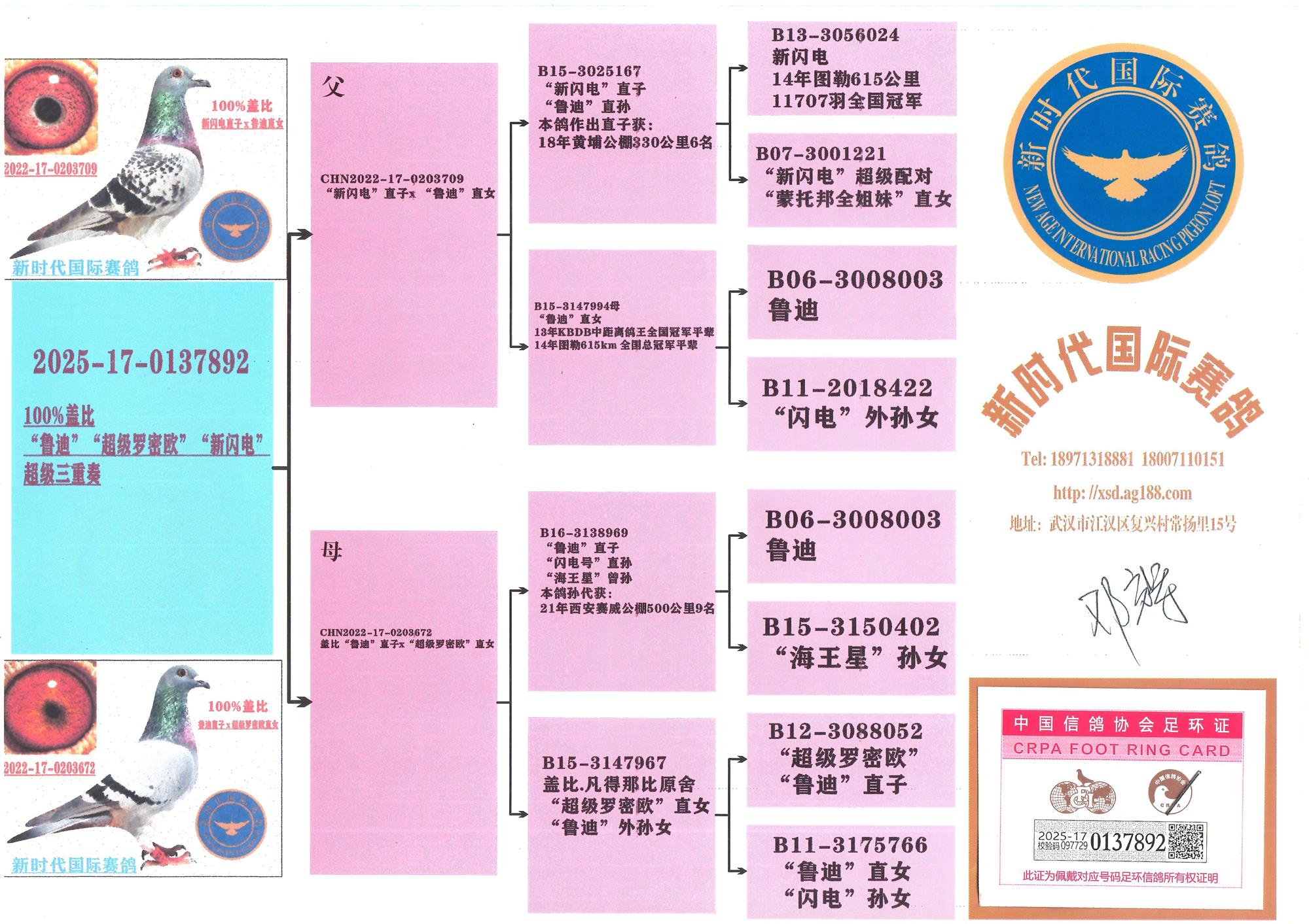 冠军鸽父亲“鲁迪”是闪电号直子,本身也是实力不凡的成绩鸽,而且其另外一羽直子“超级罗密欧”已经获2013年KBDB中距离一岁鸽鸽王冠军,显示“鲁迪”实力不逊父亲“闪电号”!冠军鸽母亲是“闪电号”外孙女。
