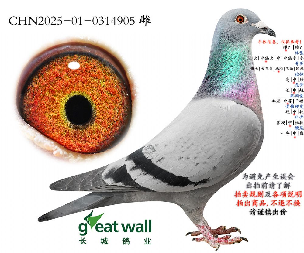 因拍卖鸽均是未做育过的种鸽或幼鸽,图内所标雌雄仅供参考,实际性别已实物为准。不做退换理由。