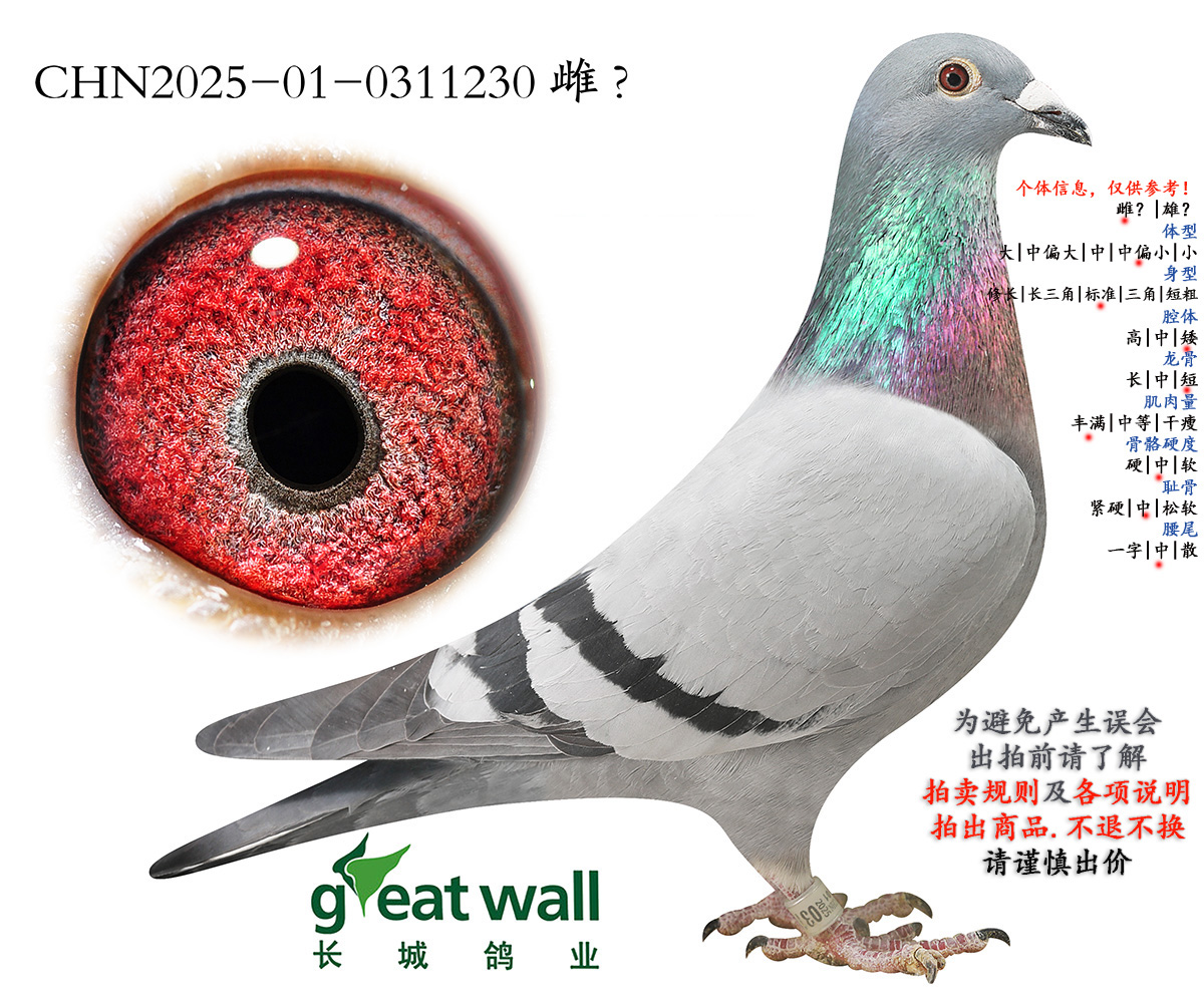 因拍卖鸽均是未做育过的种鸽或幼鸽,图内所标雌雄仅供参考,实际性别已实物为准。不做退换理由。
