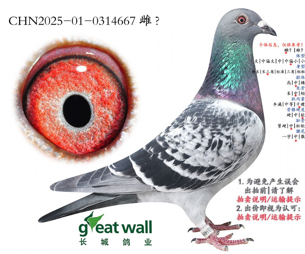 因拍卖鸽均是未做育过的种鸽或幼鸽,图内所标雌雄仅供参考,实际性别已实物为准。不做退换理由。